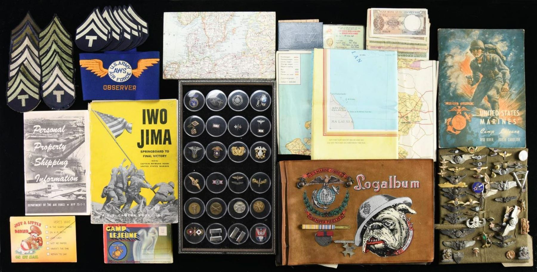 MEDALS, & MORE FROM WWI TO THE PRESENT. This very interesting & diverse group includes 8 full size WWII era wings of various classifications. / 12 Small WWII era wings of various classifications. / 20+ Pieces of military & commemorative insignia from WWII & after. / 1 WWI 71st Division DI. / 2 First Air Force DI's. / 1 Small group of Vietnamese currency. / 1 NVA female's identification card. / 1 WWII Marine Corps scrapbook with various pictures of Marine Corps life belonging to Albert Franklin, USMCR. / 2 Army Good Conduct Medals. / 1 WWII Victory Medal. / 1 American Campaign Medal. / 1 Spanish American War Service Medal. / 2 Women's Relief Corps Medals. / 1 South Vietnamese MP armband. / 1 Red Cross armband. / 2 Packages of replacement goggle lenses. / 1 Eyeglass case. / 1 POW bracelet. / 1 Spits in original box for roasting meat. / 2 Survival fishing kits. / 1 Survival flexible saw. / 2 WWII era booklets. / 1 Postcard book from Camp Lejeune. / 5 Maps. / 1 Book of Army postcards. / 1 Ziplock bag containing approx. 20 NVA medals, pins, & badges. / 1 Ziplock bag containing approx. 20 Sergeant stripes, a cloth navigational map, & an observer's armband. / 3 South Vietnamese Officer's belt buckles. / 1 Large Ziplock bag with a huge variety of military insignia & related material, dating from WWII through the Vietnam War. / 1 Small group of military rank & unit patches. CONDITION: as expected, condition varies widely on this lot; however, most items show light to moderate wear & are complete, as described. (02-20944/BF). $800-1,200.