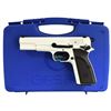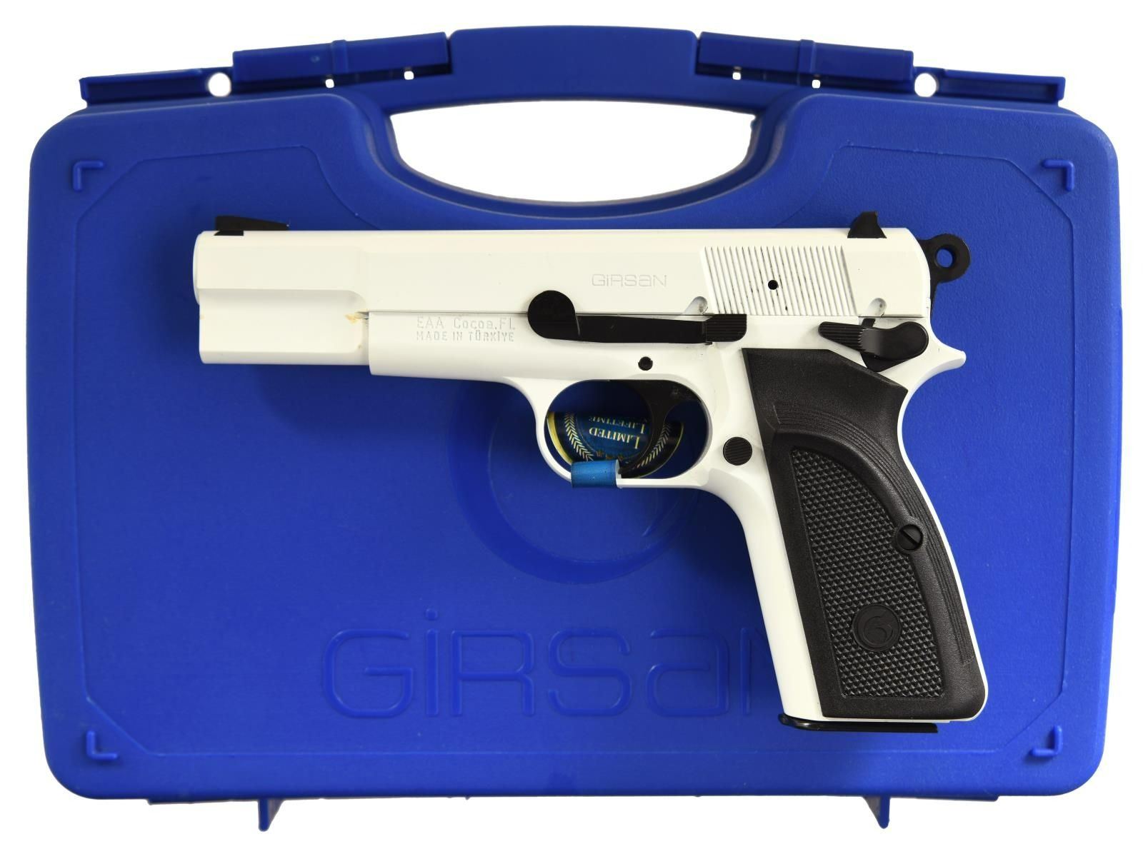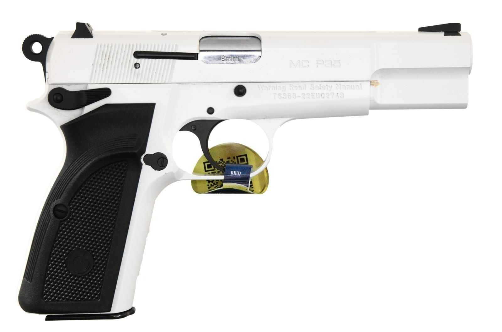 Cal. 9mm. S# T6368-22EU02743. Bbl. 4 5/8". Ramped blade front sight w/ white insert. White outline rear sight. Turkish made Hi Power clone imported by EAA. Ambi safety. White finish. Finger groove rubber grips. MAGS: 1-15 rd. Mec Gar mfg. UNATTACHED ACCESSORIES: factory hardcase matching numbered to gun w/ foam inserts, bore brush, cleaning rod, manual & cable lock. CONDITION: metal shows some light staining & handling marks. Other aspects near excellent. PROVENANCE: The Collection of Gun Sport Ltd owned by Jon R. Thomas. (23-2849/MJC). MODERN. $400-600.