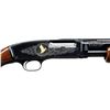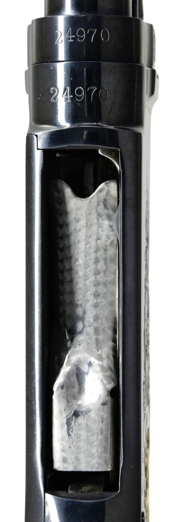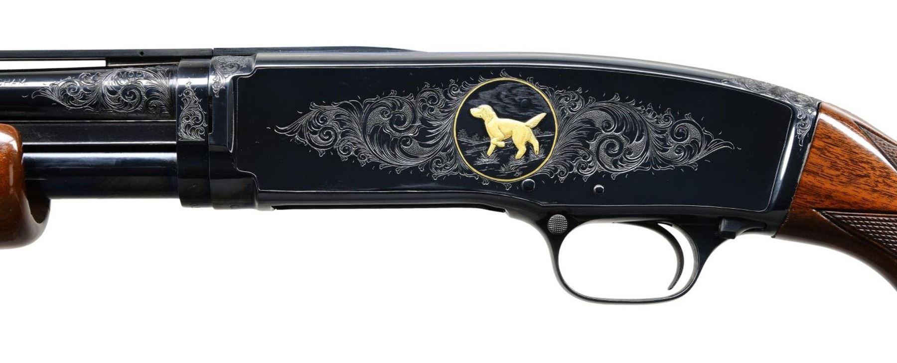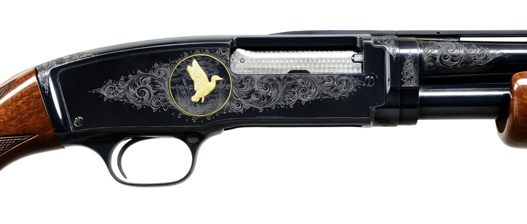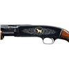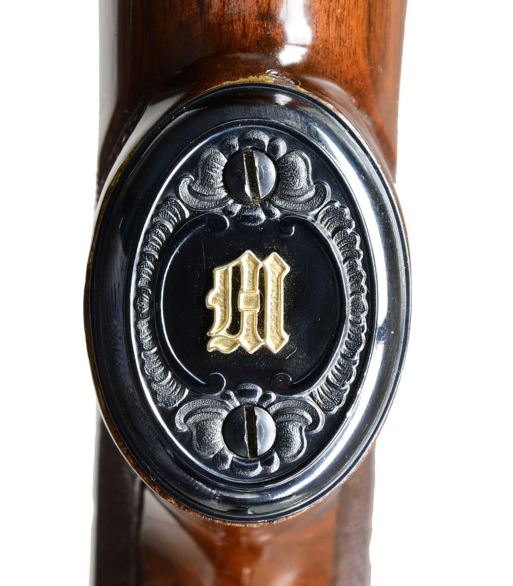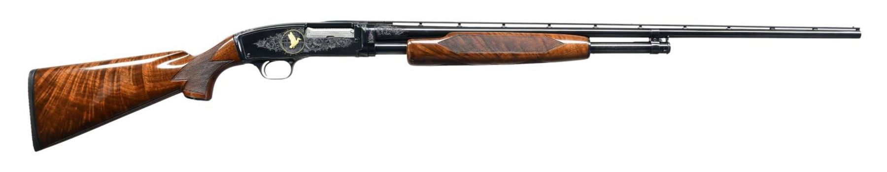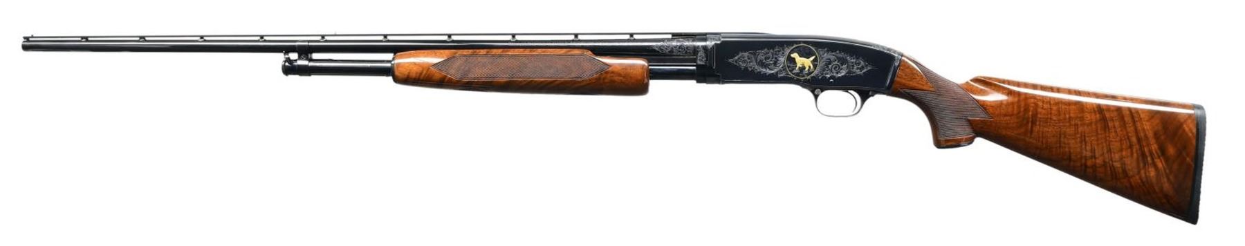 Cal. 410, 3". S# 24970. Bbl. 28" with small round post vent rib and fixed mod choke. Brass front and mid beads. Action engraving by Glen Hartliep similar to the Winchester 12-1 pattern. Glen Hartliep is the son of the late Master Engraver and former NRA instructor Neil Hartliep. Right side of action has a gold bordered vignette featuring a raised gold mallard. Left side vignette features a raised gold setter. Scenes are surrounded by vine type foliate scroll w/ punch dot backgrounds that extends to upper receiver areas along w/ receiver extension and breech end of barrel. Machine jeweled bolt and carrier. Custom beavertail forearm & pistol grip stock of fancy black walnut gloss over finish and pigeon grade style and checkering. Screw attached metal grip cap is marked with gold initials. LOP: 14" over a thin black Pachmayr Presentation pad. Mfg. 1937. CONDITION: fine as upgraded, retaining 98% brightly polished reblued finish. Stocks have very good gloss finish. Very good bore. (24-1979/DS). CURIO. $6,000-9,000.