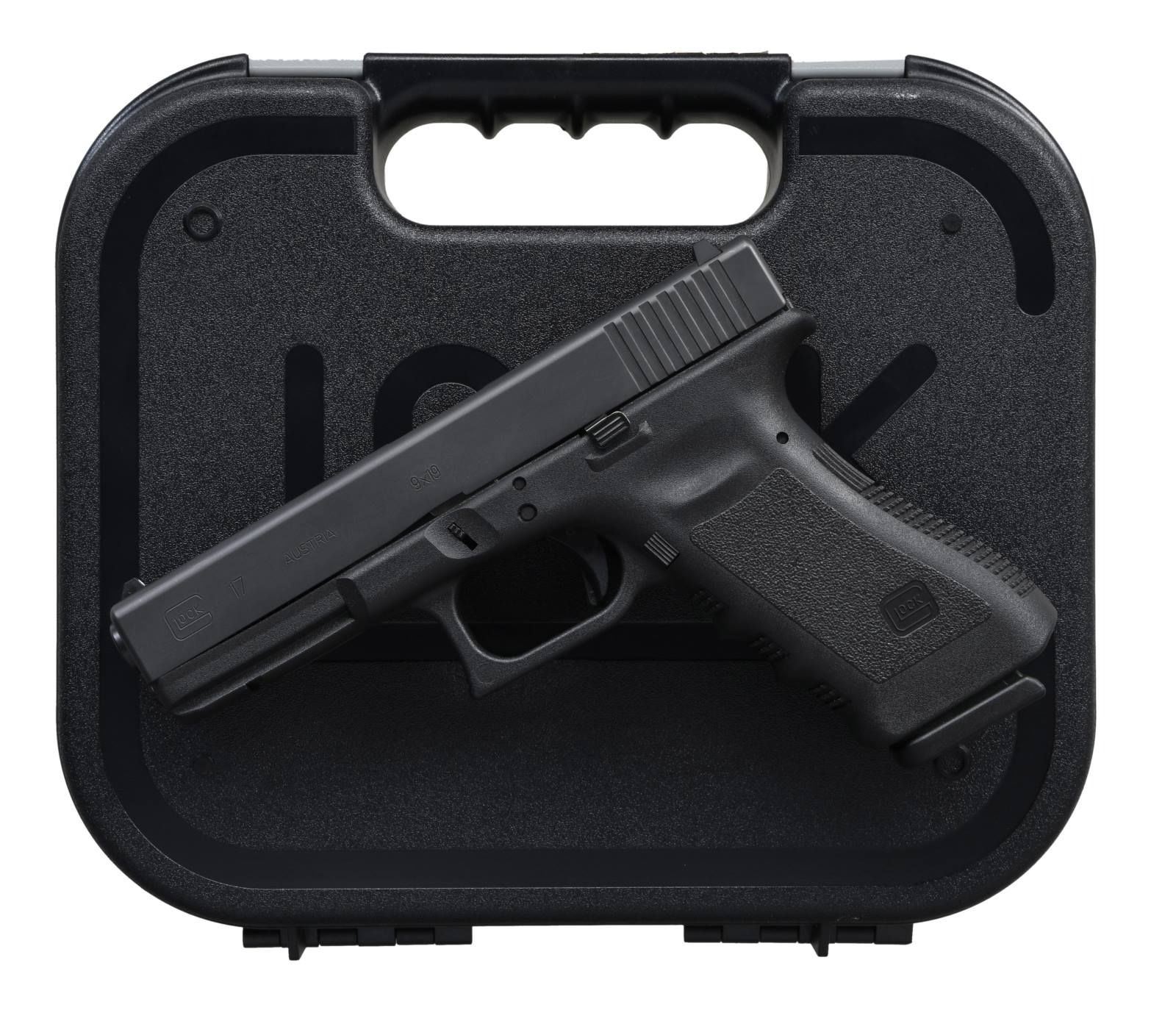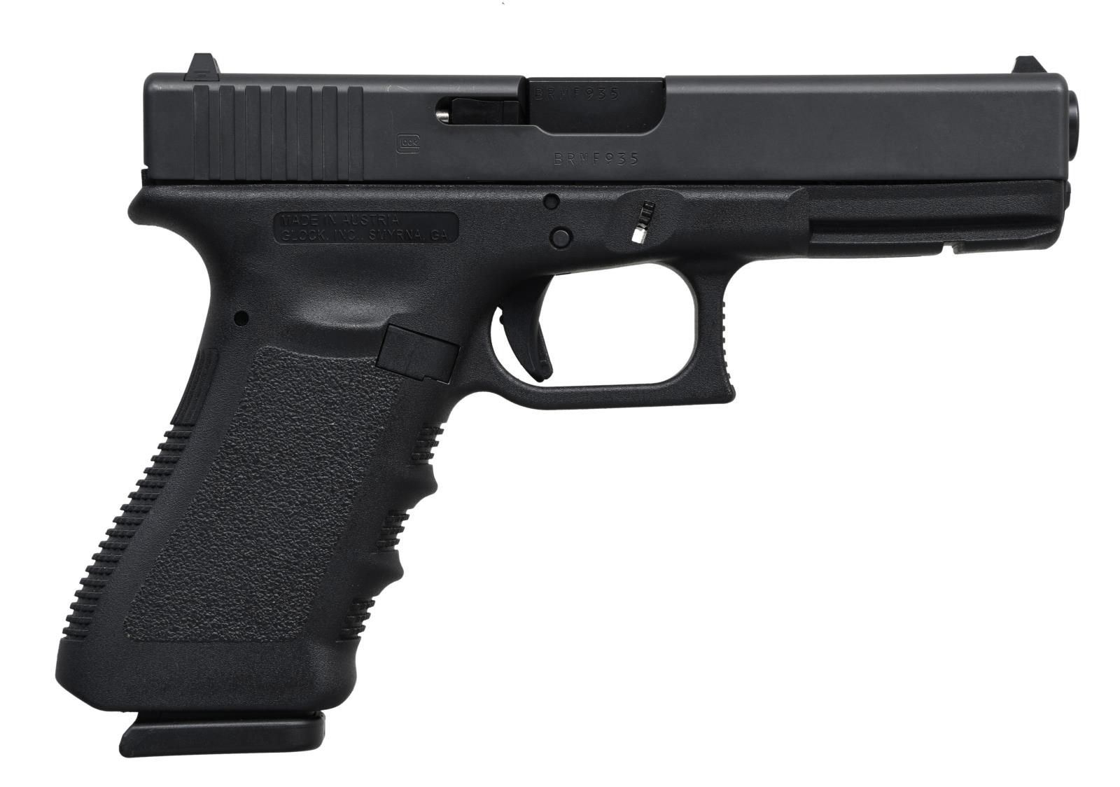 Cal. 9mm. S# BRMF935. Bbl. 4 3/4". Standard white outline Glock sights. Austrian made Gen3 Glock 17 pistol. Matte black slide w/ rear serrations. Black polymer frame w/ finger grooves & accessory rail. MAGS: 1-17 rd. factory. UNATTACHED ACCESSORIES: w/box. CONDITION: slide shows some light scratches. Other aspects near excellent. PROVENANCE: The Collection of Gun Sport Ltd owned by Jon R. Thomas. (23-4147/MJC). MODERN. $350-500.