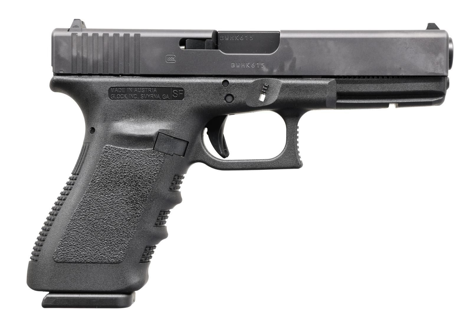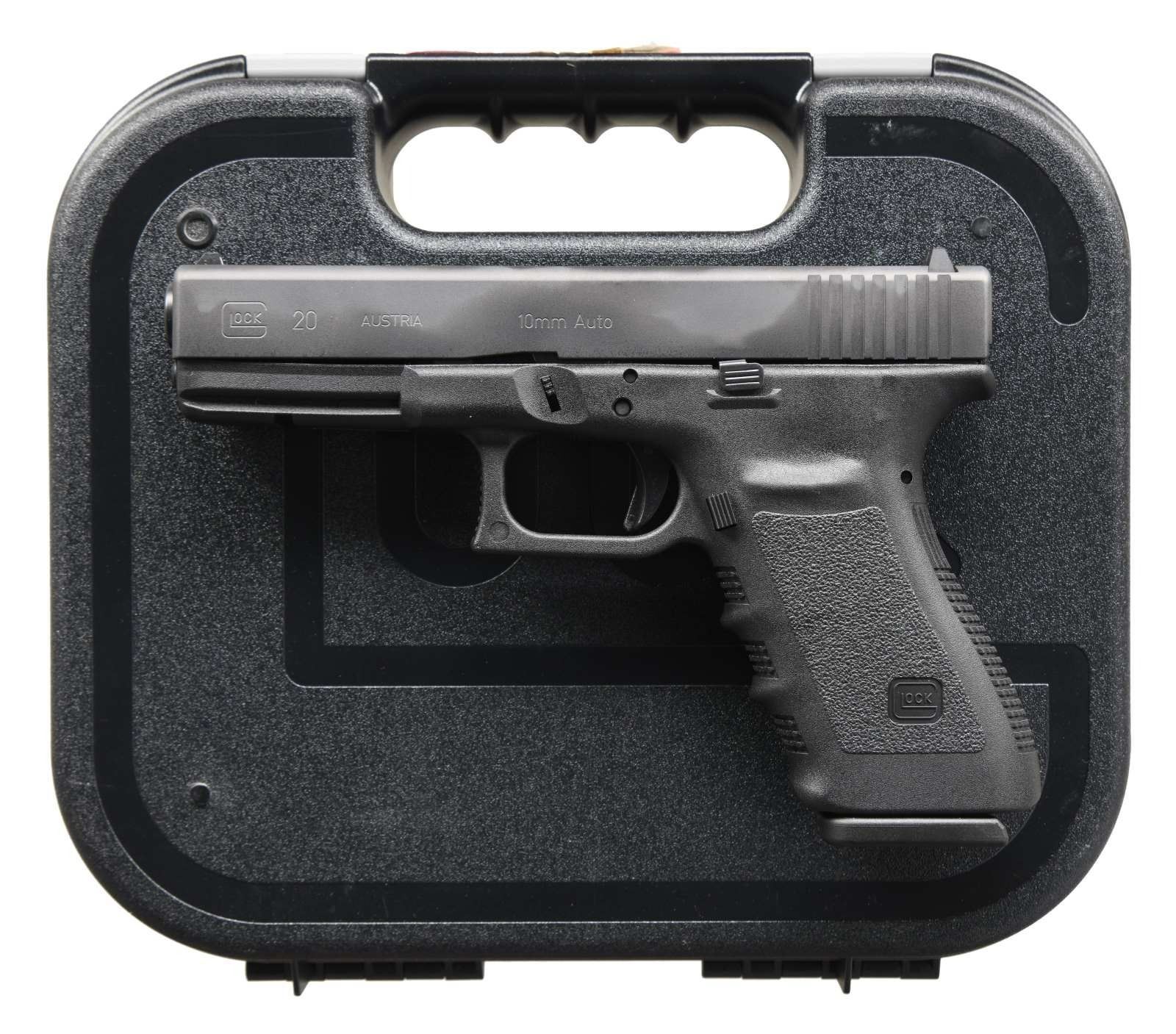 Cal. 10mm. S# BWHK615. Bbl. 5". Standard white outline Glock sights. Matte black slide w/ rear serrations. Polymer short frame w/ finger grooves & accessory rail. MAGS: 2-15 rd. factory. UNATTACHED ACCESSORIES: matching numbered factory hardcase, foam inserts, bore brush, mag loader, cable lock & paperwork. CONDITION: slide shows several patches of discoloration from oil staining but may clean up. Other aspects rate very good plus or better. PROVENANCE: The Collection of Gun Sport Ltd owned by Jon R. Thomas. PROVENANCE: The Collection of Gun Sport Ltd owned by Jon R. Thomas. (23-2910/MJC). MODERN. $350-500.