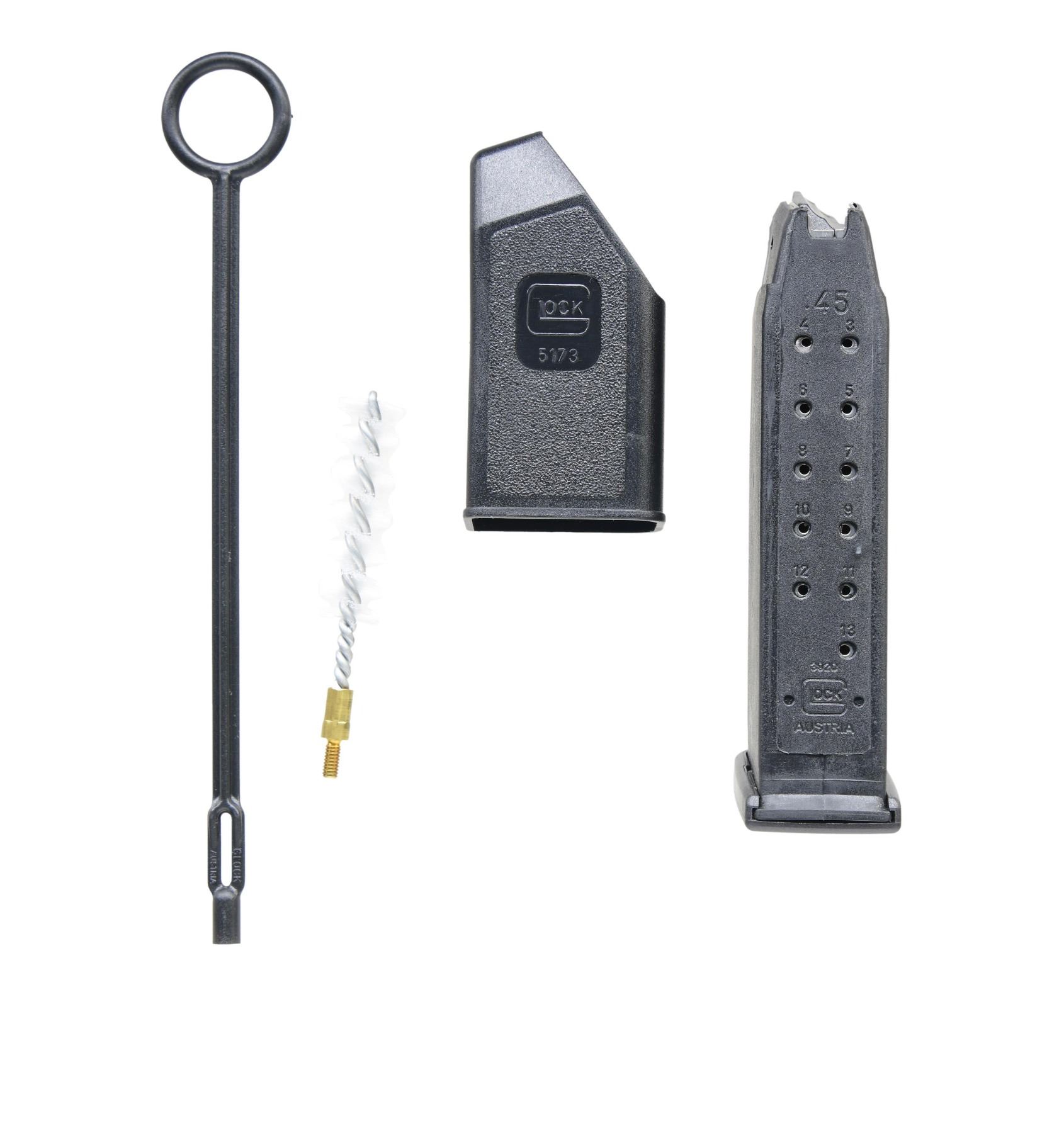 Cal. 45 ACP S# AYH580US. Bbl. 4.6", with fixed front and rear sights. The Glock 21 is a semi-auto pistol with a polymer frame and matte black finish. The frame has a slide release and magazine release on the left side. MAGS: two 13-rd. UNATTACHED ACCESSORIES: factory box, speed loader, cleaning rod, and brush. CONDITION: excellent overall, with approximately 98% of the original finish remaining on the slide and frame. Bore is bright with strong rifling. PROVENANCE: the lifelong collection of Terrence McCarty. (24-169/MD). MODERN. $300-$500.