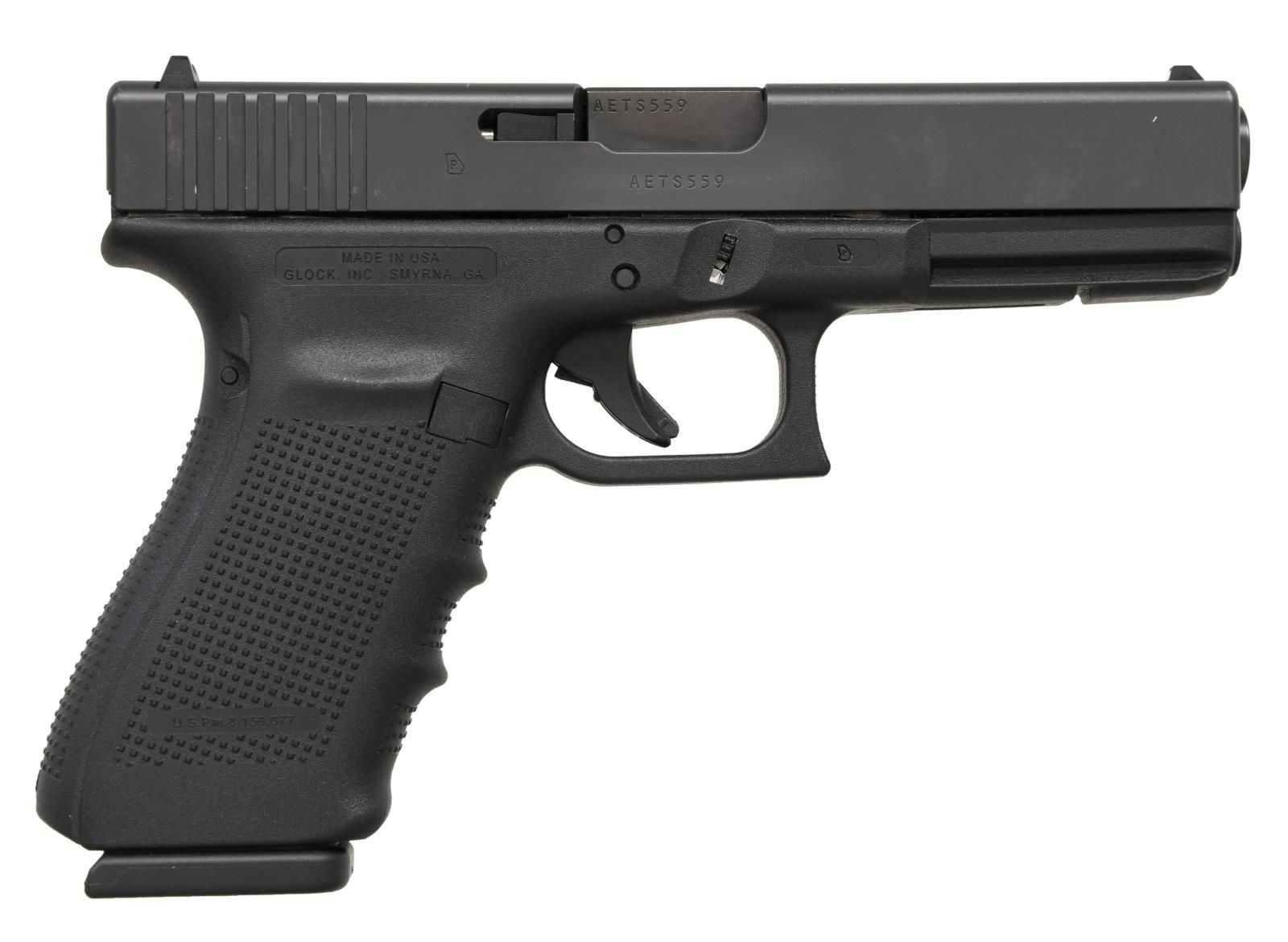 Cal. 45 ACP. S# AETS559. Bbl. 4 3/4". Standard white outline Glock sights. USA made Gen4 Glock 21. Matte black finish slide w/ rear serrations. Enlarged mag release. Black polymer frame w/ finger grooves & accessory rail. MAGS: 1-13 rd. factory. UNATTACHED ACCESSORIES: w/ box. CONDITION: slide shows some oil staining & light scratches. Other aspects near excellent. PROVENANCE: The Collection of Gun Sport Ltd owned by Jon R. Thomas. (23-4178/MJC). MODERN. $450-650.