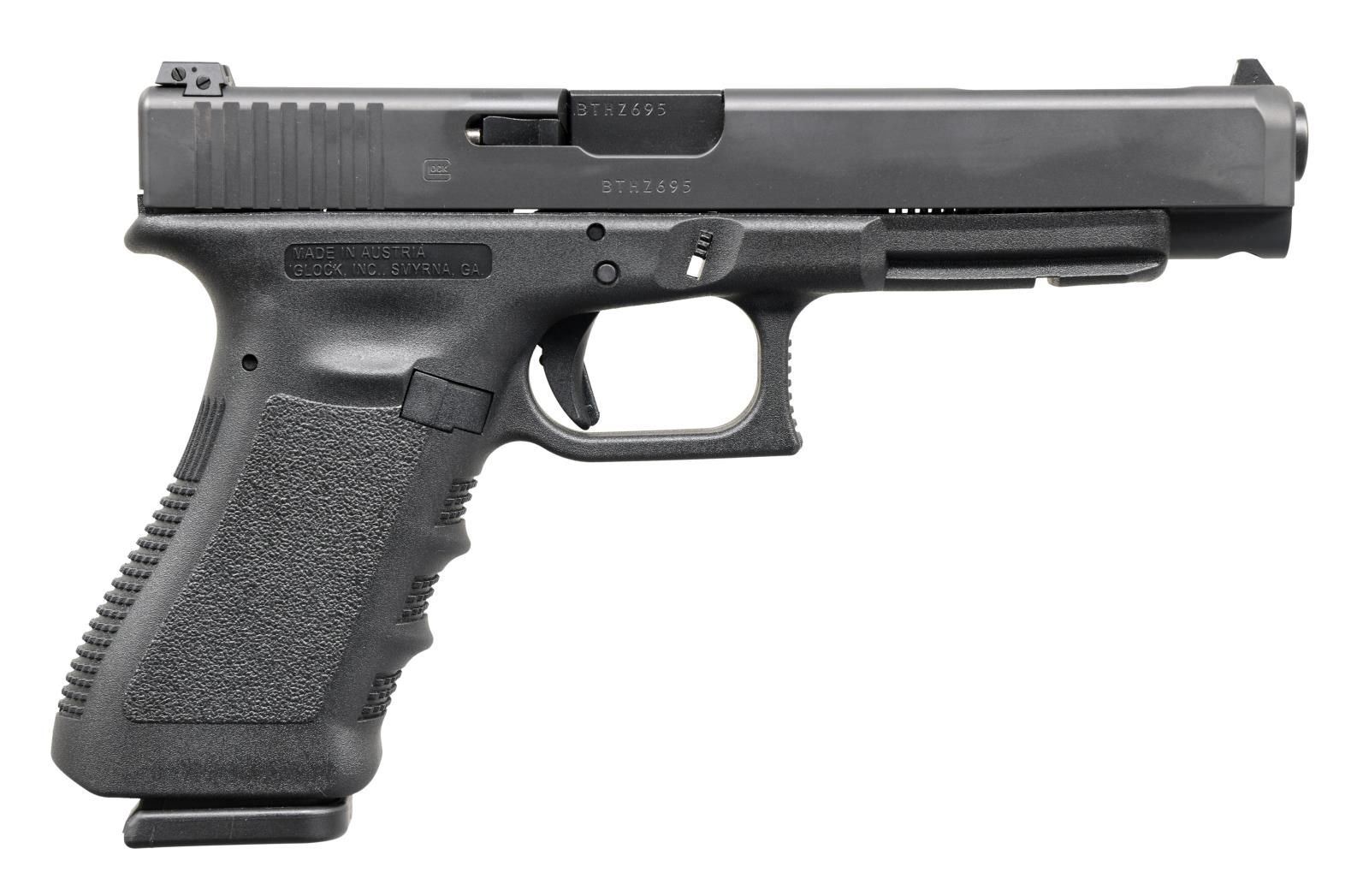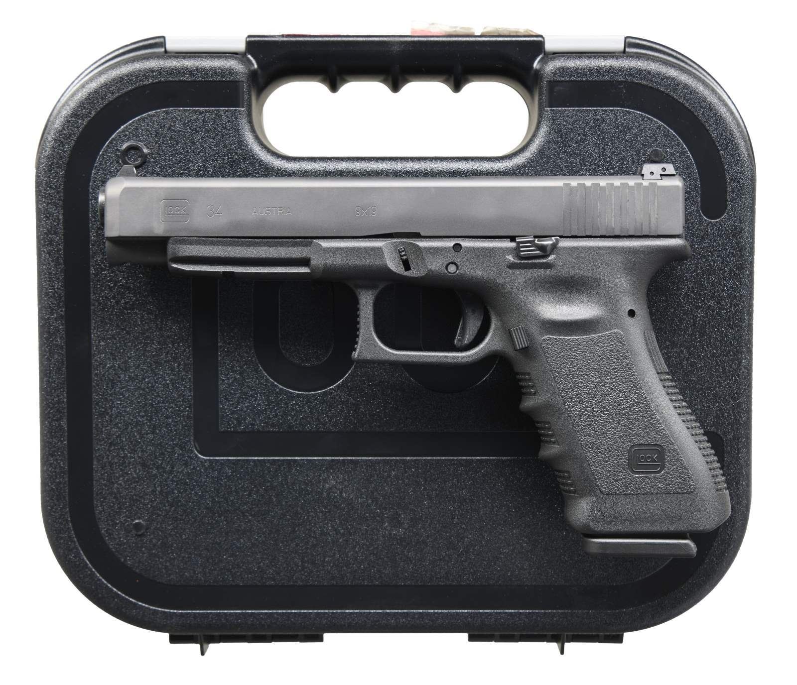 Cal. 9mm Luger. S# BTHZ695. Bbl. 5 1/3". White outline Glock sights with adjustable rear. Gen 3 Glock 34. Matte black finish. Black polymer frame with accessory rail. MAGS: two 17 rd. UNATTACHED ACCESSORIES: matching numbered factory hardcase with mag. loader, cable lock, manual, and cleaning rod. CONDITION: all aspects are near new; in the box. PROVENANCE: collection of Gun Sport Ltd., owned by Jon R. Thomas. (23-4622/MJC). MODERN. $300-500.