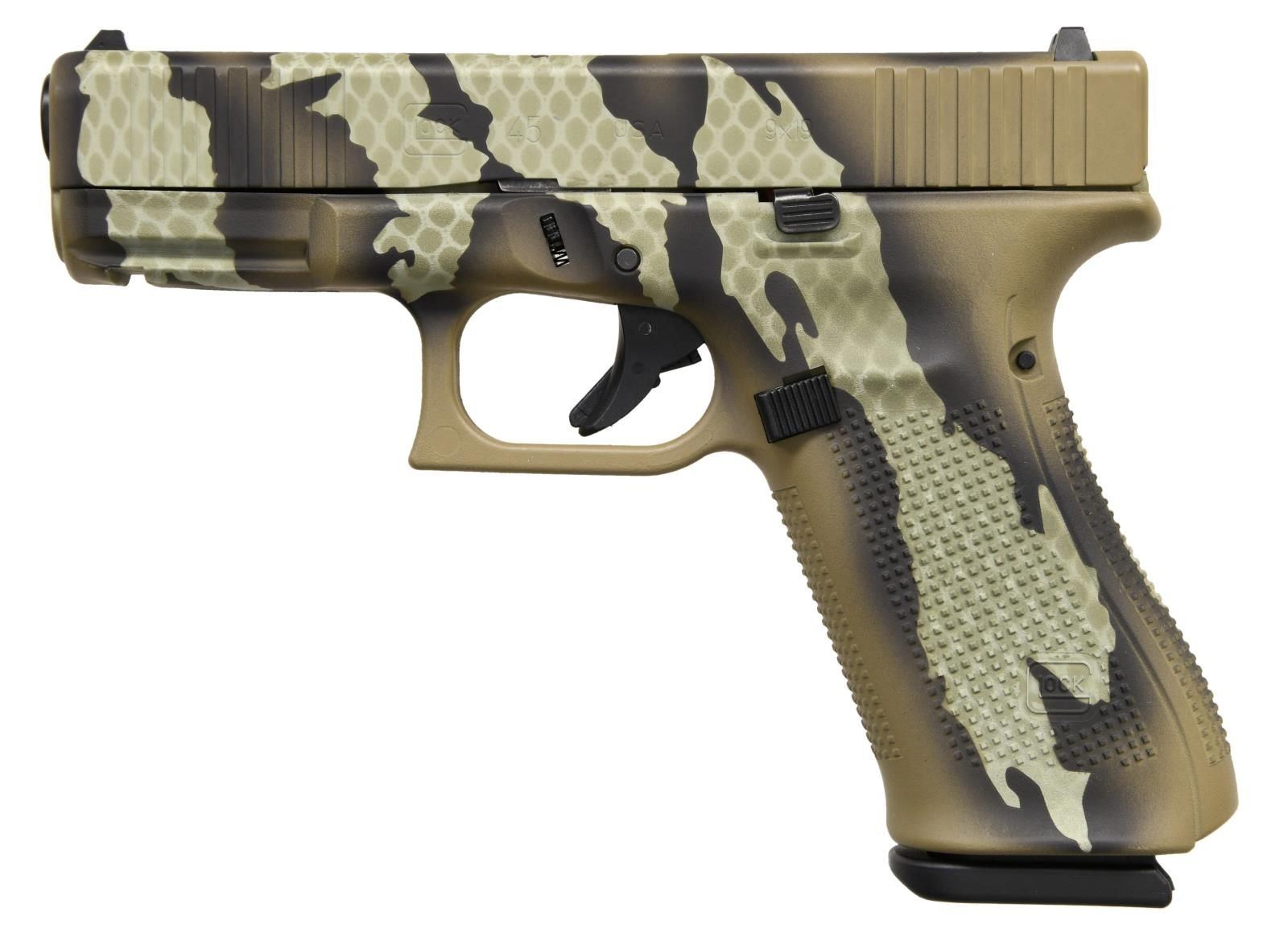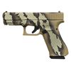 Cal. 9mm Luger. S# AFHP200. Bbl. 4". Standard white outline Glock sights. Riptile camoflauge finish on the side and frame. Slide has front and rear serrations. Ambi slide release. Enlarged mag. release. Polymer frame with accessory rail. MAGS: 1-17 rd. factory. UNATTACHED ACCESSORIES: with box. CONDITION: all aspects are near excellent. PROVENANCE: the collection of Gun Sport Ltd., owned by Jon R. Thomas. (23-4626/MJC). MODERN. $300-500.