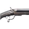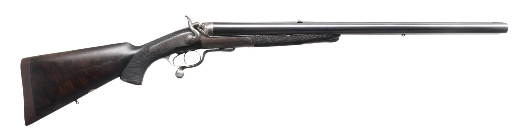 HOLLAND. Cal. 10 Ga. 3-1/4". S# 7776 (1884). The 25" dovetailed barrels are fitted with slightly raised matted rib holding wide bar rear sight and flip up bead front (small bead broken off). Top of right barrel is engraved with Holland & Holland New Bond St. address and top of left "Winners of all the "Field" rifle trials London 1883". Barrel flats are stamped with London black powder proofs for 11 Ga. Round bodied Jones under lever action with peninsula back spring rebounding locks having round bodied serpentine hammers; also features long top strap that extends over top of comb, dolls head third fastener and double triggers. Action is engraved with line borders and maker's name is on each lockplate. Left side of action is engraved "Charge 8 Drams Case 3 1/4 Inches". S# is on trigger guard tang which extends to horn grip cap. Pistol grip buttstock of dense stump figured European walnut measures 14" over replacement solid brown pad. Stock also features shadow line right hand cheekpiece, point pattern grip checkering and a vacant silver oval on toeline which is also fitted with sling eye. Matching splinter forend has forward pivoting lever release. MEASUREMENTS: STOCK: DAH: approx. 3-1/4". DAC: approx. 1-7/8". CAST: neutral. LOP: 14". WEIGHT: 13 lb. 3 oz. UNATTACHED ACCESSORIES: 2012 invoice & import paperwork. CONDITION: good as partially restored. Barrels retaining nearly all of a re-blue over some fairly deep pits noted on rib. Action and locks retain traces of original case hardening color. Stocks are refinished with some loss of definition; checkering re-cut. Bores are fine to very fine; shiny with sharp strong rifling throughout. Action is tight. Locks are very fine. Stocks are sound without any noted problems except wood is somewhat under metal along top tang. (01-25458/MGM). ANTIQUE. $9,000-13,000.