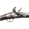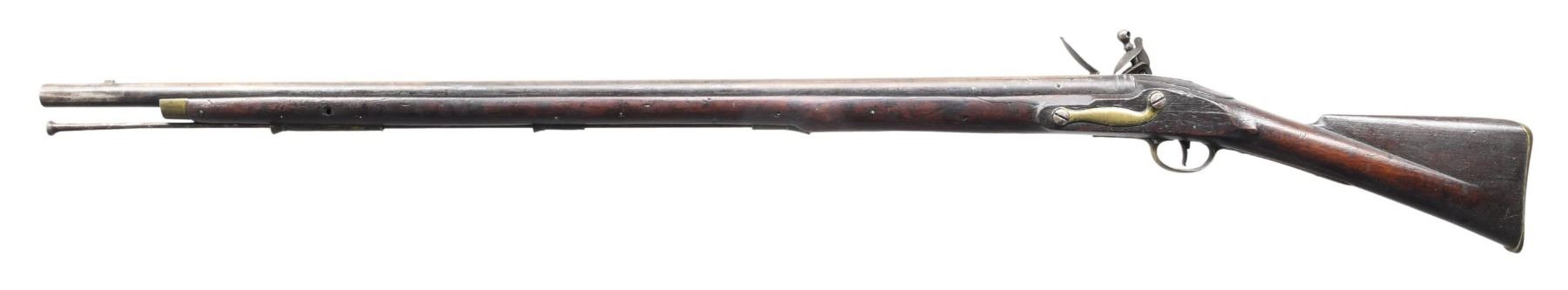 Cal. 75. S# NSN. The 39-1/4" barrel has filed in grooves at rear; is stamped with London black powder proofs and is pinned to stock. Barrel and lock are both in original flint configuration. Lock is of Circa 1808 style with reinforced cock and parallel sided pan. Lock is marked "TOWER" at rear and with crowned "GR" in front of cock. Stock is of early style with handrail comb and beavertail around barrel tang. A moderate palm swell is present. Inspector's initials "TR" ? are on left side of stock behind "S" shaped sideplate. Furniture is of standard India pattern type. CONDITION: very good to fine. Metal shows some cleaning over heavy incrustation of grease or oil. Stock has most of its original oil finish with a good scattering of marks. Wood is missing from top curve of lockplate and there is a crack on left side running from front lock screw up and forward to barrel channel. Sling loops are missing. Correct ramrod is present. Bore is good, lightly pitted. Lock is crisp. (01-25388/MGM). ANTIQUE. $2,000-3,000.
