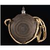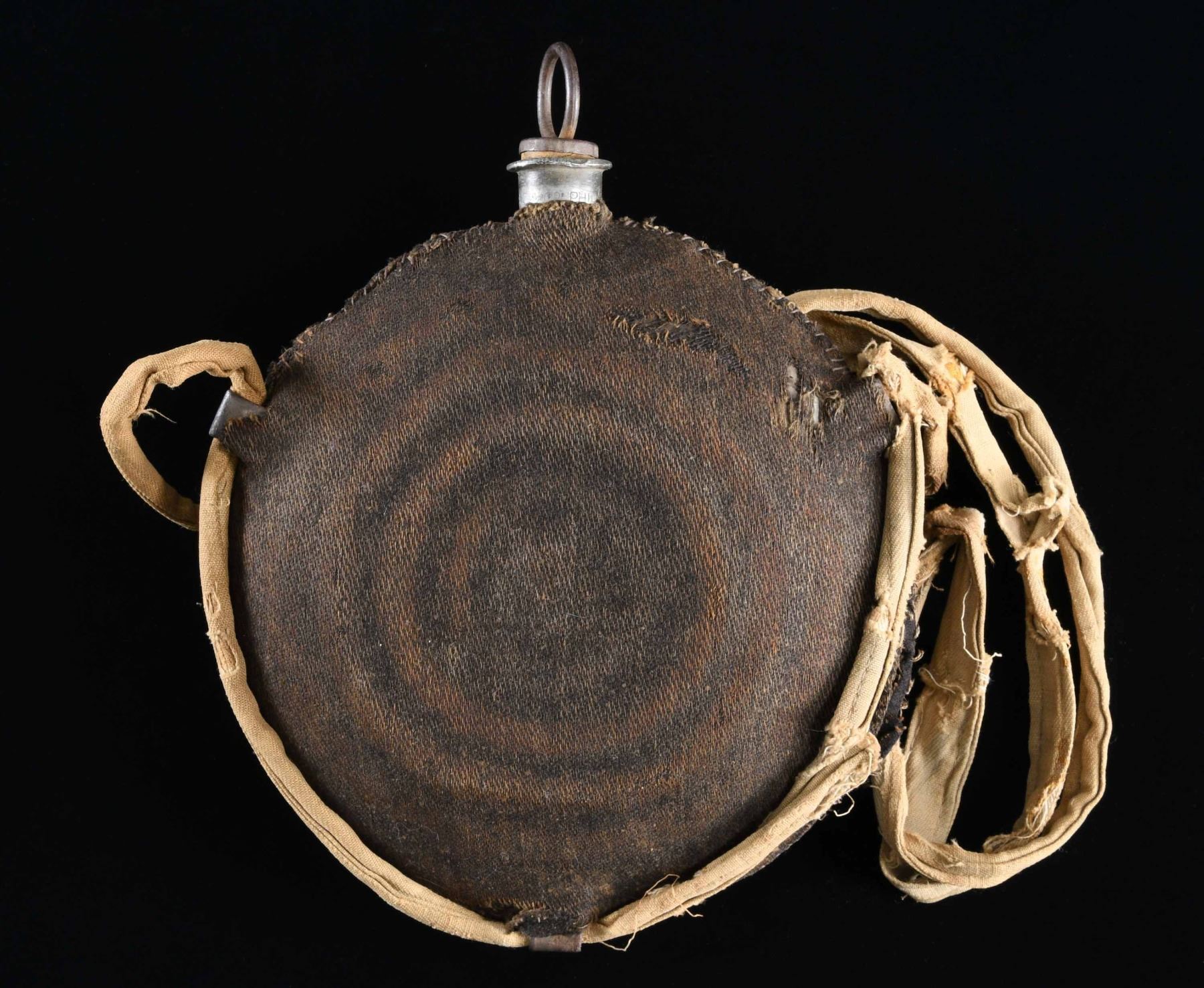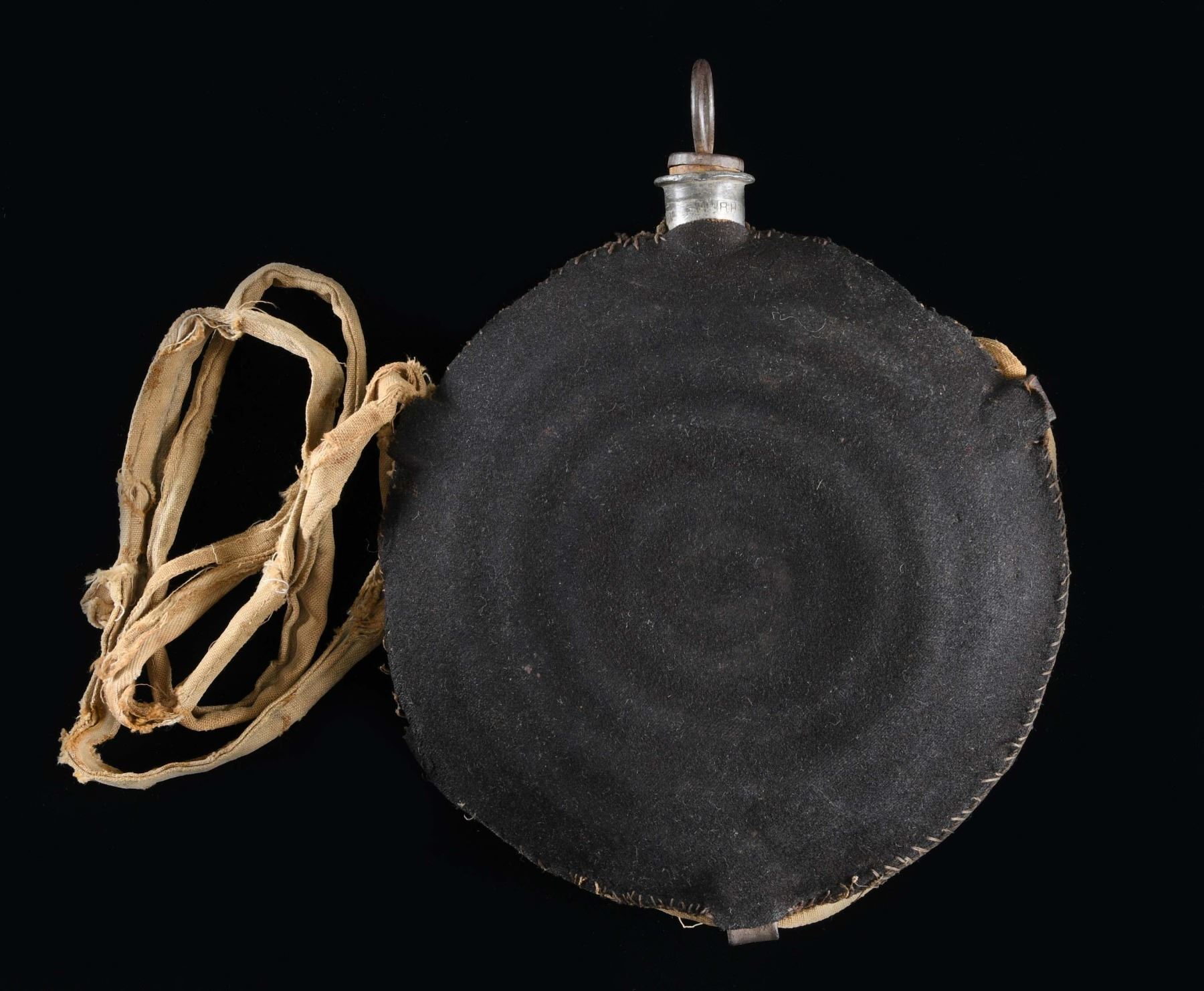 CANTEEN. Standard regulation Civil War model 1858 bullseye canteen, pewter throat with Philadelphia contractor's name, original canvas sling. Union blue color has always been difficult to find as only a small percentage survive in that color. CONDITION: fair to good overall, one side blue cloth with good color and the other side originally blue faded to brown with blue highlights. Canvas sling is frayed and stained, original tin & cork stopper. (02-24277/JS). NON-GUN. $300-400.