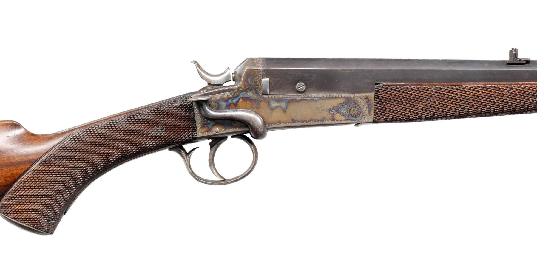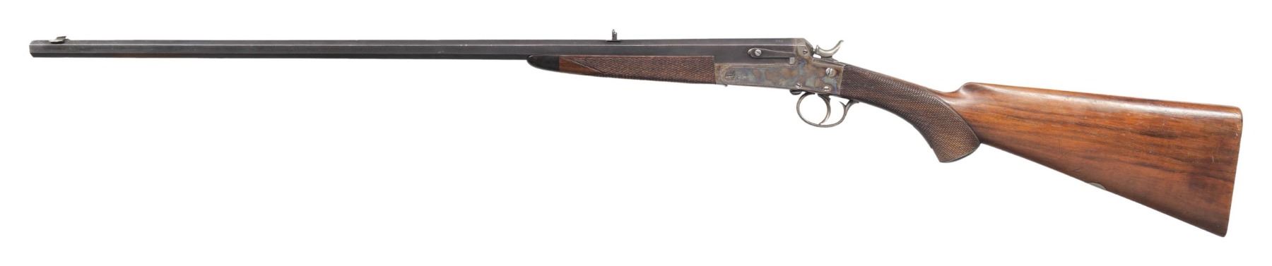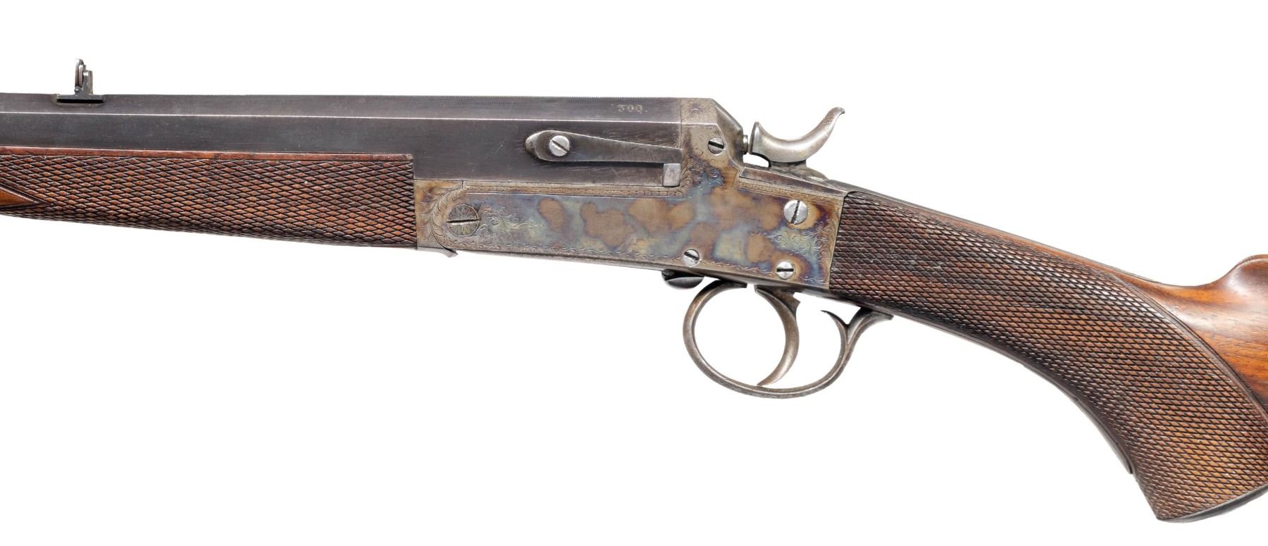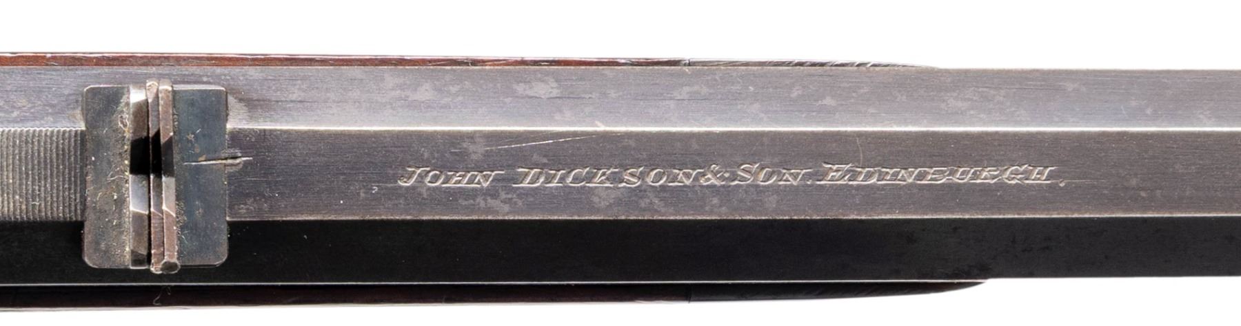 OF EDINBURGH. Cal. 300 Rook. S# 5648 (Dickson 1904) (Webley #68027). The 26" tapered octagon barrel is fitted with one standing, two nested leaf express rear and silver bead front sights. Top flat is engraved "JOHN DICKSON & SON, Edinburgh". There are no proofs on bottom of barrel or barrel flats. Webley # "68027" is in front of loop. Case hardened boxlock hammer tip down ejector action with side lever on right side is engraved with sprays of well cut scroll within geometric and vine borders. Webley S# is stamped on bottom. Dickson S# is on trigger guard bow. Lightly streaked European walnut steel capped pistol grip buttstock measures 14-1/2" over ribbed wood butt and features flat top checkering around grip and a vacant silver oval on toeline. Matching small splinter forend with horn tip has spring tension release. CONDITION: fine. Barrel retaining over 70% original blue with scattered flecking and considerable edge wear. Action retains most of its original case hardening color silvered and lightly pitted around bottom. Stocks retain nearly all of their original finish with marks and scratches. Checkering is lightly worn. Bore is fair to good considerably pitted. Action is tight. Mechanically good. PROVENANCE: From the Buckstix Collection. (25-6404/MGM). CURIO. $1,750-2,500.