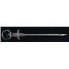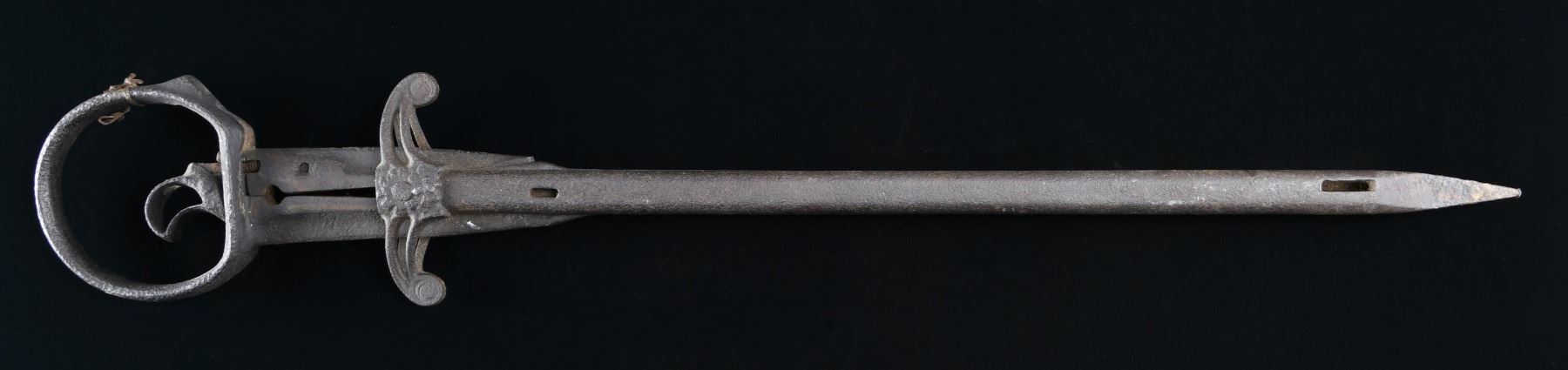 This visually interesting item is actually called a hay harpoon or spear. It would be thrust into a large haybale, and the two anchoring hooks would be deployed. Then a rope and pulley system would be used to hoist the bale to the hayloft in the top of a barn. The harpoon is cast iron and appears to be complete and functional. It was well suited for use with many long-stemmed grasses such as Timothy. CONDITION: The harpoon has an oxidized finish throughout, likely from years of hanging in an early barn. (02-23779/BF). $150-300.