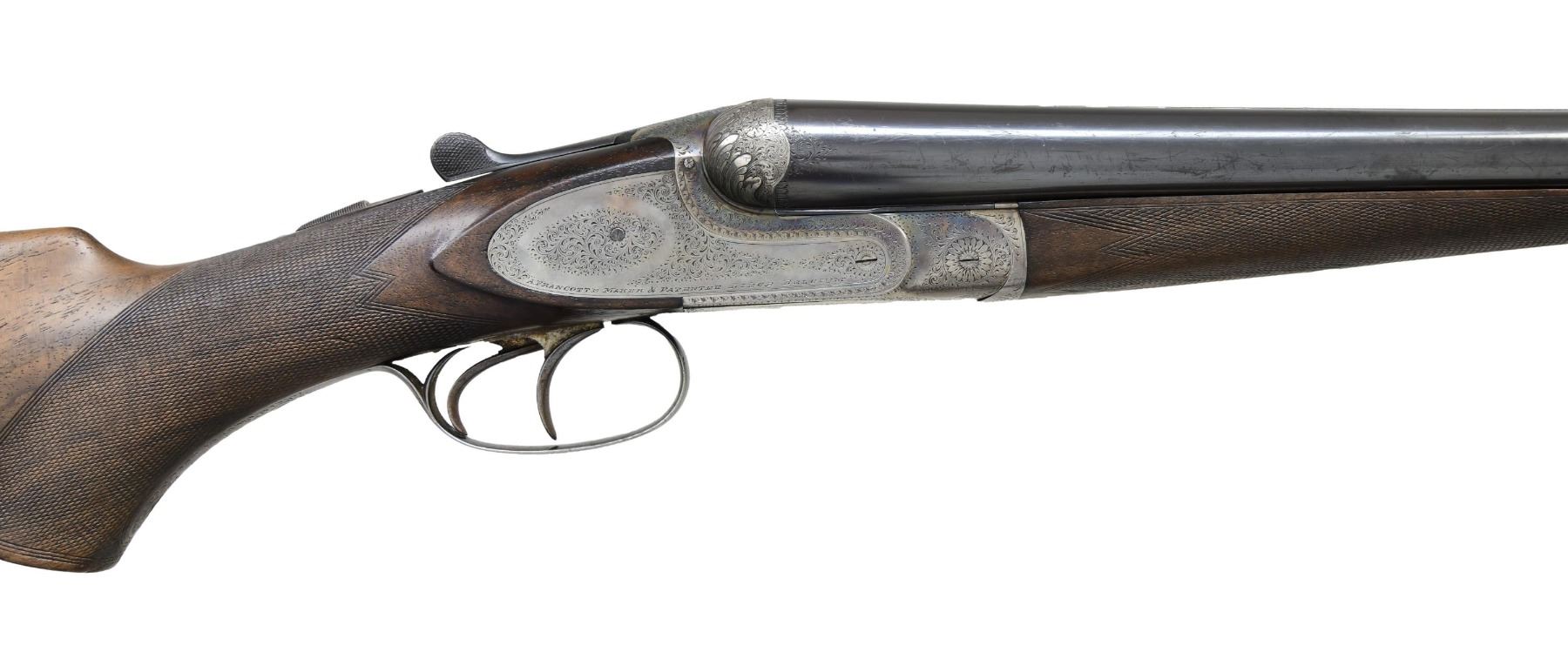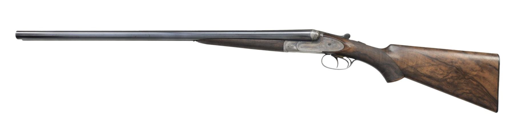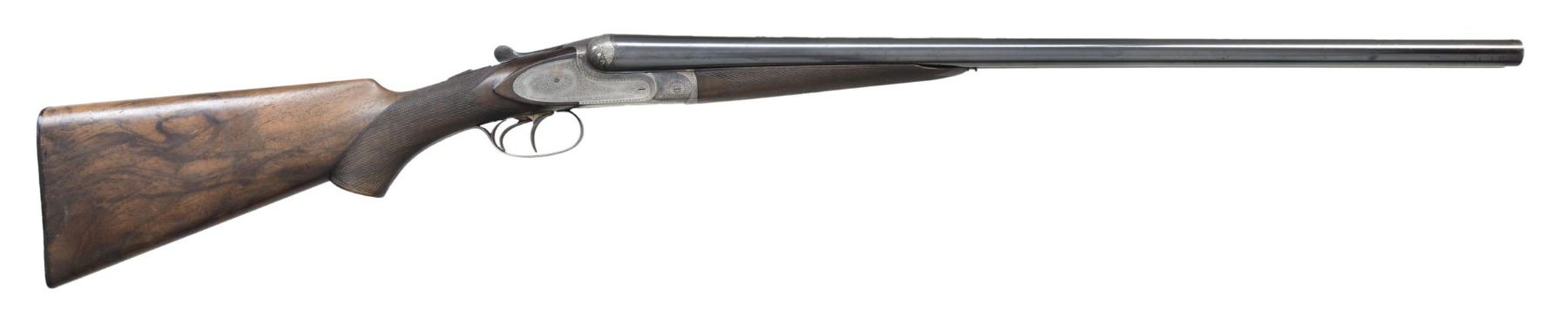 GAME SHOTGUN AS FOUND. Cal. 12 Bore 2-5/8". S# 37143. The 26" dovetailed barrels with narrow matted game rib are marked with VL&D info and "U.S. Agents New-York" on tops. Barrel flats are stamped with pre-1921 Belgian nitro proofs and Francotte info. Bottoms of barrels are stamped with steel info and "2-5/8"". Case hardened side plated boxlock action features automatic safety, crossbolt third fastener, side clips and double triggers. Action is engraved in usual 20 quality style with about 80% coverage well cut scroll. Fences are semi-relief engraved with acanthus. Each lockplate is engraved "A. Francotte Maker & Patentee Liege Belgium". Blued trigger guard with scroll on bow has S# on tang. Very finely marbled European walnut pistol grip buttstock measures 14-1/4" over serrated horn buttplate. Closely space point pattern checkering is at grip. Matching splinter ejector forend has Anson release. MEASUREMENTS: BBLS: Bore Diameter: L .728. R .727. Restriction: L .031 (full). R .008 (IC). Wall thickness: L .032. R .032. STOCK: DAH: 2". DAC: 1-1/4". CAST: neutral. LOP: 14-1/4". WEIGHT: 6 lb. 5 oz. CONDITION: very fine as found. Barrels retaining over 90% original blue with a fair scattering of marks and dings. Action and sideplates retain about 70% original case color, considerably silvered on bottom and fences. Stocks retain most of their original oil finish with many marks, dings and scratches, a few are fairly deep, finish is quite dry. Bores are shiny with some frosting evident in left barrel which also shows a minor dent a 11" from muzzle. Action is tight. Ejectors slightly out of time. This closet queen retailed for $300 in 1933. (24-5937/MGM). CURIO. $1,500-2,500.