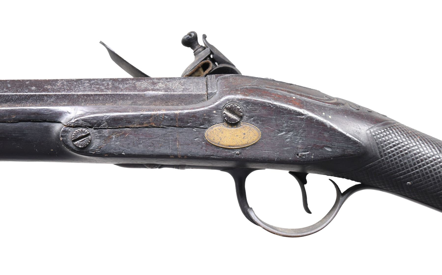 Cal. 16 Ga. S# NSN. The 38-1/2" lift out half octagon half round twist barrel with under rib is engraved "London" on top flat. Birmingham black powder proofs and barrel maker's initials "RI" are at breech end. Touch hole is not lined. Lock with chamfered plate and slightly rebated tail is fitted with serpentine cock, integral rounded semi-waterproof pan, bridled roller frizzen with large roller on feather spring which has dog nose finial. Lockplate is engraved "Hille" under pan. European walnut half stock is gunmetal mounted. Double beaded trigger guard has acorn finial. Buttplate has long, broad top tang engraved with a howling wolf. Stock has course square checkering around grip and well cut raised carving around barrel tang. Stock attaches to barrel with two captive sidebolts without escutcheons. CONDITION: good "as found". Iron and steel parts are mostly smooth dark brown patina. Barrel shows considerable spotting. Mounts are deeply toned to dark copper. Stock retains most of its dark original finish and has a great look. A fair size chip is missing from top left of butt. A 5" crack is on left side opposite lock. Stock forend tip is missing and there is a 4" crack on left side running from tip to front barrel bolt. Bore is dark and pitted. Lock works. An attractive gun dating from the 1770's. (01-26207/MGM). ANTIQUE. $1,000-2,000.
