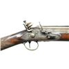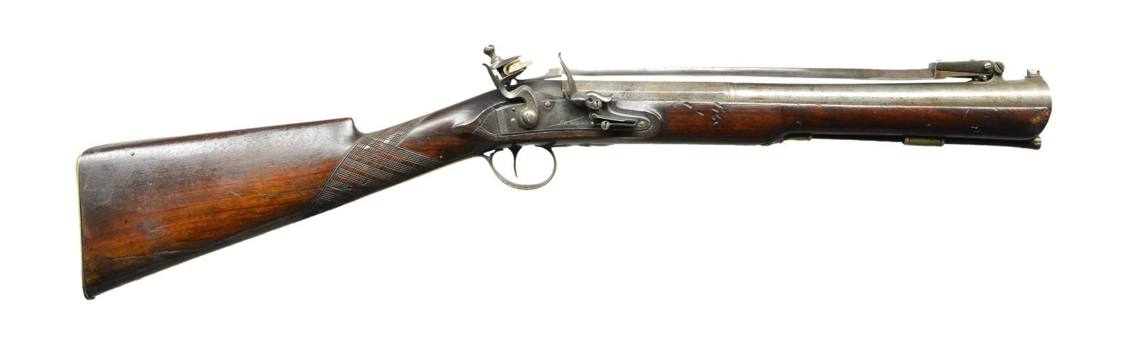 Cal. 1.2" at muzzle appears to be .75 at breech end. S# NSN. This gun was most likely made by James Richardson working in Manchester Great Britain 1793-1830. The flared 15" barrel has octagonal breech section with Birmingham proofs that transitions to round though a wedding band. Barrel is fitted with 13 1/2" triangular spring loaded bayonet with catch, which is held in folded position by thumb actuated slide on barrel tang. Lock with chamfered and rebated plate is fitted with high breasted serpentine cock, rounded integral pan and bridled roller frizzen. Feather spring with roller has bulbous finial that obscures last portion of maker's name on lockplate. Lock is engraved with line borders and some foliate sprays. Stock of plain European walnut is brass mounted. Buttplate has long top spur, butt is engraved "Edwd. Lloyd" "Green Hill". Trigger guard has 1780's type acorn finial. Skip line checkering is at grip. Stock is pinned to barrel and a horn tipped rosewood ramrod is held by beaded brass pipe and matching thimble. CONDITION: fine. Barrel showing cleaning to gray brown over light overall pitting. Lock has traces of case hardening color but is mostly gray to brown. Stock retains most of its original oil finish with a good number of knocks and bumps. There are some long cracks at toe and a few patch repairs with new oil. Bore is lightly rusted. Mechanically fine, bayonet catch and spring are good. Lock is good. (01-21792/MGM). ANTIQUE. $2,000-4,000.