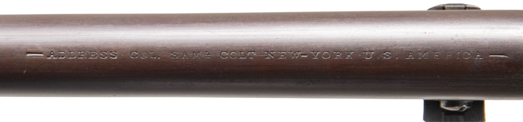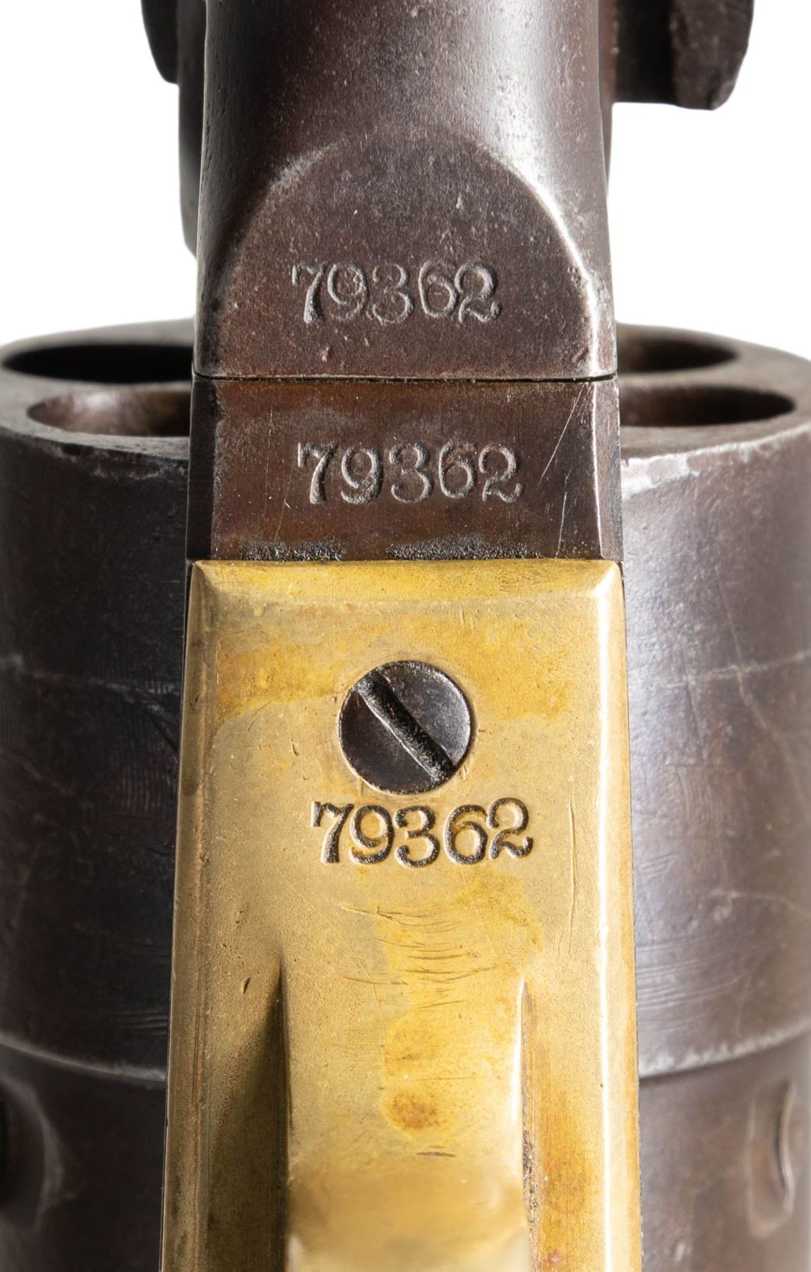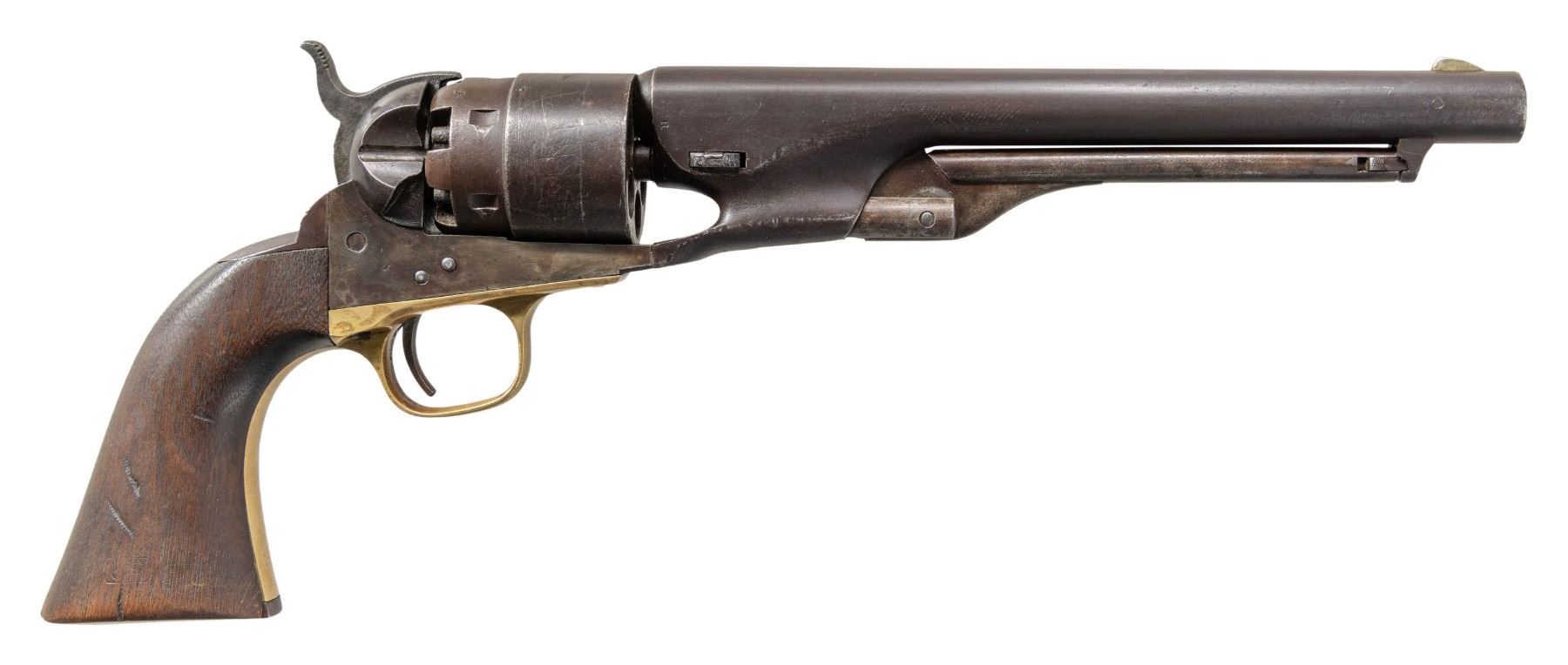 REVOLVER. Cal. 44. S# 79362. Standard configuration of 1862 government contracted army revolver, 8" round barrel, 1-line New York address, rebated cylinder with rolled naval battle scene, "COLT'S / PATENT" left side of frame, walnut grips with inspection cartouches on either side, metal parts have small sub-inspection marks. This is a very honest "as found" Colt army that has survived in complete original condition. CONDITION: very good overall, complete, original, all matching S#s, barrel has plum patina, cylinder has good naval rolled scene, frame & hammer have traces of dark muted case colors, sound grips with 2 good cartouches, mechanics are fine, crisp rifled bore. PROVENANCE: Estate Collection of John "Jack" Dhooghe. (01-28252/JS). ANTIQUE. $1,500-2,500.
