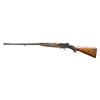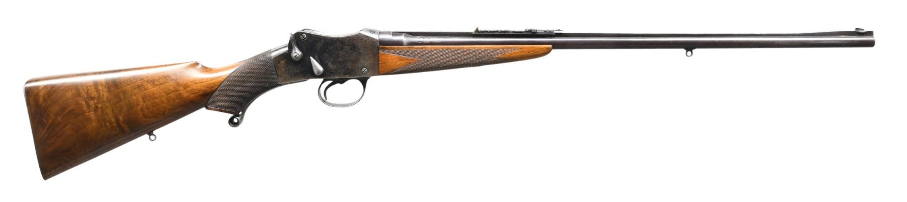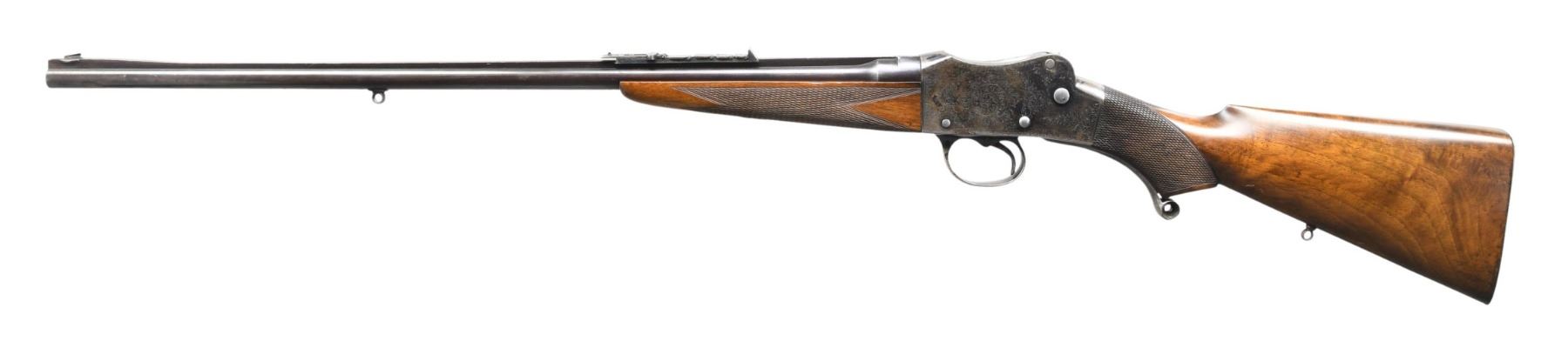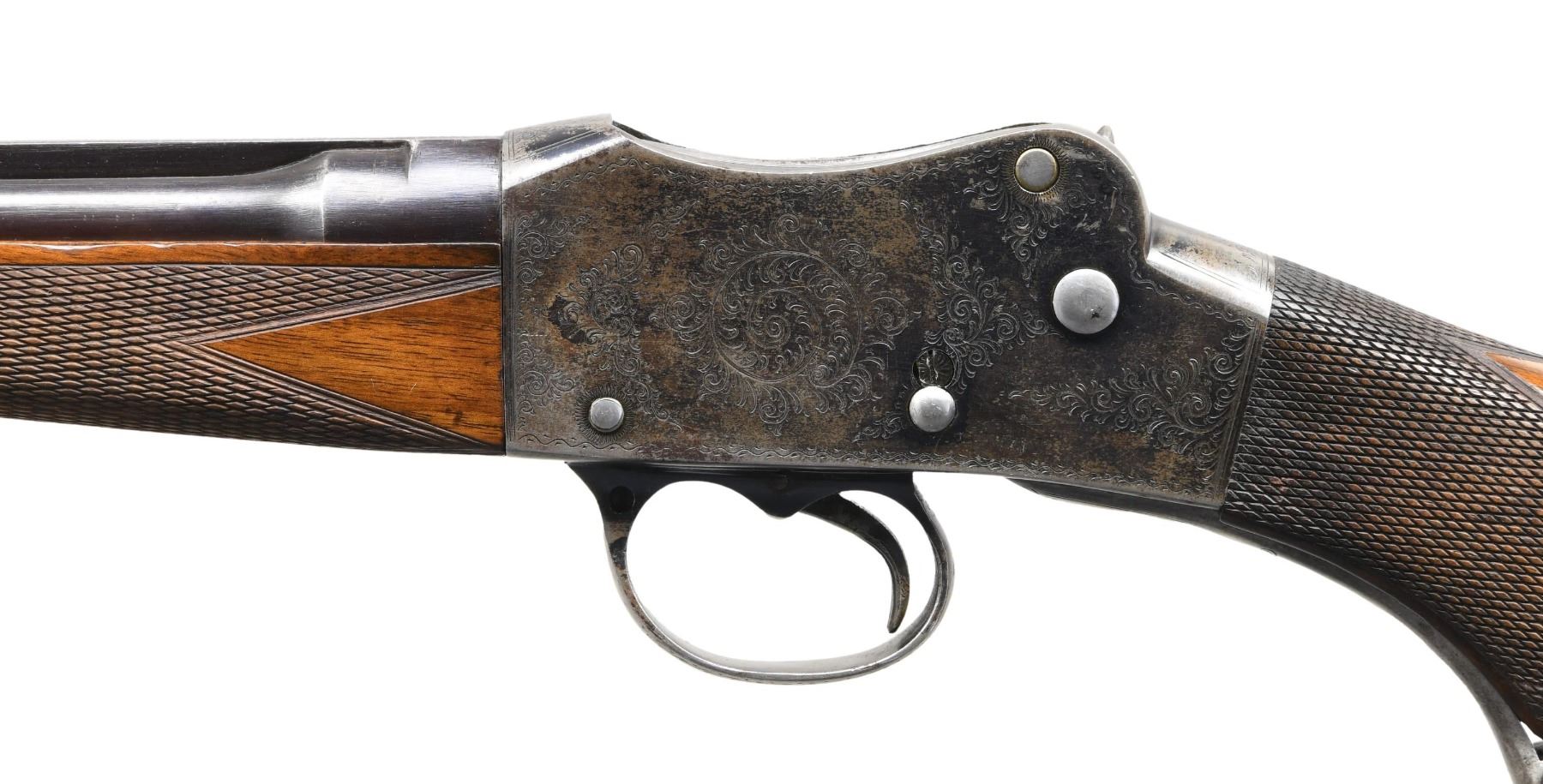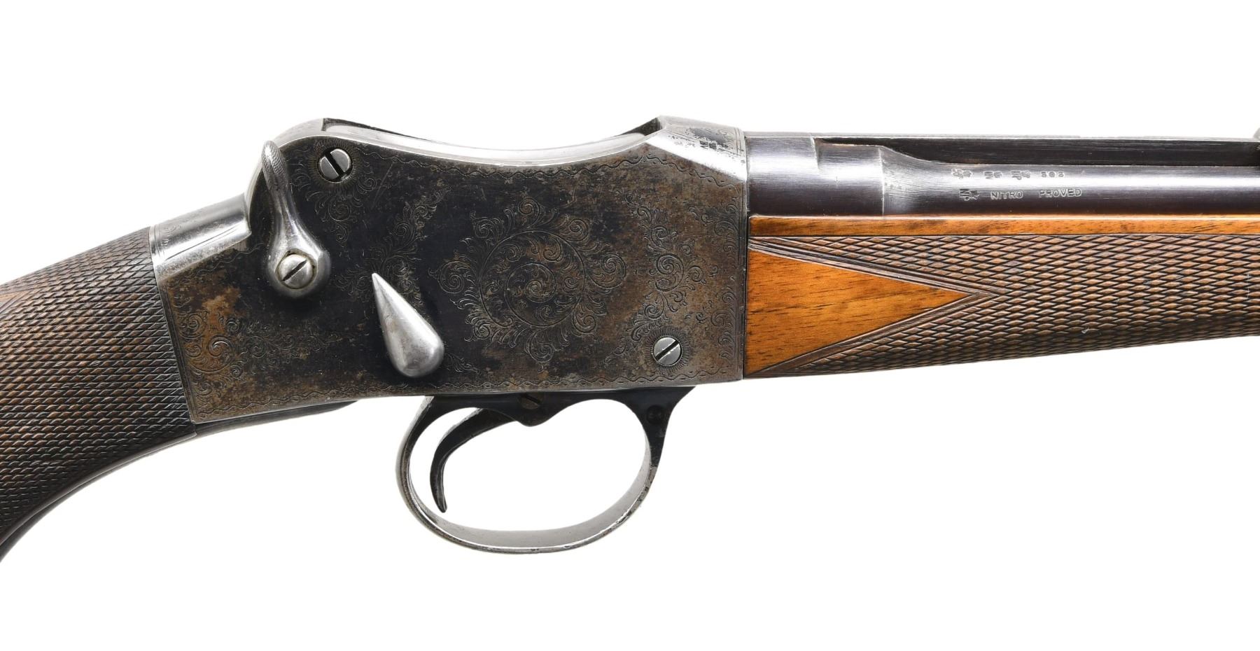 GUN CO. Cal. 303 British. S# 22006 (bottom of barrel). The 25-1/2" tapered round barrel is fitted with matted solid rib engraved "Midland Gun Co Birmingham" on unmated portion of rib behind one standing, four folding leaf express rear sight with additional long range folding ladder sight graduated out to 1,000 yds. Silver bead front is dovetailed through slightly raised portion of rib. Martini type case hardened tipping block action has toggling safety on right side. Action is engraved with about 50% coverage simple scroll. Pistol grip buttstock of nicely figured European walnut measures 14-3/8" over steel buttplate with trap. Flat top checkering is at grip. Barrel and stock are fitted with sling eyes. Matching slim forend screws to barrel. CONDITION: fine. Metal retaining most of its original blue which has considerably lightened from normal hand wear. Bore is shiny, cleaned over considerable frosting. Mechanically fine. (24-5869/MGM). CURIO. $1,500-2,500.