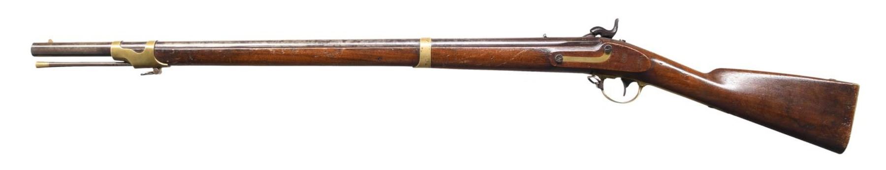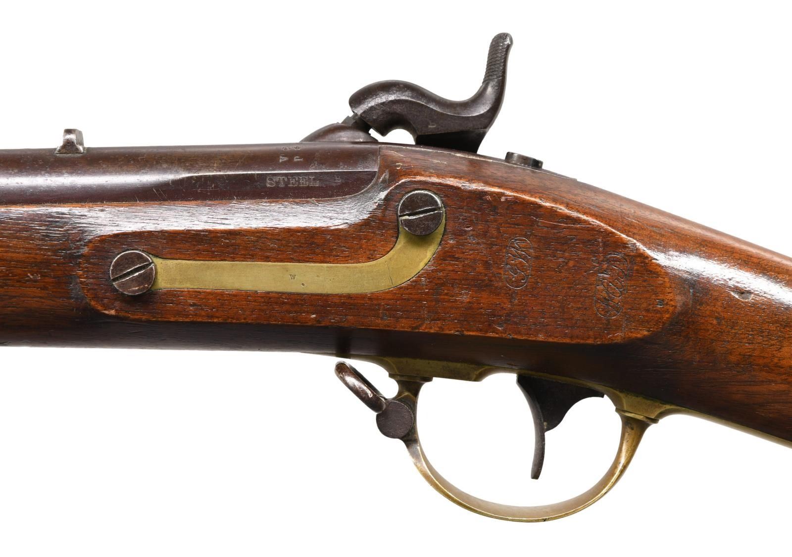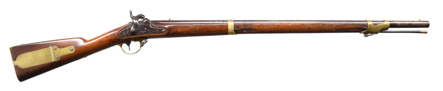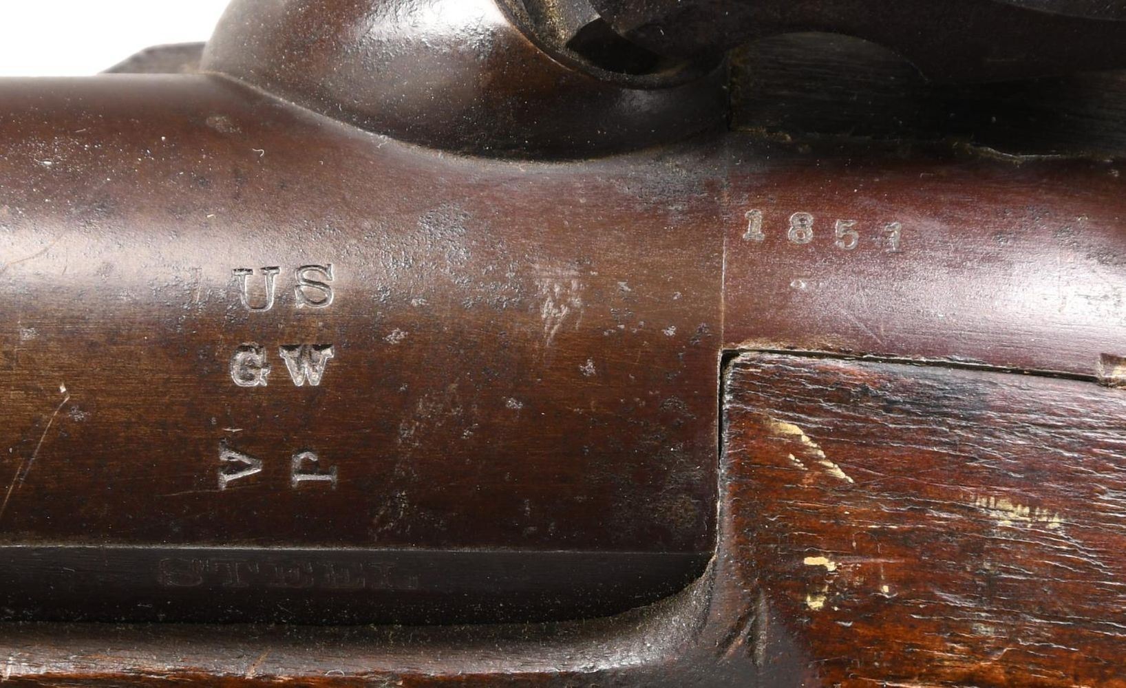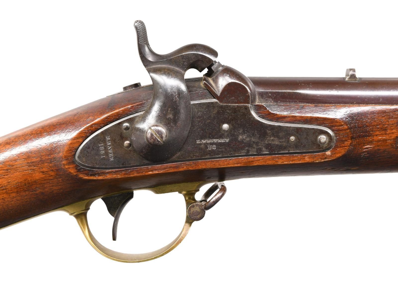 Cal. 54. NSN. Standard configuration with 33" barrel and attractive brass mounts. Rear of barrel is marked "US" "GW" V & P proofs along w/ "STEEL". Tang is dated "1851". Lock marked "E WHITNEY" "US" at center has "N. HAVEN" "1851" on tail. American walnut stock has inspectors marks "GW" & "WAJ" on left side. CONDITION: very good. Barrel w/ some original brown shows cleaning & pitting. Lock has traces of case color. Stock w/ most of its original finish has many knocks & dings. Brass is nicely toned. Bore is dark & lightly pitted. Mechanically good. Inspector's marks are excellent. Whitney made over 26,000 of these rifles and later in life wrote that he built these rifles for a long time and "never really made a profit". (01-24495/MGM). ANTIQUE. $2,000-3,000.