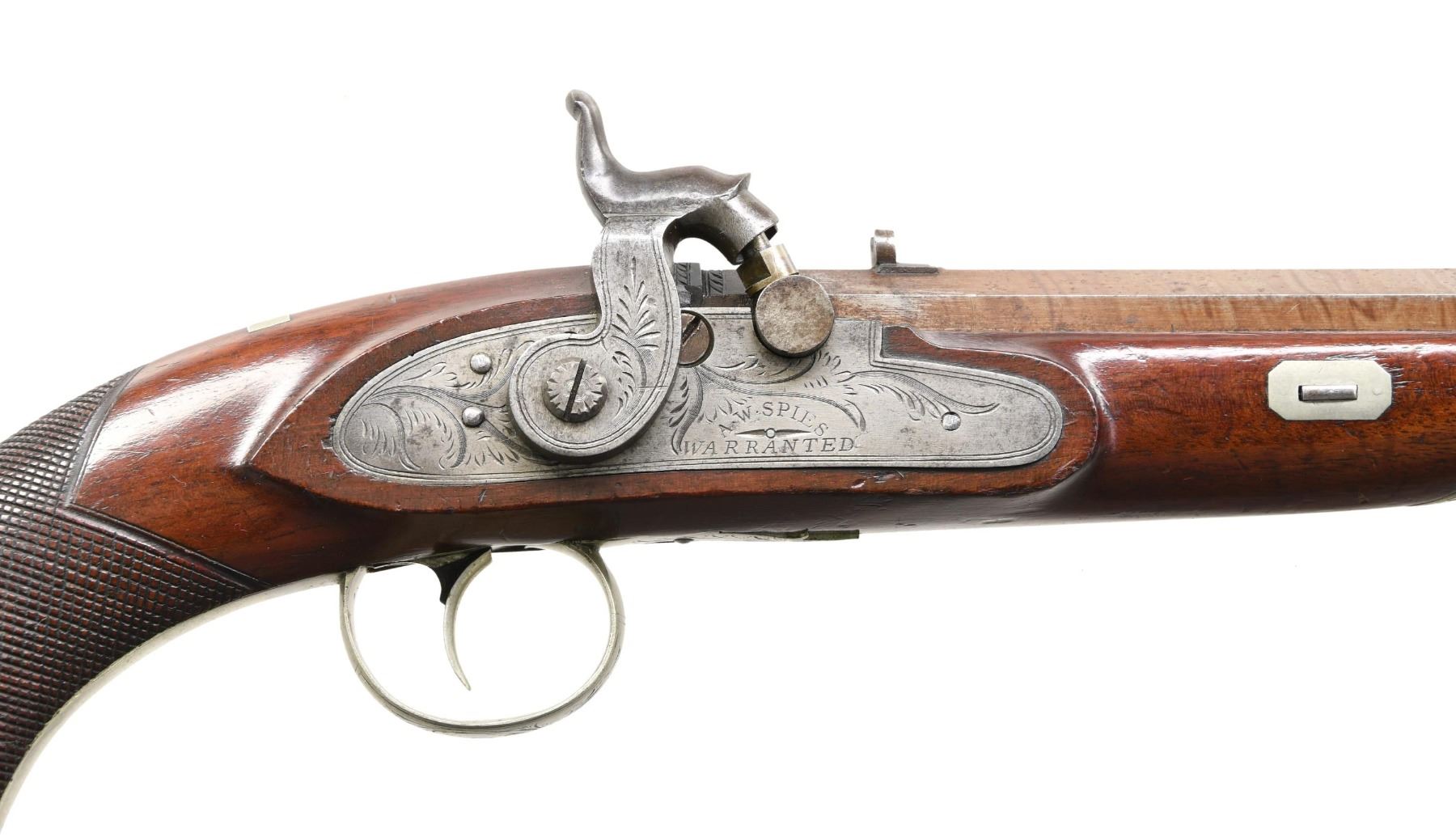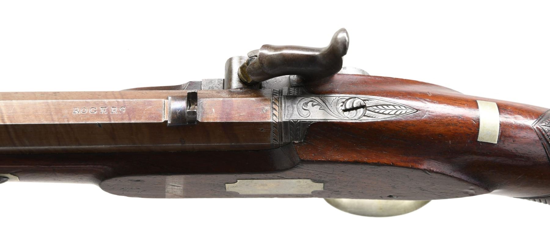 BY AW SPIES. Cal. 38 Rifled. S# NSN. This well made, fine condition pistol has 10" browned twist octagon barrel fitted with buck horn rear and blade front sights. Top flat is stamped "ROGERS" in the exact font and size as seen on rifles by Riley Rogers of Utica, NY. Usually the stamp has an "R" prefix. Other similarities in style and decoration support Rogers as the manufacturer of this pistol. Pistol was retailed by A. W. Spies of New York City who's name is on lockplate of front spring percussion lock. American walnut stock with checkered bag grip is mounted in German silver. Trigger guard and lockplate are engraved with foliage and scrolls. Original ebony ramrod with brass tip is held by steel pipe on half rib of barrel and German silver tail pipe. CONDITION: very fine. Barrel retaining about 90% original brown with high edge wear. Lock shows light cleaning of its original faint case hardening color to silver gray. Stock retains 85-90% original varnish with a good number of handling marks. Checkering is lightly worn. Bore is bright, sharp and shiny. Lock is crisp. A very fine American made pistol. (01-25624/MGM). ANTIQUE. $1,500-2,500.