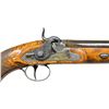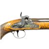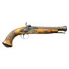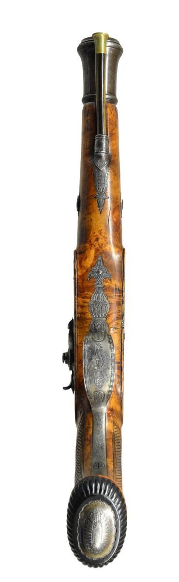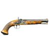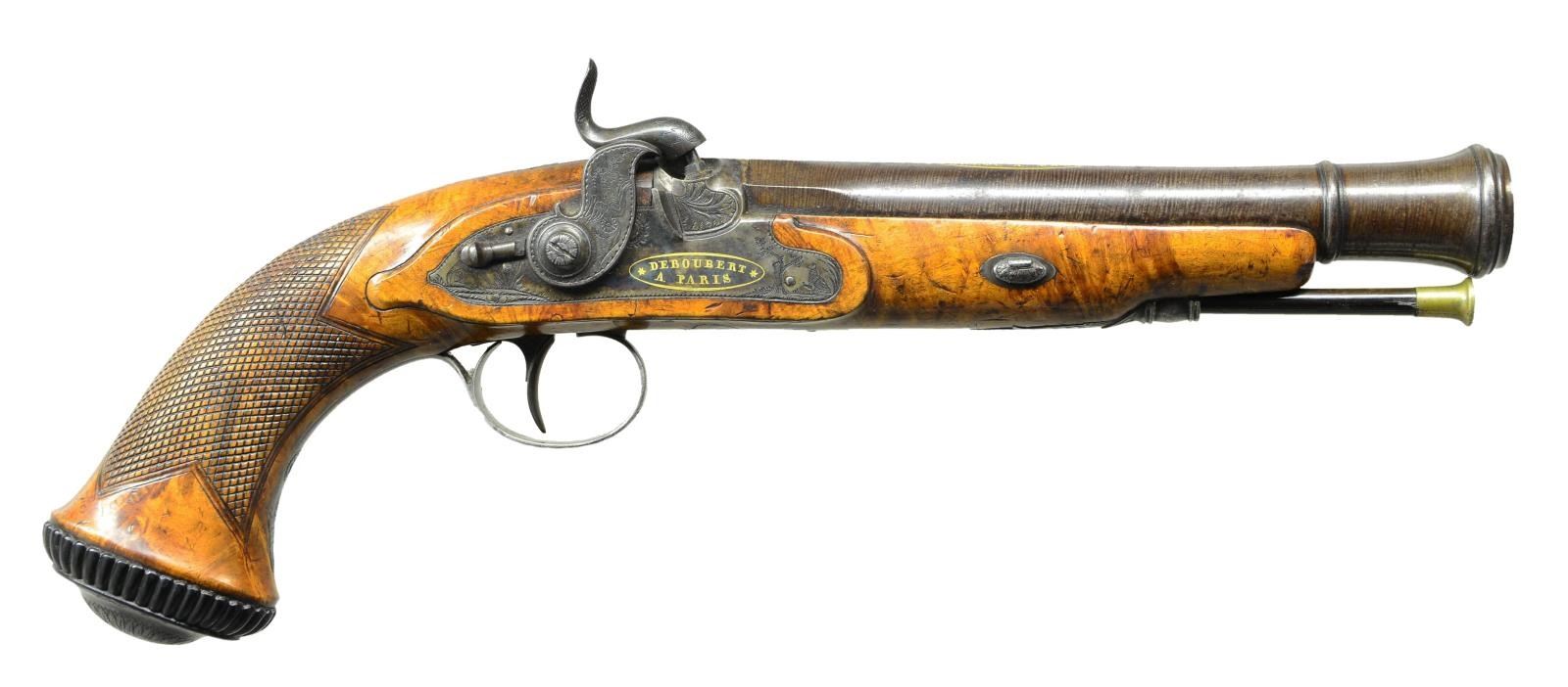 HOLSTER PISTOLS BY DEBOUBERT OF PARIS. Cal. 1" at muzzles. NSN. The 8" twist steel barrels with octagonal breech sections transition to round and have ring turned flared cannon muzzles. Tops of barrels are gold inlaid "DEBOUBERT" "BREVETE A PARIS" (working 1812-30 who held the first French patent for percussion cap). Case hardened patent breeches are well filed and gold inlaid "1" & "2" which matches numbers in sighting notches of breech irons. Front spring locks with broad flat faced percussion hammers are fitted with back sliding safetys. Maker's name and address are in gold on each lockplate. Pistols are stocked in fancy figured elm with flared grips and are iron mounted. Trigger plates have vase type finials and trigger guards have plain bows. Grip caps are of flute carved ebony and have steel knobs. Sideplates are wing shaped. Locks and other iron parts are very finely engraved with game scenes and acanthus within geometric and feather borders. Birds are on lockplates and trigger guard bows. Sideplates are engraved with stylized swans. Stocks have square checkering at grips, are stocked within 2 " of muzzles and are attached to barrels with captive sidebolts through oval silver escutcheons. Baleen ramrods with brass tips have steel tails fitted with cleaning impliments. CONDITION: very good to fine, original as found. Barrels retaining over 80% original brown with twist pattern strong. Locks and patent breeches retain most of their case hardening color with some scattered splotches. Other mounts show some cleaning and are mostly pewter gray. Stocks retain most of what appears to be original oil finish, with a large number of knocks and dings. Bores are mostly shiny with some discoloration toward muzzles. Locks are fine. Safetys work. Pistol #1 has a crack on left side running from rear of barrel down to trigger plate. (01-22354/MGM). ANTIQUE. $6,000-10,000.