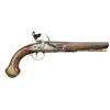 PISTOLS BY DURS EGG. Cal. 58 (pr.). S# NSN (pr.). Swiss born Durs Egg emigrated to England in the 1760's and worked for Henry Nock. He had formed his own business by 1772, was completely blind by 1822 and died in 1831. He was one of the most famous gunmakers of his day. These pistols were probably made in his early years at about the time of the American Revolution. They have 8" browned barrels which are octagonal at rear and transform through a wedding band to round with slightly flared muzzles. Top flats are engraved "D. EGG - LONDON" and London proofs are on top left flats. Barrels are not fitted with patent breeches. Tangs are engraved with spears, clubs and sheilds. Locks with slightly arched beveled plates and rebated tails are fitted with serpentine cocks, back sliding safetys, integral rounded pans, bridled friction frizzens and feather springs with spear finials. Locks are engraved with line borders and "D. EGG" in front of cocks. European walnut full stocks with knob grips are brass mounted. Trigger guards are of 1770-90 style with acorn finials. Heavy chamfered sideplates are one piece and grip heavy grip knobs have side spurs. Vacant ovals are on tops of grips and hickory ramrods with bone tips mount through single beaded pipes and matching thimbles. Stocks are pinned to barrels. CONDITION: very good. Barrels retaining most of an old rebrown showing some watered pattern to steel. Engraving on tops is slightly softened. Locks show bright polish over light pitting. Stocks with old oil refinish have many marks. Brass is nicely toned. Bores are good with some light pitting. Locks are fine. An attractive pair of British pistols probably dating from the revolutionary war period. (01-21799 (2)/MGM). ANTIQUE. $3,000-5,000.