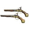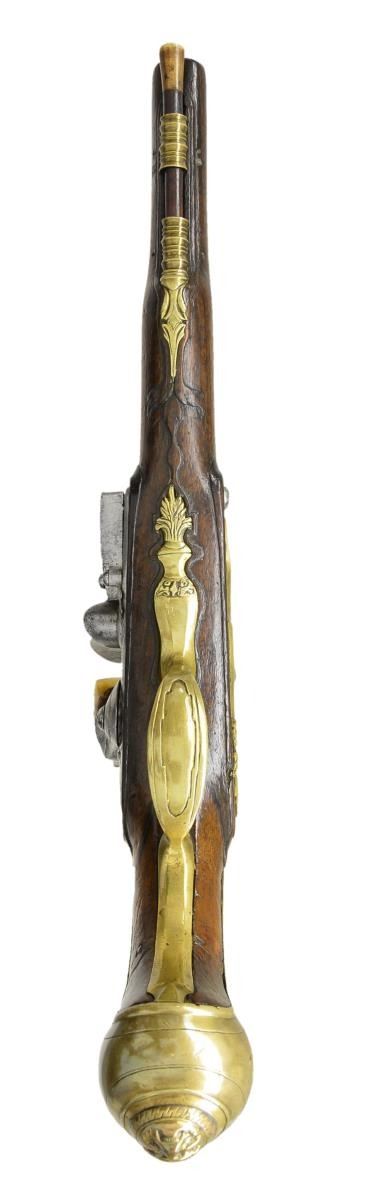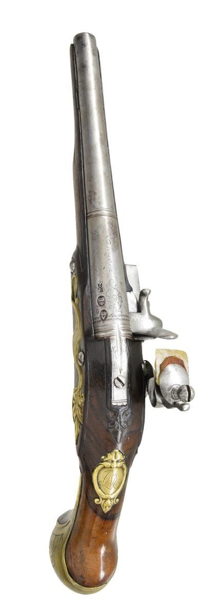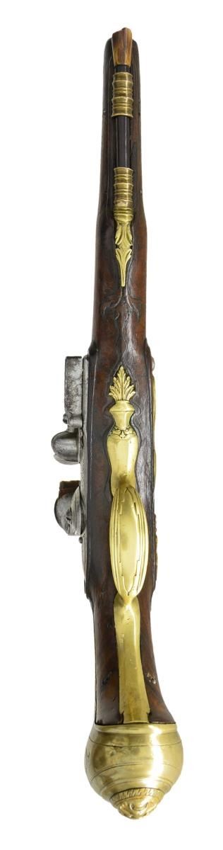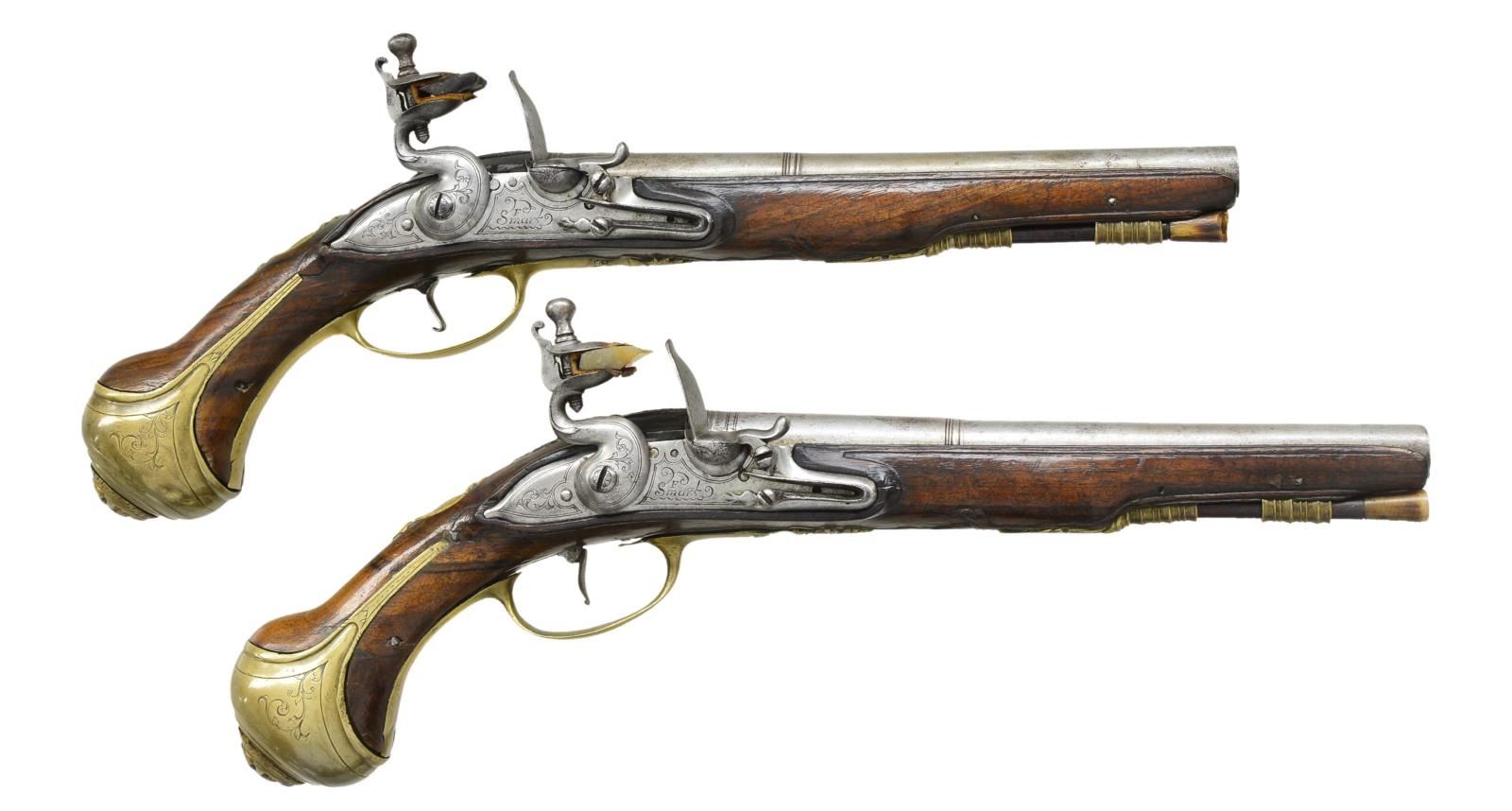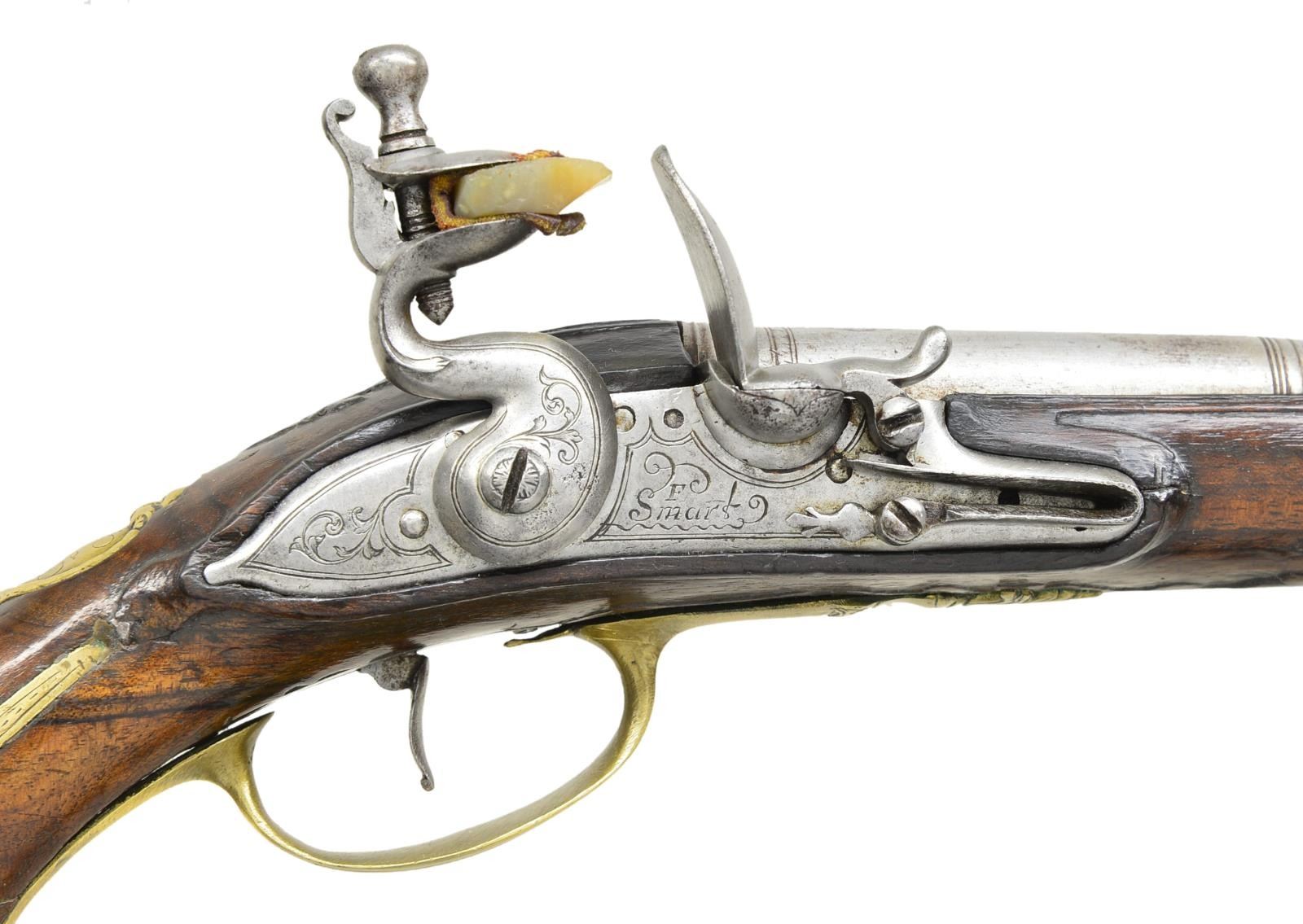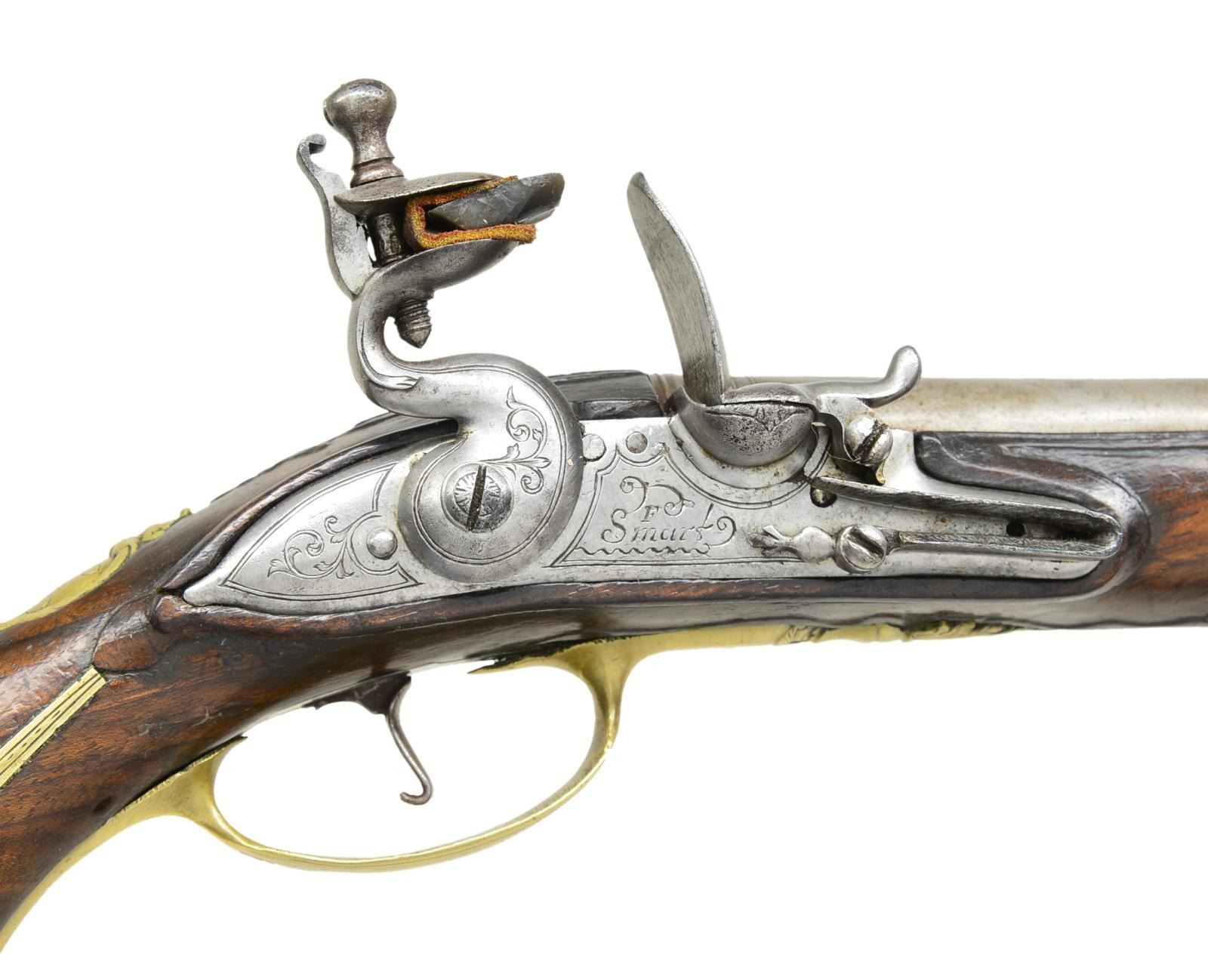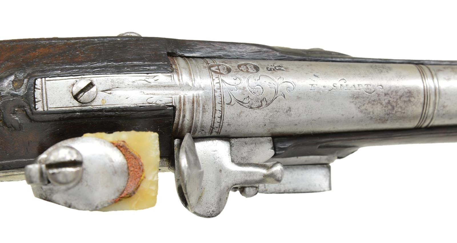 Cal. 55. NSN. Bbl. 8 3/4". Francis Smart became free of the gun maker’s company of London in 1693 & worked until around 1725. He was an officer in the gun maker’s company in 1716 & made guns for Hudson Bay Company & the Royal African Company. Good examples of his work are seldom seen. These fairly well preserved pistols have 8 3/4" stepped rnd. bbls. w/ slight flare to muzzles. Rear portion of breeches have turned bands & there is some well done scroll engraving. Tops engraved. “F. SMART”. Left sides stamped w/ very early London gun maker’s proofs & Smart’s crowned “FS” bbl. mark. Locks w/ arched rnd. bodied plates w/ attenuated tails fitted w/ early style serpentine cocks, inset rounded pans, unbridled frizzens & feather springs w/ pineapple finials. Plates & cocks are line border & scroll engraved. “F” “SMART” is under each pan. Internal inspection reveals unbridled tumblers & crowned “H” armorer’s mark. Walnut stocks extending to muzzles exhibit very early styling w/ long curve to pistol grip & swell at thimbles. Raised carved fields are around lock & sideplates & there is acanthus carving behind bbl. tangs. Pistols are brass mounted w/ very lg. bulbous grip caps w/ side straps. Central bosses are grotesque heads. Scrolled sideplates are of acanthus leaves & multi beaded trigger guards have urn & foliate finials. Crest plates engraved w/ monogram “TEA” (?) on lg. tongues of grotesque head pattern. Figured rosewood ramrods w/ horn tips mount through single multi banded pipes & matching thimbles. CONDITION: iron parts all cleaned to fairly bright silver gray over some light scattered pitting. Wood w/ old possibly original finish, considerably worn w/ many light marks & dings. Stocks appear sound w/ few noted repairs except for tack repair & replaced wood at front side of butt (one pistol). Bores are very good w/ some scattered pitting. Locks operable. (01-19865/MGM). ANTIQUE. $5,000-7,000.