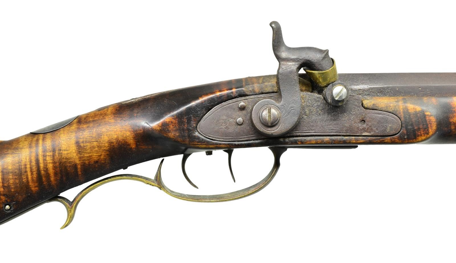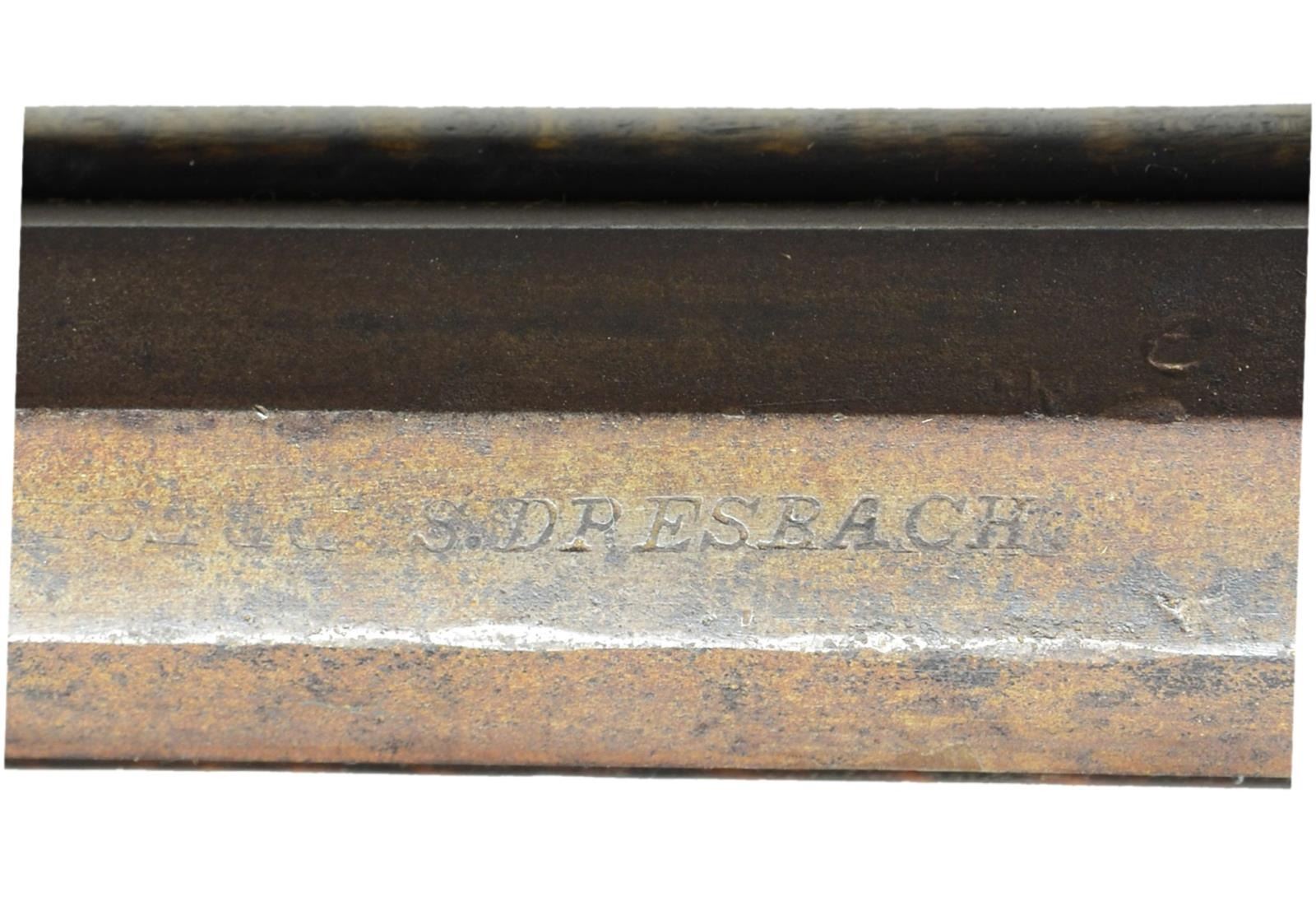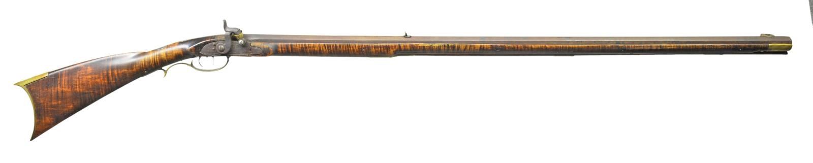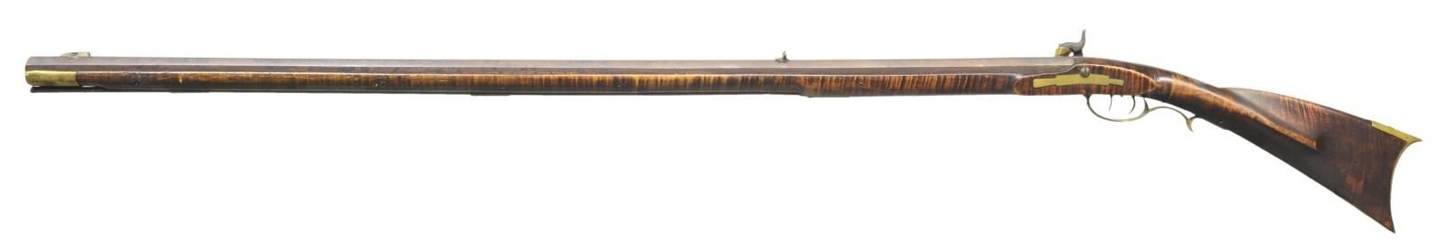 Cal. 42. NSN. 42 1/2" swamped octagon bbl. fitted w/ replacement square-notch rear & German silver front sights is marked "??? S. Dresbach" on top flat (Samuel Dreisbach 1814-1838 Mifflinburg, PA.). Trade percussion lock marked "WARRANTED" has stamped engraving. Rifle fitted w/ dbl. set triggers. Full length stock of attractive curly maple extends to muzzle w/ 2" brass cap & is pinned to bbl. Stock is brass mounted w/ finger spur to trigger guard. Crescent buttplate has 3" return. A sm. cheekpiece is on left side. Sideplate is rectangular w/ rectangular reductions at front & back. Hickory ramrod is held by 2 beaded & faceted pipes & matching tailpipe. CONDITION: iron parts w/ gray brown patina, nicely toned. Sights, nipple, brass flash protector & cleanout screw to drum are new. Stock retains most of an old oil refinish, sharp edges rounded. There are some noted repairs to wood on bbl. channel & w/ repaired cracks. Bore is bright & shiny w/ strong rifling. Lock & triggers are operable. PROVENANCE: Collection of Dr. John Persing. (01-19582/MGM). ANTIQUE. $2,500-4,000.