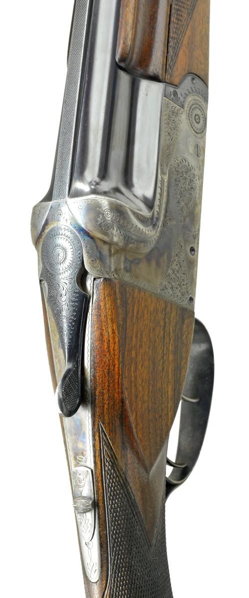 JOHNSON. Cal. 16 Ga. S# 46481. Bbl. 26 1/4” demi-bloc w/ narrow matted solid rib are engraved “IVER JOHNSON SPORTING GOODS CO. GRADE AA” & “MADE IN BELGIUM” along left side of rib at rear. Bbl. flats are stamped w/ Belgian 1959 nitro proofs for 2 3/4” chambers. Maker’s name “FALLA” (Jean Falla) is on bottom along bbl. Case hardened O/U action features automatic safety, dbl. triggers & dbl. Kirsten type top bolting system combined w/ dbl. under lugs. Action is engraved w/ 50% coverage simple scroll. Blued top lever & triggerguard are engraved w/ matching scroll. Rnd. knob pistol grip buttstock of lightly streaked European walnut measures 14 1/2” over ribbed horn buttplate. Matching 3 piece splinter ejector forend has Anson type release. MEASUREMENTS: BORE DIA.: Top .671. Bottom .670. BORE RESTRICTIONS: Top .020 Mod. Bottom .011 Mod. WALL THICKNESS: Top .020. Bottom .029. DAH: 2 9/16”. DAC: 1 1/2”+. Cast 1/4” off. WEIGHT: 6 lbs 3 oz. CONDITION: very fine overall. Bbls. retaining over 90% original blue w/ high edge wear & some scratches. Action retains about 70% original case hardening color. Top lever thumb piece is silvered & triggerguard blue has flaked & is now mostly gray & brown. Stocks retain most of their original finish. Buttplate has some moth damage. Bright shiny bores. Tight action. Crisp mechanics. A good handling, lightweight gun. (21-3009/MGM). CURIO. $500-800.