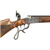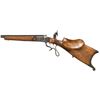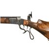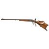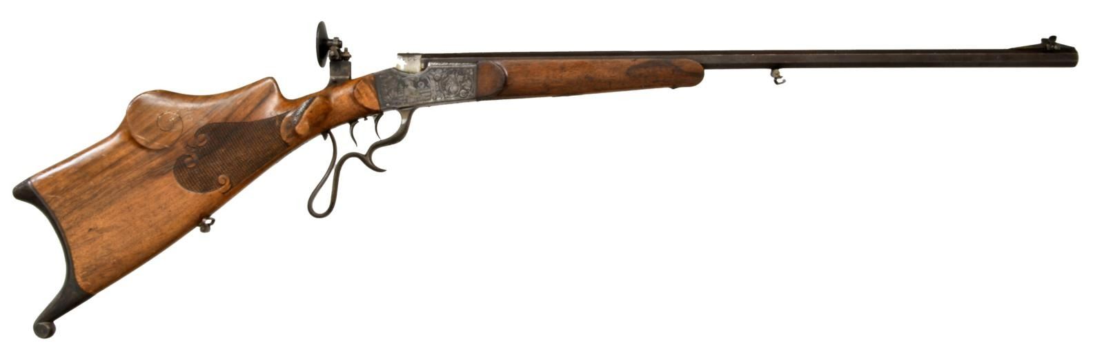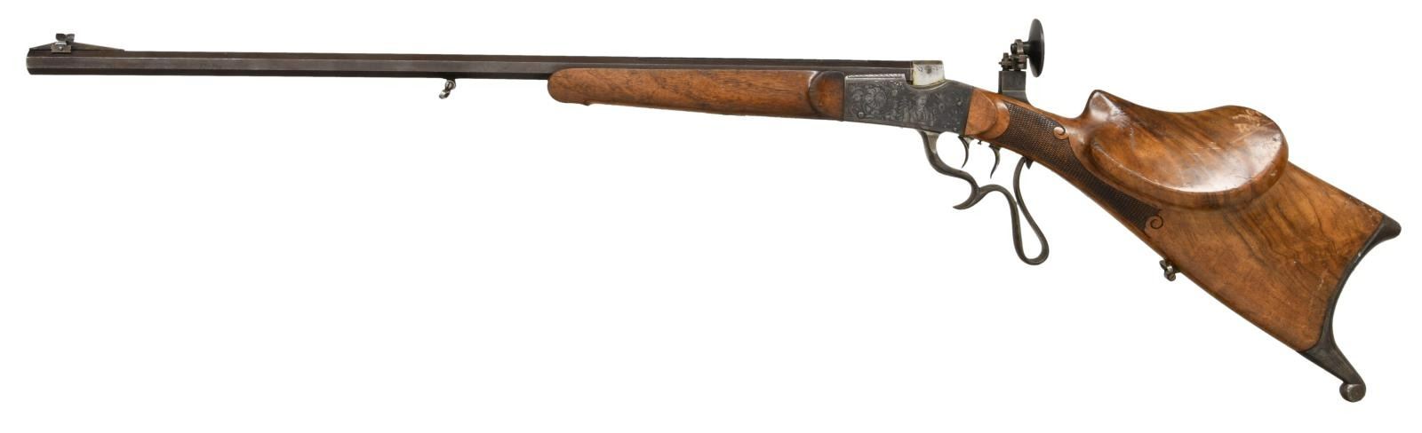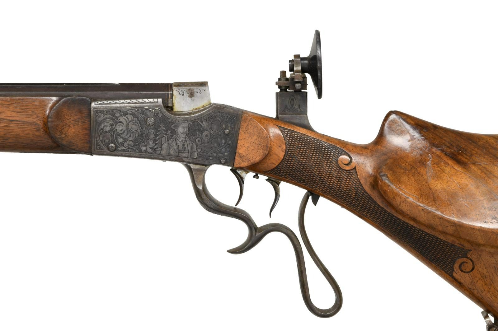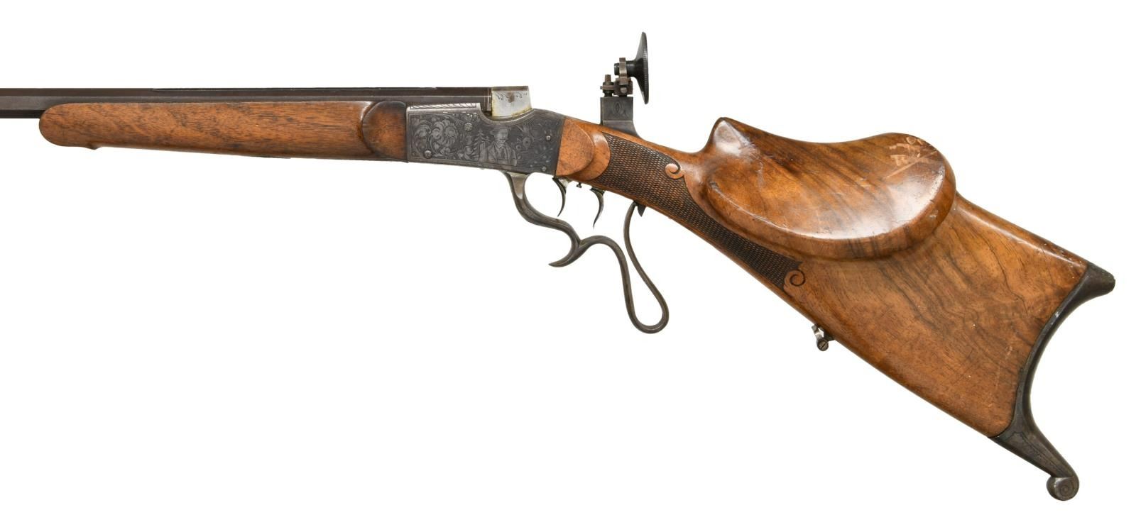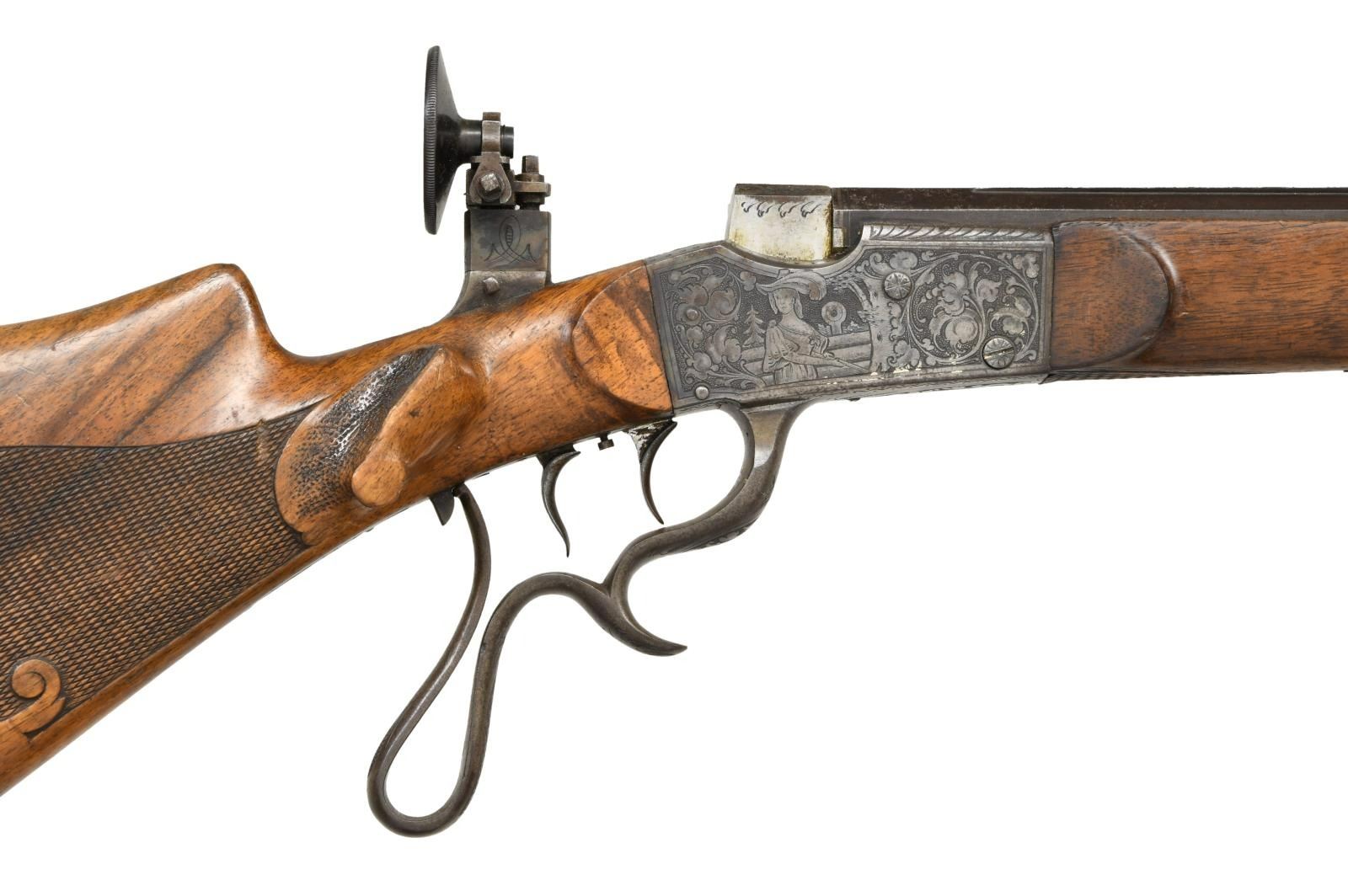 FINE ENGRAVING AND ORIGINAL SIGHTS. Cal. 4mm RF. S# NSN. These rifles were made for indoor target shooting and were quite popular in the late 19th and early 20th Century. The breech loading design similar to this rifle consisted of about 8" of rifled barrel which opens into a long large caliber tube which acts as a silencer to minimize the already quiet report of this small bore cartridge. The 4mm round only used the priming charge as a propellant. These rifles are generally quite accurate and some, like this example, are of very high quality. This rifle has 26-3/4" octagon barrel with milled in dovetail top flat for open sights. Top of this flat is silver inlaid "Emil V. Nordheim Mehlis". There are silver bands around breech ends and barrel is fitted with sling loop. Dropping block action is of the type illustrated on pages 49-52 of "Alte Scheibenwaffen Volume 3" as compiled by Tom Rowe. Firing mechanism with double set triggers is cut away at top and barrel nestles into place and is retained by a transverse pin. Action is nicely engraved with classic large open shaded acanthus surrounding portrait of German male shooter on left and woman on right. Triggers are double set and trigger guard is looped and spurred in Schutzen style. Rifle is equipped with its original Diopter rear tang sight and blade front adjustable for windage. Stocks are of usual Schutzen style with well formed right hand cheekpiece, thumb rest and hooked butt. Grip is nicely checkered. CONDITION: fine. Barrel retaining most of its original blue with some scattered pitting toward rear which shows cleaning. Action retains most of its original case hardening color. Stocks retain most of their original oil finish. Bore appears to be very fine with distinct rifling, needs cleaning. Mechanically good, trigger will not set, probably needs adjustment. These rifles are a lot of fun to shoot. Ammo is available through some importers. (23-4729/MGM). C&R. $1,200-2,000.