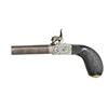 PERCUSSION PISTOL WITH FOLDING TRIGGER. Cal. 45. NSN. 2 5/8" Twist bbl. with multi groove rifling does not have a wrench lug. Coin finished boxlock percussion action with nicely filed hammer and folding trigger is engraved w/ sprays of scroll & rose blossoms. Ebony grip is shell carved at side panels, has raised carved scrolls and stippled background for checkering and ends with German silver cap box/grip cap. CONDITION: very fine. Bbl. retaining most of its twist finish. Action with nearly all of its bright polish. Stock is also very fine with a few marks and dings. Bore is fine. Mechanically fine. PROVENANCE: Estate Collection of Kenneth Horn (Grandson of JC Higgins). (01-20622/MGM). ANTIQUE. $500-700.