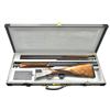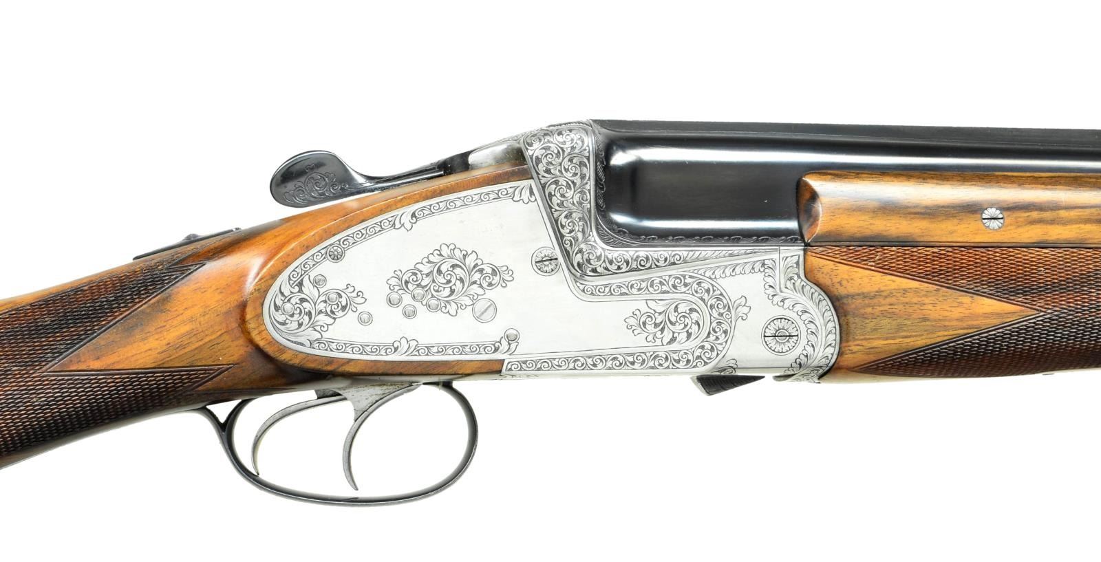 SHOTGUN WITH TWO SETS OF BBLS. AND CASE. Cal. 12 ga. 2 3/4". S# 2345.46.877. The 28" and 30" demibloc bbls. of Bohler Antinit steel are fitted with narrow ventilated ribs and are engraved "CONCO ARMS EMMAUS PA" on left sides of top bbls. Action and bbls. are stamped with Ferlach Nitro proofs for 2 3/4" chambers with a proof date of August 1977. Bottoms of bbls. are also engraved "MADE IN AUSTRIA". Actual maker's name cannot be found on bbls. or action, however action is stamped with Ferlach gunmaker number "46" (Josef Schonlieb). Coin finished double Kirsten sidelock O/U action features automatic safety ("S" inlaid in gold), raised rib tumbler end cocking indicators and double triggers (front articulated). Action and lockplates are engraved with about 60% coverage attractively cut shaded scroll with small scroll and acanthus borders. Fences are engraved with full coverage relief shaded scroll. Blued top lever and trigger guard are scroll engraved to match. Finely marbled and lightly fiddle figured European walnut straight grip buttstock measures 15" over black "Old English" rifle pad. Matching ejector forend with Deeley release services both bbl. sets. MEASUREMENTS: 28" BBLS: Bore Diameter: T .723", B .722". Restriction: T .020" (MOD), B .014" (LIGHT MOD). Min. Wall Thickness: T .023", B .022". 30" BBLS: Bore Diameter: T .723", B .723". Restriction: T .035" (FULL), B .034" (FULL). Min. Wall Thickness: T .021", B .023". STOCK: DAH: 2 13/16". DAC: 1 1/2". LOP: 15". CAST: neutral. WEIGHT 28" BBLS.: 7 lb. 4 oz.  WEIGHT 30" BBLS.: 7 lb 6 oz. UNATTACHED ACCESSORIES: gun comes in gray canvas leather trimmed case lined in gray velvet and has space for gun and both sets of bbls. CONDITION: very fine, close to "as new", appears essentially unfired with some scattered handling and assembly marks in metal and a few minor dings and scratches in wood, mostly on left side of butt. Bores are bright and shiny without noted problems. Action is tight. Ejectors are somewhat out of time. Case is fine, interior with some soiling and compressions. (22-5227/MGM). CURIO. $6,000-10,000.