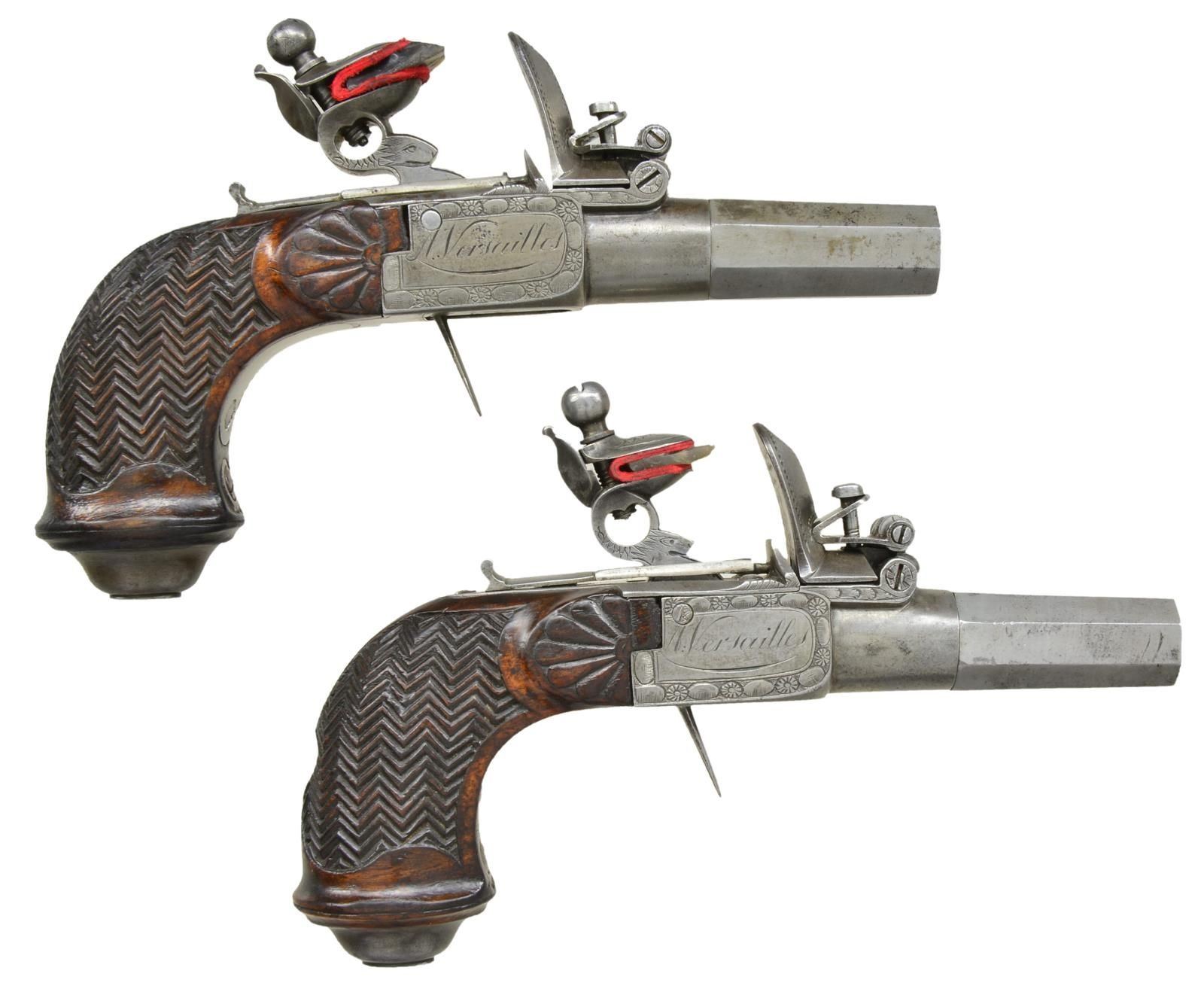 SCREW BARREL MUFF PISTOLS MARKED "MANUFACTURE A. VERSAILES". BOTH: Cal. 50. NSN. Pistols are marked "1" & "2" on 1 1/2" octagonal screwoff bbls. & on left sides of Belgian proofed boxlock central cock flintlock actions w/ tang safeties & folding triggers. Actions also feature reinforced cocks & frizzens w/ external springs & sliding safeties which also lock frizzens in closed position. Actions are very nicely engraved w/ borders of flowers & fruit surrounding "Manufacture" on left sides & "A. Versailes" on rights. Steel capped abrupt pistol grip stocks of European walnut have nicely carved zigzag "checkering" & carved shell motifs at side panels. Bottoms of gripcaps are engraved w/ ducks. When triggers are folded, it can be seen that bottoms of actions are engraved w/ squirrels. When cocked, the engraved heads of snakes(?) are visible at bottom fronts of cocks. CONDITION: good to very good, metal parts cleaned to silver gray w/ little noted pitting. Engraving remains sharp & clear. Stocks retain most of their original varnish finish w/ considerable darkening where finish is rubbed through. Bores are good, actions & frizzens work well. Bbls. turn a little bit past center when screwed tightly. A nicely appointed pair of sm. pistols. (01-21030, 01-21031/MGM). BOTH ANTIQUE. $3,500-5,000.