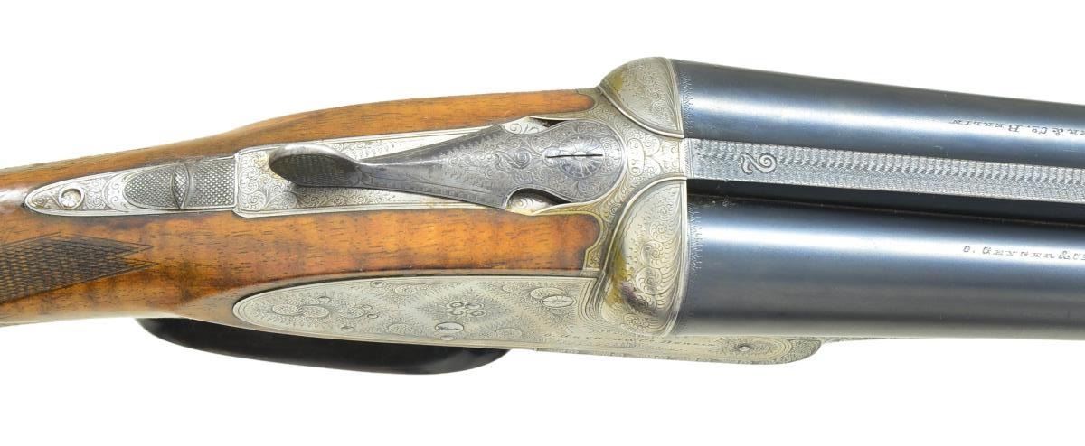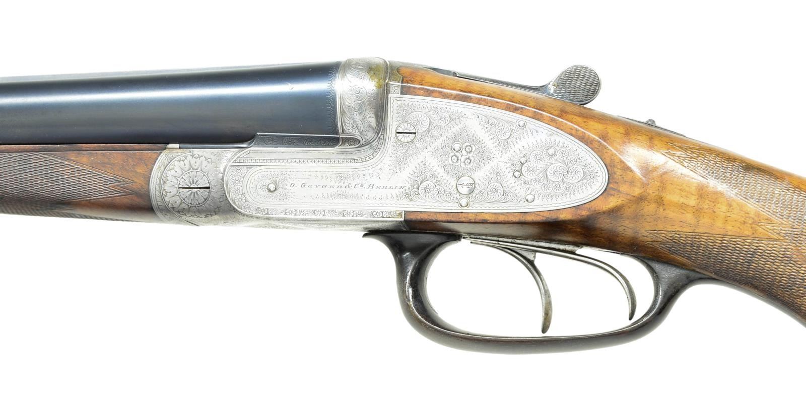 WITH PURDEY/BEESLEY SELF OPENING ACTION. Cal. 12 ga. 2 3/4". S# 10720. The 30" dovetailed bbls. are fitted with slightly raised flat matted rib engraved "2" at breech end; "2" also appears on top lever and forend iron, indicating this gun was the second gun of a pair. Retailer's name and address are engraved on tops of bbls. Bbl. flats are stamped with Imperial German Nitro proofs for 12 ga. without date. Coin finished sidelock action features non automatic safety ("SICHER" inlaid in gold), hidden third fastener, bushed strikers, arrowhead tumbler end cocking indicators and double triggers (front articulated). Interior inspections reveal locks are indeed of Purdey type and ejector system is also similar to the famous Wem ejector used on Purdey guns; drop is replacable. Action and lockplates are engraved with about 80% coverage nicely cut scroll surrounding small rose bouquets, all within small scroll, geometric and floral borders. "O. Geyger & Co. Berlin" is on each lockplate. Geyger number "2786" is on top of action in front of top lever. Trigger guard is horn. Horn capped pistol grip buttstock of well fiddle figured and nicely marbled European walnut measures 14 1/4" over solid brown basketweave "Pachmayr" pad. Stock features shadowline right hand cheekpiece, point pattern grip checkering and a sling loop matching the one screwed to bottom rib. Matching splinter ejector forend has Anson release. MEASUREMENTS: BBLS: Bore Diameter: R .720", L .720". Restriction: R .010" (IC), L .023" (MOD). Min. Wall Thickness: R .030", L .030". STOCK: DAH: 2 9/16. DAC: 1 1/2". LOP: 14 1/4". CAST: very slightly off. WEIGHT: 6 lb. 14 oz. CONDITION: very good as refinished, bbls. retaining about 90% reblue with some sharp edgewear and a few light marks. Action is cleaned to coin finish. Engraving remains good with traces of remaining case hardening color on floorplate and under toplever. Stocks retain nearly all of an oil refinish with a few scattered marks. Checkering shows considerable wear and has not been recut. Horn of trigger guard remains good without damage. Bores are bright and shiny with some leading in right bbl. Action is tight, bbls. are off face. Drop is good. Mechanically good. An interesting German gun, possibly actually built by Purdey. (22-4509/MGM). CURIO. $2,750-4,250.