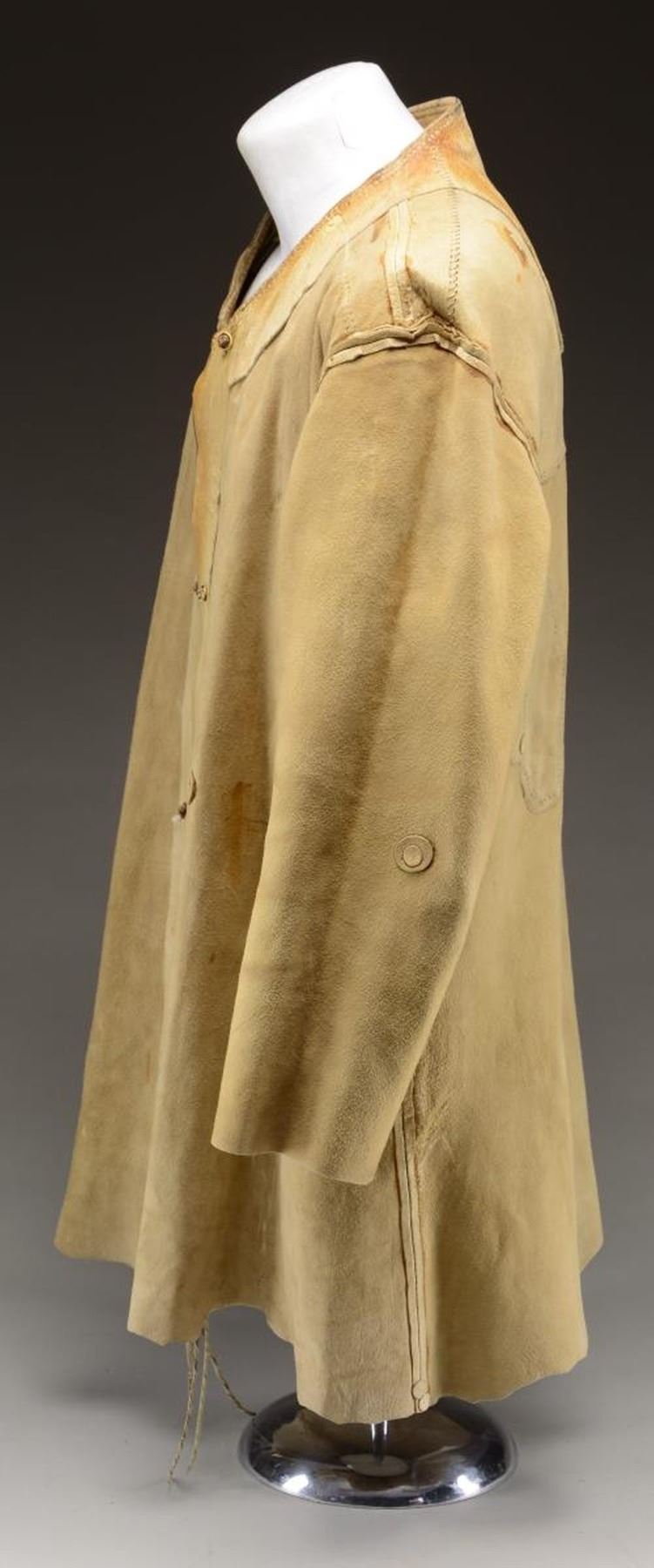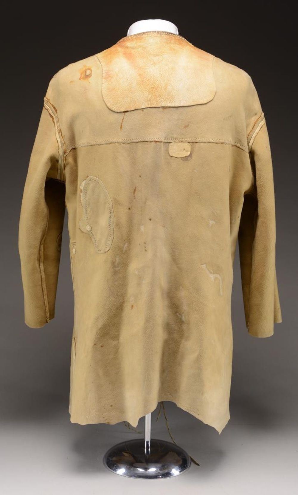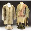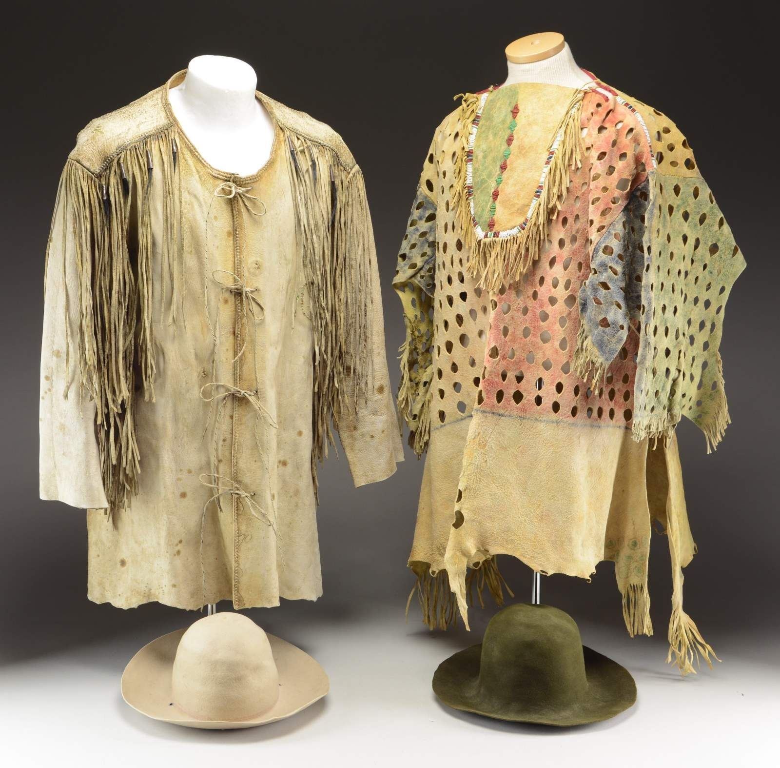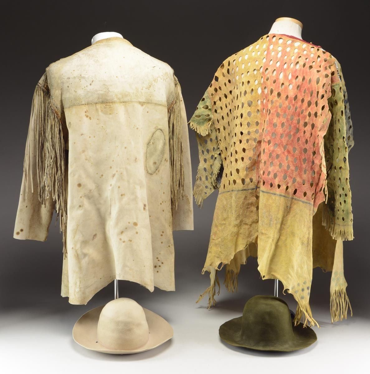 AND 2 FELT HATS. All pictured and described on page 178 in "THE FUR TRADE". Author Milton Von Damm: 1) FRONTIER LEATHER COAT. "1940's replica of a leather coat and a Blackfoot Indian war shirt of uncertain vintage, but probably circa 1890's." CONDITION: good overall. Leather coat has several sewn repairs internally. Has seen use. (02-22269/JS). 2) REPLICA INDIAN WAR SHIRT. "Leather was also used as a source for clothing, leggings, coats, moccasins and Indian war shirts. Moccasins were the most common footwear although some fort employees wore cheap military shoes. Some moccasins had high tops split at the front and wrapped with leather laces. They were called "solier de boeuf" or hide shoes." CONDITION: good overall. (02-22270/JS). 3) 2 FUR TRAPPER HATS. "The felt hat is a typical fur trade period style". CONDITION: good overall. PROVENANCE: Lifelong Collection of author Milton Von Damm. (02-22271/JS). $700-900.