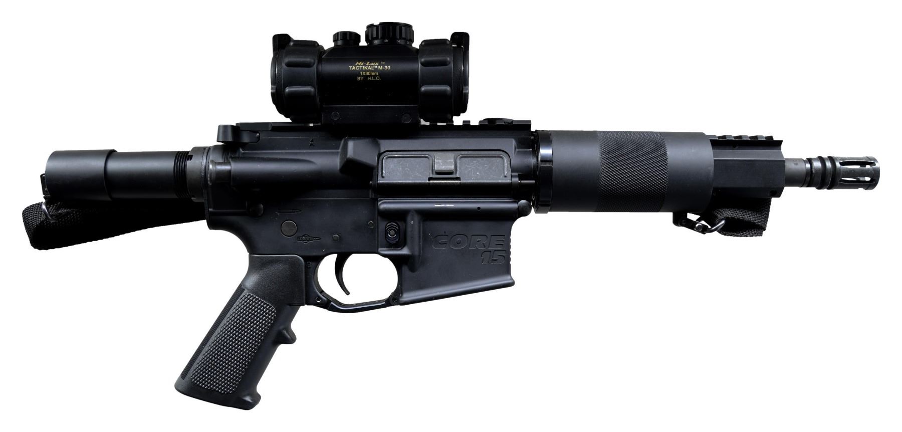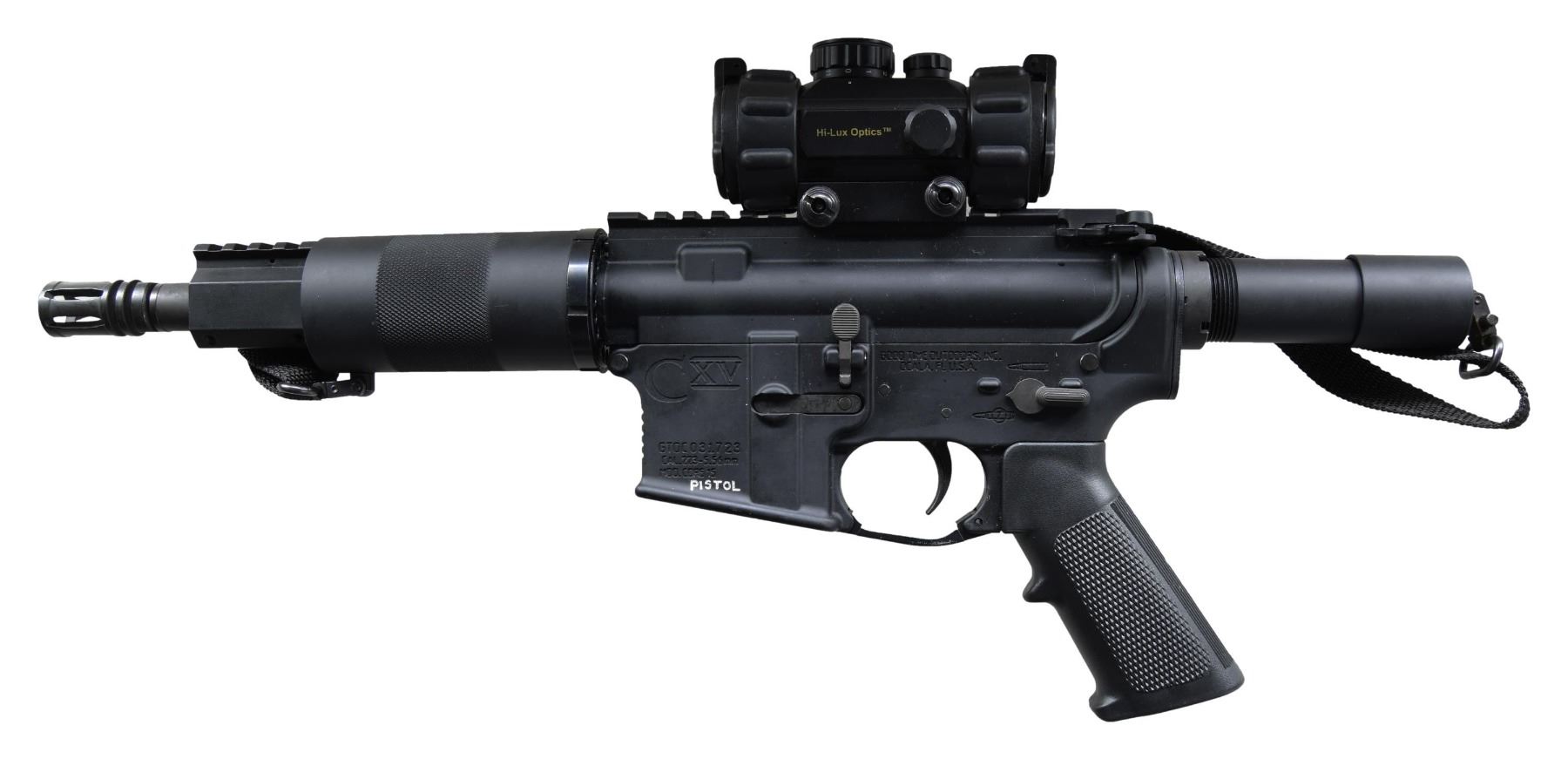 Cal. 7.69x39. S# GTOC031723. Bbl. 8.5" include bird cage flash hider; 1:10" twist. Gas block has accessory rail. Alloy round handguard with checkering in center & sling stud on bottom. M4 marked upper with Hi-Lux Optics Tactikal M-30 red dot optic on Picatinny rail. Left side of mag. well engraved "PISTOL" below maker's marks. Buffer system integrated with satin chrome bolt. Nylon sling on studs. MAGS: NONE. CONDITION: near excellent overall appearance showing minimal wear. Shiny bore with strong rifling. (25-2751/MD). MODERN. $300-500.