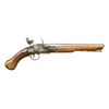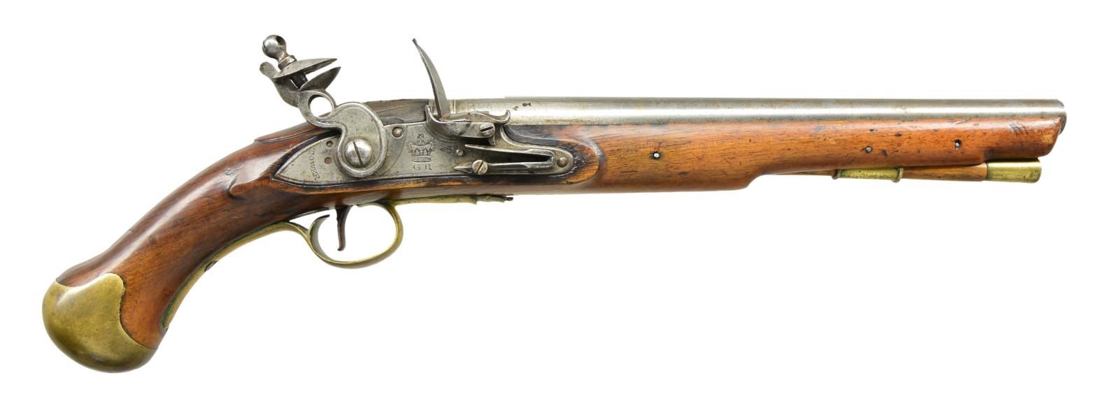 Cal. 56. NSN. The 12" tapered round barrel has British proofs at rear and ring turned breech end. India pattern lock with reinforced cock, rounded pan, bridled frizzen, and feather spring with spear finial has stamped crown over "GR" at center with broad arrow. "TOWER" is on tail. European walnut stock with beavertail around barrel tang is pinned to barrel and brass mounted. Trigger guard has small husk finial, brass sideplate with scroll tail is afixed with 7" steel belt hook. Oak ramrod with brass tip mounts through beaded brass pipe and simple hole in stock. CONDITION: fine to very fine. Iron parts show some cleaning to silver over scattered pitting. Stock is quite good with inspectors markings fairly clear. A 1/2" x 1" chip is behind barrel tang. Brass, once cleaned and lacquered is toning to mustard. Shiny bore with scattered pitting, mechanically good. (01-21817/MGM). ANTIQUE. $2,000-3,000.