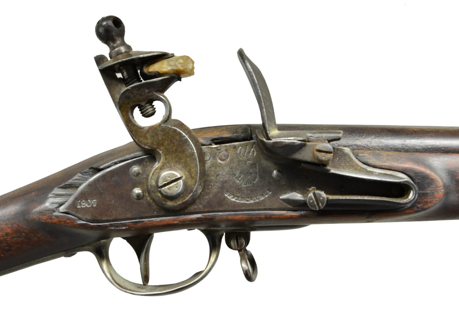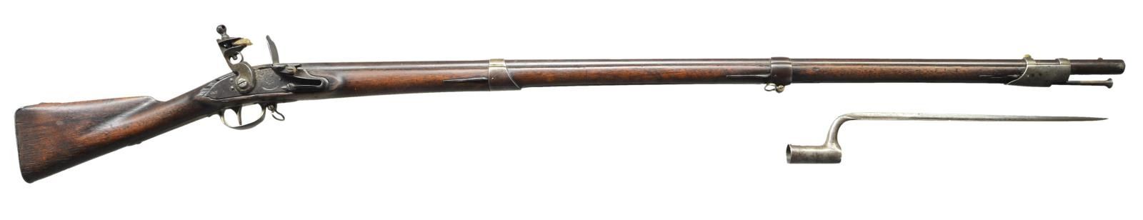 DATED 1807 WITH BAYONET. Cal. 69. NSN. The 44 3/4" barrel attaches with three spring retained bands, has "P" eagle head and "V" proofs at rear and is undated. Lock with flat plate having pointed tail is fitted with chamfered cock with straight spur, inset rounded pan, frizzen with straight toe, and feather spring with spear finial. Center of lock is marked "US" eagle and "SPRINGFIELD" in arch. Tail of lock is dated 1807 horizontally. Walnut stock has fluted comb and is iron mounted. Buttplate is dated 1807, trigger guard has rounded ends, sling loops are attached by screws. Brass collection tag stamped "M8" is attached to rear sling loop. UNATTACHED ACCESSORIES: musket is accompanied by correct style socket bayonet with 15" triangular blade stamped "US". CONDITION: good. Original flint, barrel is mostly smooth brown patina with some light cleaning marks. Lock matches patina well and marks are quite clear. Lock is in original flint configuration. Internal inspection reveals matching assembly marks on all parts including pan. Cock is a possible correct replacement as color does not quite match nor do assembly marks. Frizzen is most certainly a replacement and shows considerable wear and completely different patina. Its replacement screw is artificially aged and has assembly marks matching remainder of lock. Interior of lockplate is stamped with "C" in a star. Stock shows old refinish and illegible inspectors mark behind trigger guard tang. Stock appears sound except for 6" stress crack at bottom in front of trigger guard and a good sized chip at top rear of lockplate. Patina on iron parts matches well except for front band which shows cleaning. A correct style ramrod is present. Bayonet shows considerable cleaning and wear. Bore is good, somewhat pitted. Lock is operable but slip hammered. (01-22768/MGM). ANTIQUE. $3,000-4,000.