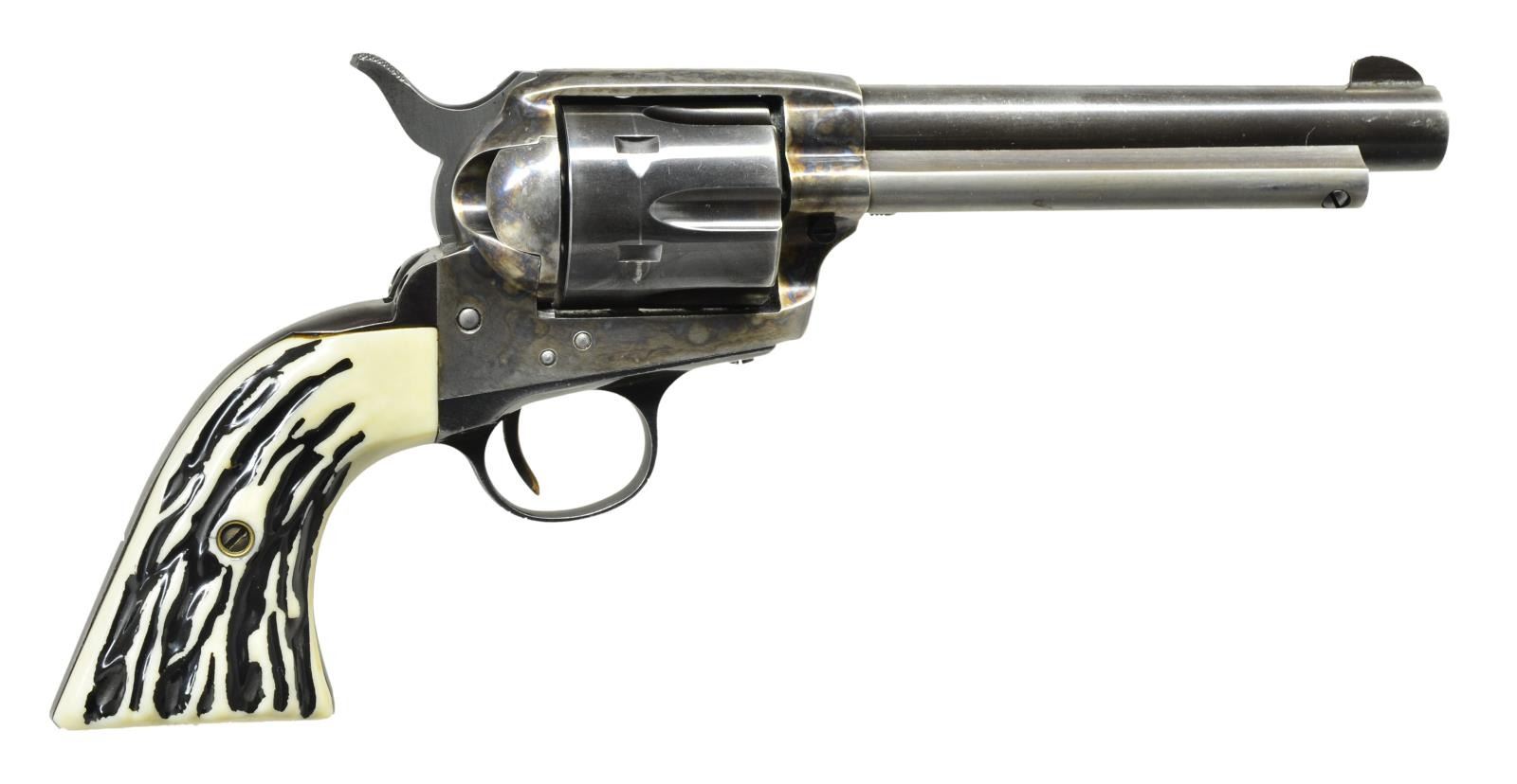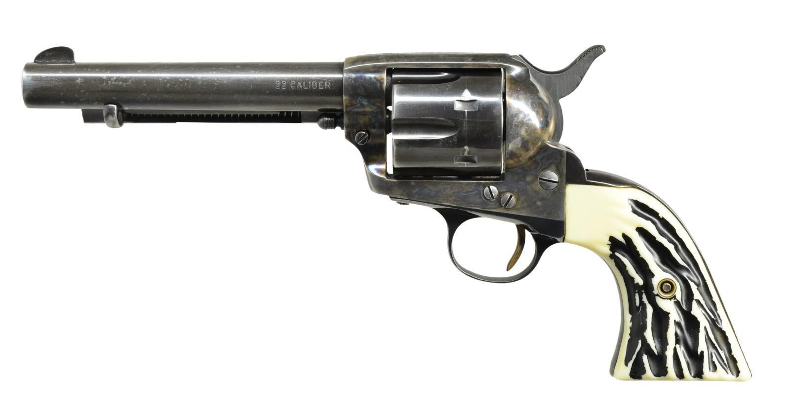 Cal. 22 LR. S# GW11296. Bbl. 5 1/2" w/ blade front sight & corresponding frame notched rear. Mfg. 1954-1964 w/ very notable production history initiated by Colt ceasing to produce its SAA in 1940. Void of SAA revolvers was filled by Ruger & Great Western Arms along w/ some foreign imports. Immense popularity of TV Westerns contributed to consumer demand for SAAs. GWA produced almost exact copies of popular Colt w/ main difference being firing pin in frame rather than on hammer. Most like this one had simulated stag grips that were also popular in Westerns. Various bbl. lengths plus usually blued w/ case colored frames & loading gates like this example. GWA products used in most Westerns & in once popular sport of fast draw competition; also popularized by Westerns. So popular were GWAs that they were even offered in kit form. Deluxe engraved versions & nickel plating w/ special grips were also available. John Wayne was notable owner & user of GWA revs. as were stars of many Westerns. Noticeably hefty revolver because of its sm. cal. & standard size. CONDITION: good to very good general appearance w/ holster like high point wear, slight cyl. turn line & very little finish on outside curve of ejector housing. Rich deep case colors on frame & loading gate. Very good to excellent grips & near excellent bore. PROVENANCE: Collection of Alan Bradley Shepherd. (21-3434/NW). CURIO. $700-1,000.