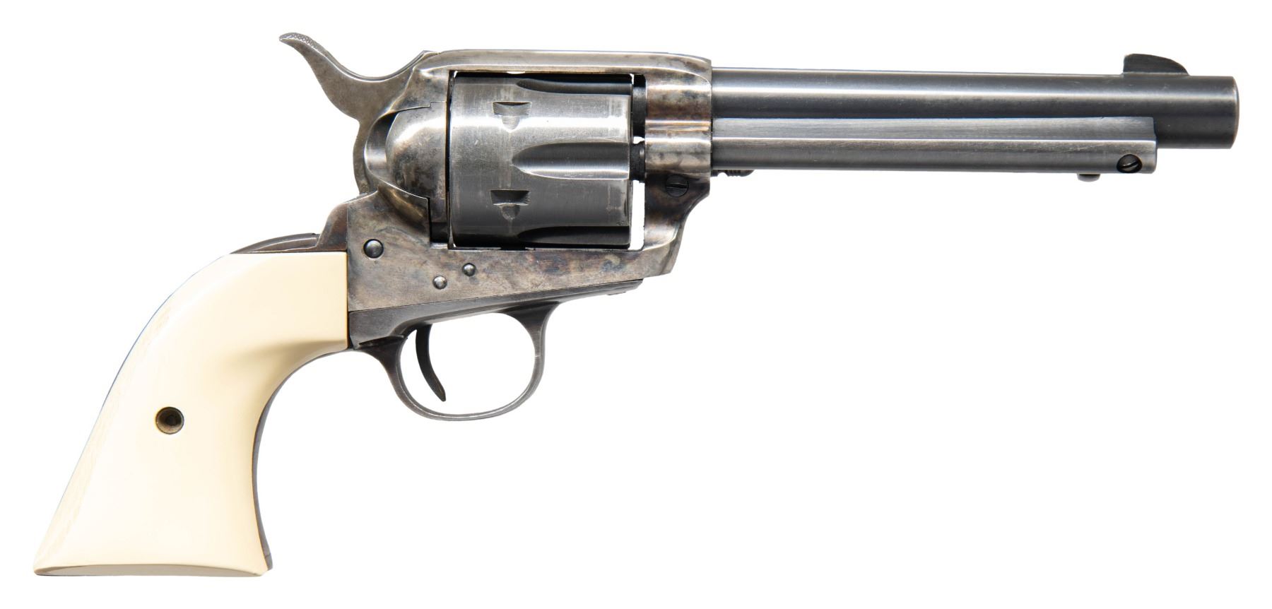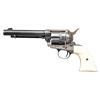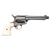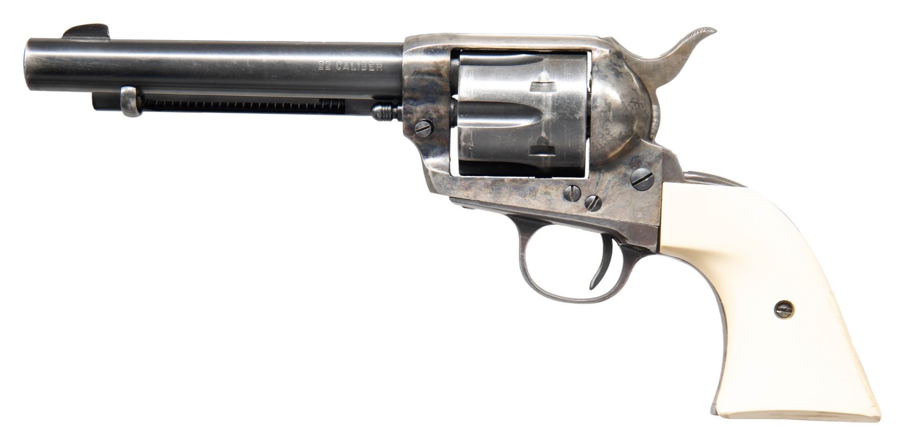 Cal. 22 LR. S# GW5064. Bbl. 5 1/2". Blade front sight. Fixed rear sight. SAA style rimfire revolver. Case colored frame & loading gate. Balance of other parts are blued. Smooth white colored grips. CONDITION: grips show some light handling wear. Case colored parts show some oxidation staining & light fading. Balance of metal retains 50-60% bluing with some light oxidation, scattered heavy fading to gray, a drag line on cyl. & scattered edge wear. Action appears tuned but functions properly when hand cycled. Poor worn bore with shallow rifling. (25-4916/MJC). MODERN. $300-500.