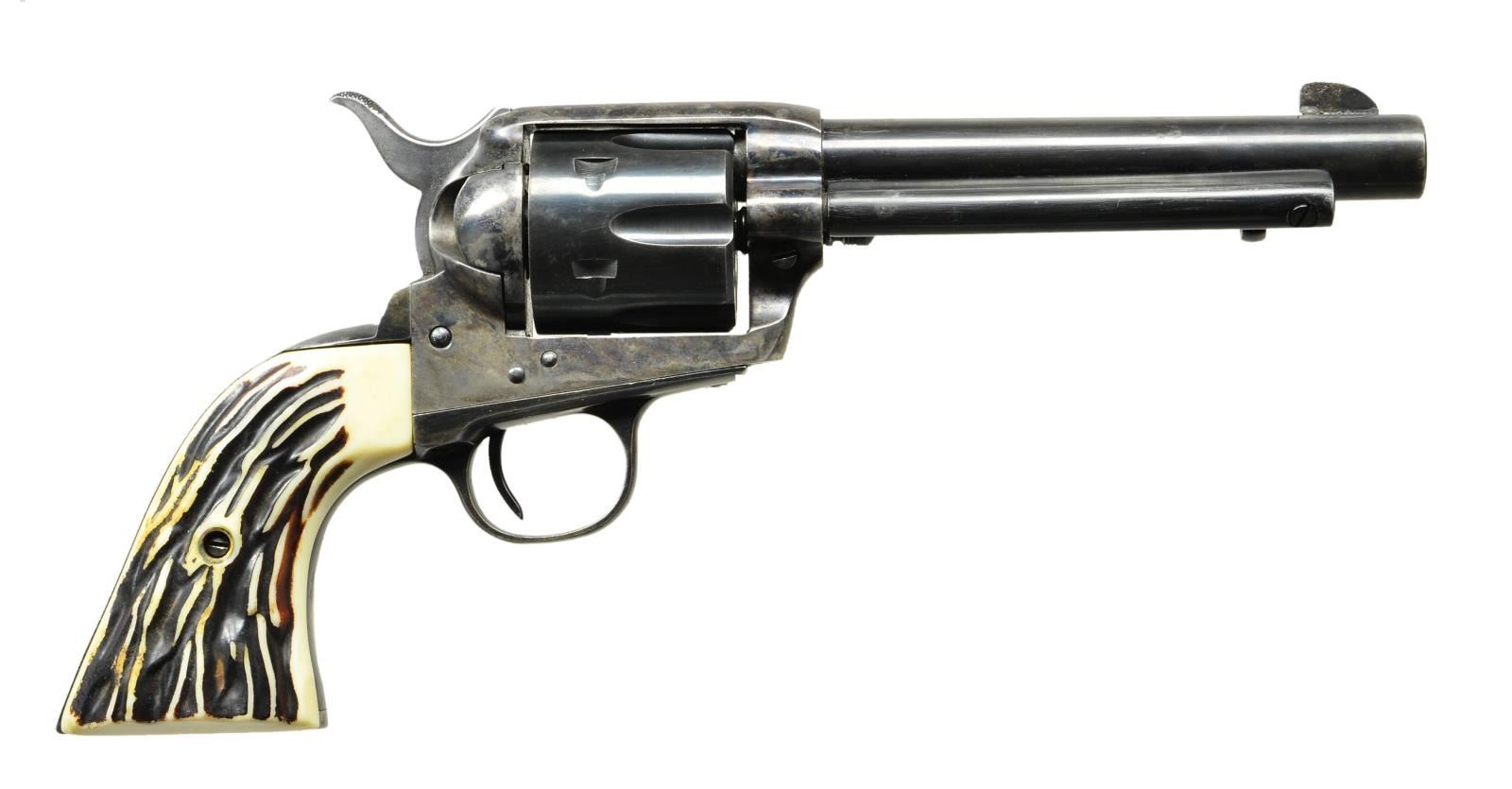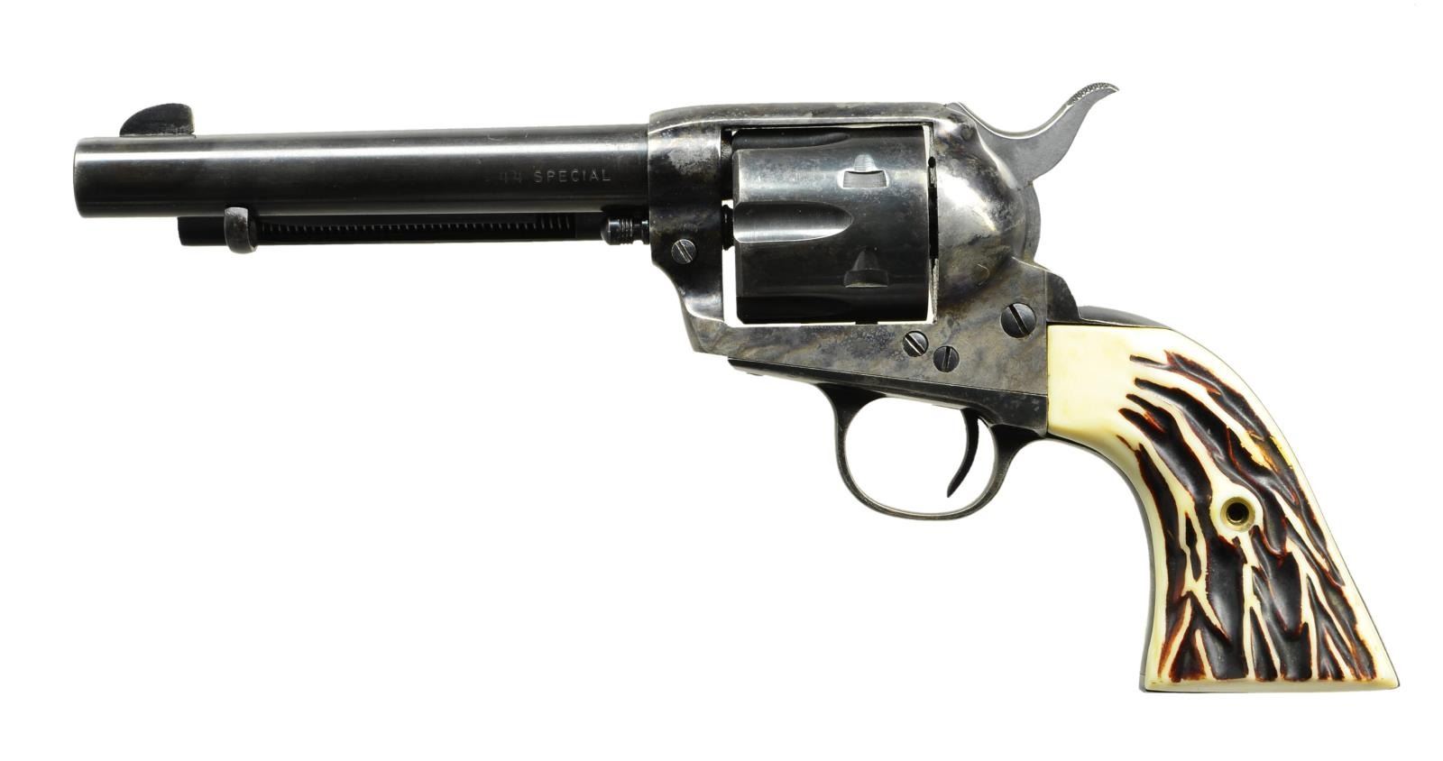 Cal.44 Spl. S# GW4610. Bbl.5.5". Manufactured 1954-1964. Single action revolver w/ 6-shot fluted cylinder. Blued barrel & cylinder. Case colored frame. Blade front & notch rear sights. Checkered hammer spur. Faux stag grips. CONDITION: Bluing retains complete & consistent finish w/ some light thinning noticeable under close examination. Butt has a very gentle amount of patina. Grips are solid and free from any damage w/ only a bit of staining on right side. Bore is bright w/ strong rifling. (22-6075/JZ). CURIO. $500-800.