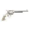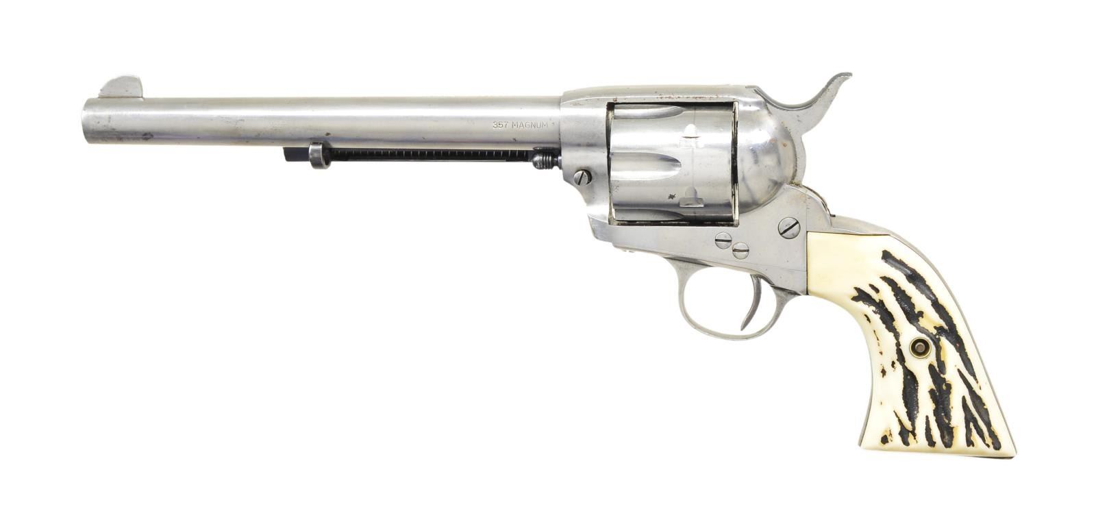 Cal.357 Mag. S# GW020702. Bbl.7.5". Manufactured 1954-1964. Single action revolver w/ 6-shot fluted cylinder. Unfinished, aside from blued ejector housing, hammer & trigger. Blade front & notch rear sights. Checkered hammer spur. Faux stag grips. CONDITION: Aside from the ejector rod casing, the hammer & trigger, this revolver is void of any finish, which was often added after assembly. Bare steel is remarkably clean, for being unfinished, w/ just a slight patina freckling. Grips are solid and free from any noticeable damage. Cylinder timing should be addressed as it is uniformly short. Bore is bright w/ strong rifling. (22-6081/JZ). CURIO. $400-700.