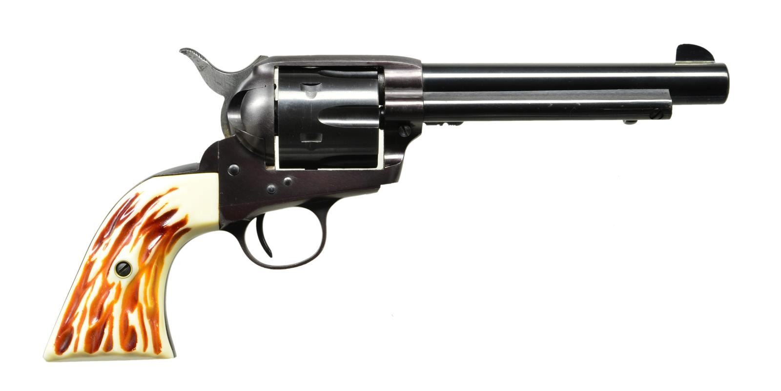 Cal.38 Spl. S# 13857. Bbl.5.75". Manufactured 1954-1964. Single action revolver w/ 6-shot fluted cylinder. Blued finish. Blade front & notch rear sights. Checkered hammer spur. Faux stag grips. CONDITION: Bluing retains complete & consistent finish w/ some light thinning on a few high spots. Grips are solid and free from any noticeable damage. Bore is bright w/ strong rifling. (22-6074/JZ). CURIO. $500-800.