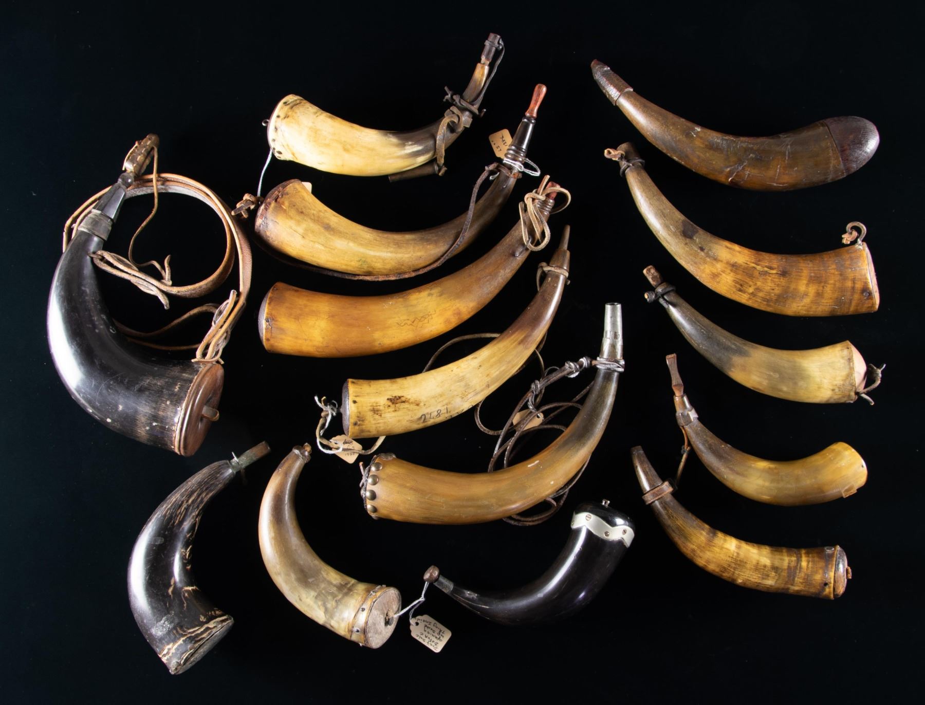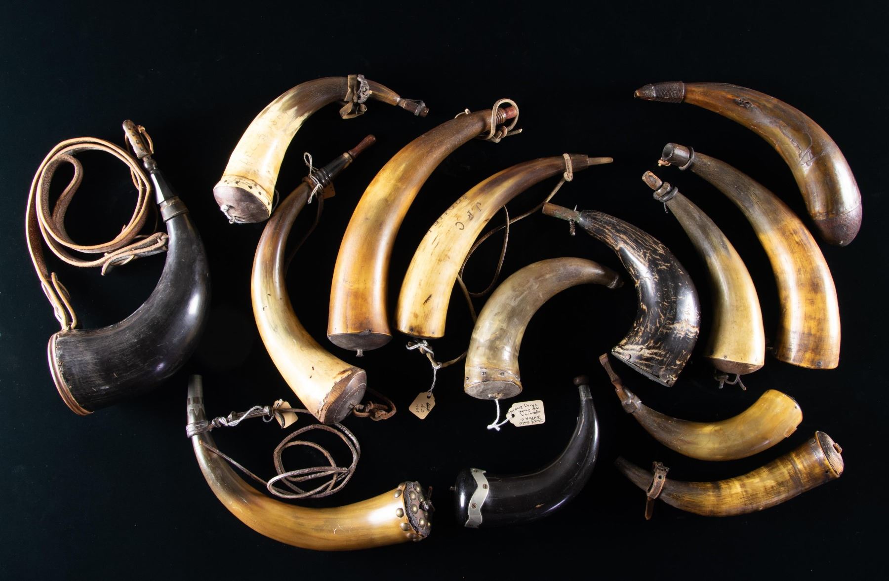 GROUP OF 14 VINTAGE POWDER HORNS.