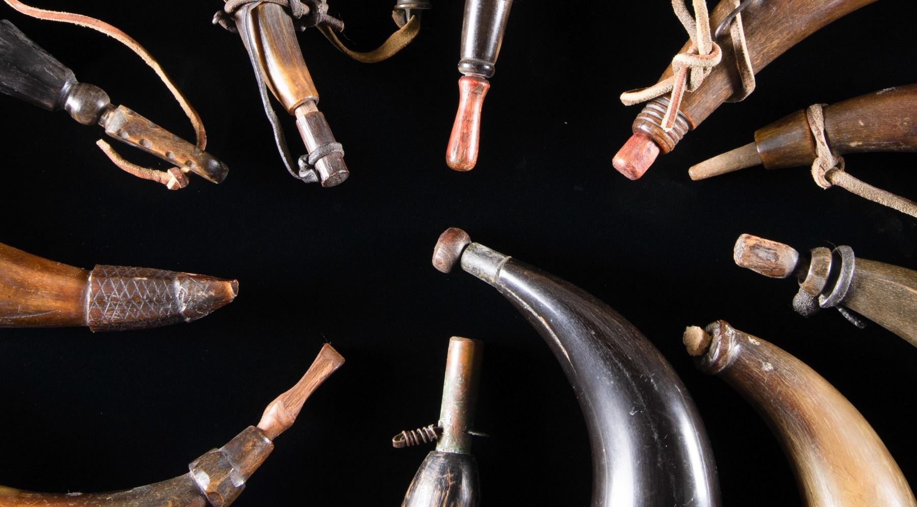 Ranging in size from 7" to 11", two are dated with scant carving, several have stoppers, old collection tags. CONDITION: good overall. PROVENANCE: The Esteemed Norm Greenberg Collection. (02-24847-15/JS). NON-GUN. $600-900.