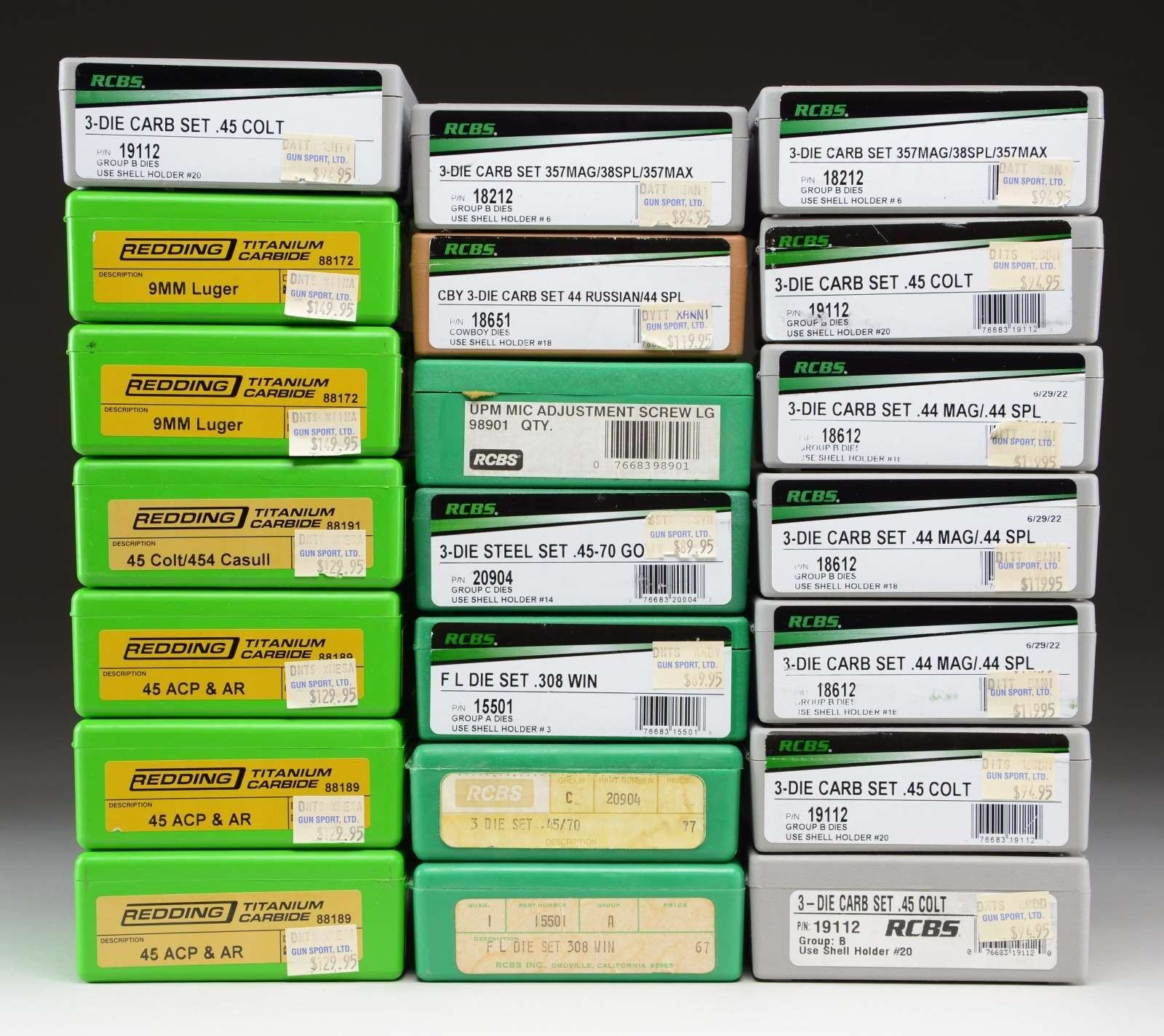 This grouping includes the following: (2) Redding 9mm Luger sets #88172, (2) RCBS 3-die carb sets 357 Mag #18212, (3) RCBS 3-die carb sets 44 Mag / 44 Spl #18612, (1) RCBS CBY 3-die carb set 44 Russian / 44 Spl #18651, (4) RCBS 3-die carb sets 45 Colt #19112, (1) Redding 45 Colt / 454 Casull #88191, (3) Redding 45 ACP #88189, (2) RCBS 3-die steel set 45-70 Govt #20904, & (2) RCBS 308 Win #15501. CONDITION: All are in factory packaging. Some are new & like new condition while others are used. Some may have shell holders included. Plastic cases span from like new, to reflecting some shop / shelf wear. PROVENANCE: The Collection of Gun Sport Ltd owned by Jon R. Thomas. (02-20870-10/JZ) $500-800.