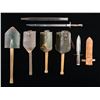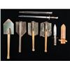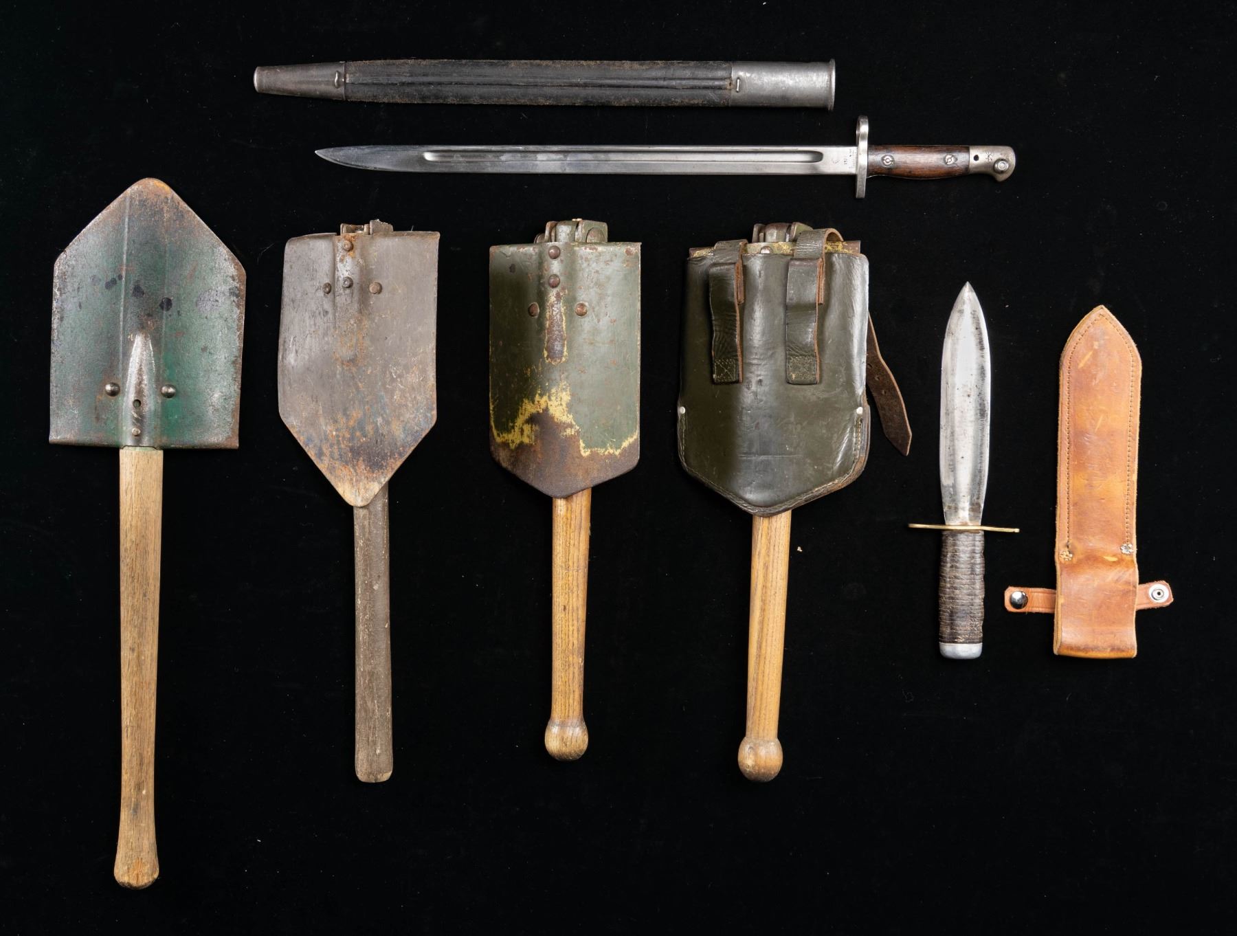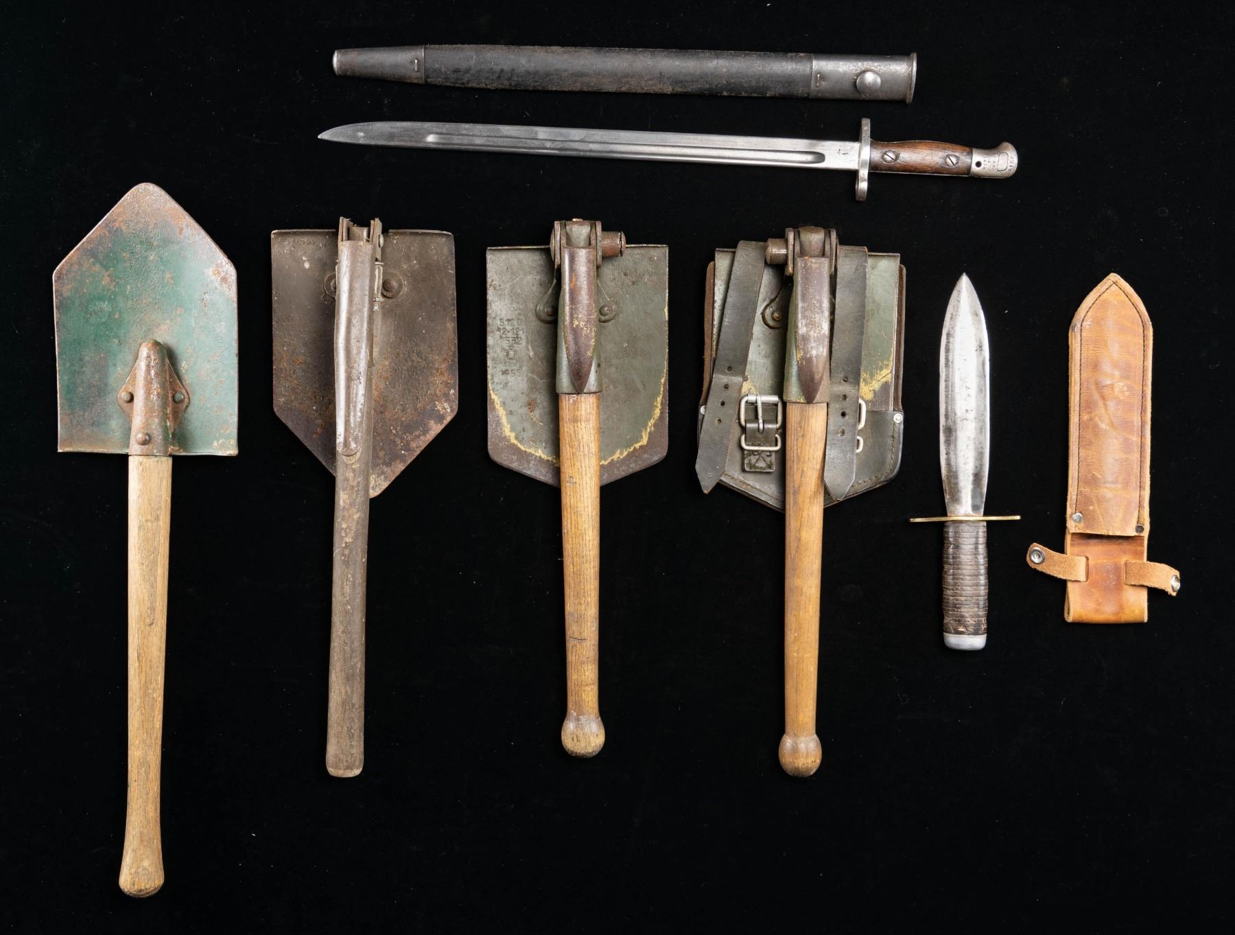 THEATER KNIFE AND ENTRENCHING TOOLS. 1) Model 1907 Lee-Enfield Bayonet. 17" fullered blade. 21 3/4" overall. Blade is marked on left ricasso with crown over "1907 / SANDERSON". Right ricasso has broad arrow and faint view marks. Pommel is marked on the right side "E318 RAF 1 4434" and marked on left side with "Opposed from service" marking. Straight cross-guard with smooth walnut grips. Scabbard with steel tip and throat. CONDITION: worn bayonet has been sharpened and is returning to patina from having been cleaned. Scabbard has wear and scuffing, but is in good serviceable condition. 2) Theater Knife. Has a coarsely ground 7 5/8" double-edged blade. 11 3/4" overall. Knife is unmarked with straight brass crossguard. Stacked brown leather washer handle. Aluminum buttcap is retained by two allen-head screws. Brown leather scabbard with retaining strap is unmarked. CONDITION: knife shows extensive wear, grind marks and scuffing. Sheath has wear and scuffing, stitching and rivets remain tight. 3) Entrenching tool resembling the modified M43 tool described on page 169 of "782 Gear by Glenn". Tool was modified to be non-folding and metal retains 50% of its green Marine Corps type paint. Handle is well-worn and slightly loose. 4) West German entrenching tool dated 1966 with folding pick. Complete with leather shovel carrier. CONDITION: carrier and tool show extensive use with wear, but remain in good serviceable condition. 5) West German folding entrenching tool with pick dated 1965. CONDITION: tool in well-worn, but serviceable condition. 6) Unmarked entrenching tool with folding pick and wooden handle. Tool resembled U.S. issue. Tool has wear, oxidation and loose joints. (02-25738-1/RW). NON-GUN. $300-500