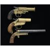 WEBLEY PLUS WWI GERMAN STANTIEN & BECKER. 1) REMINGTON MK III FLARE GUN. Cal. 10 ga. S# 15-843. Bbl. 9" steel, smooth bore. No sights are fitted. Bbl. is marked on top enhanced in white "MARK III THE REMINGTON ARMS - UNION METALLIC CARTRIDGE CO. INC." / "REMINGTON BRIDGEPORT WORKS BRIDGEPORT CONNECTICUT USA". Brass frame, stud trigger & smooth walnut grips. CONDITION: blue bbl. is turning patina w/ light oxidation & light wear. Frame has pleasing dark patina w/ light wear & handling marks. Grips have light wear & scattered handling marks. Bore is dark w/ fine pitting throughout. (23-116/RW). CURIO. 2) WEBLEY MARK III FLARE GUN. Cal. 4 ga. S# 32279. Bbl. 4 1/16" brass bbl. & frame w/ smooth bore. Marked on left rear w/ crown "GR" proof. " '16" broad arrow crown "68". Left side of frame is marked "WEBLEY & SCOTT LTD." / "LONDON & BIRMINGHAM III" marked as on bbl. Right side of frame marked w/ Webley & Scott winged bullet logo. Smooth walnut grips. Lanyard ring in butt. CONDITION: brass is turning a pleasing overall patina w/ wear & scattered handling marks. Steel parts are turning gray & patina. Grips are well worn w/ missing chips on both sides at bottom & crack on left grip extending downward 1 1/2". Bore is turning dark. (02-18717/RW). 3) WWI STANTIEN & BECKER GERMAN FLARE PISTOL. Cal. 25mm. S# 1300. Bbl. 5 1/4" octagon to rnd. w/ a flared muzzle approx. 1 3/4" in diameter. Bbl. lug is marked at bottom "G". Frame is marked on bottom of grip "ST & B 14". Hardwood grips. CONDITION: grips have been repaired on both sides at butt. Left grip has lg. missing chip at top. Grips have notable wear w/ arsenal refinish. Mainspring is broken. Brass frame & bbl. have pleasing patina w/ wear & handling marks. Steel parts w/ oxidation & pitting. Have cleaned appearance. Bore has dark oxidized appearance. (02-18717/RW). PROVENANCE: from the Lifelong Collection of Glen E. Mattox. $500-700.