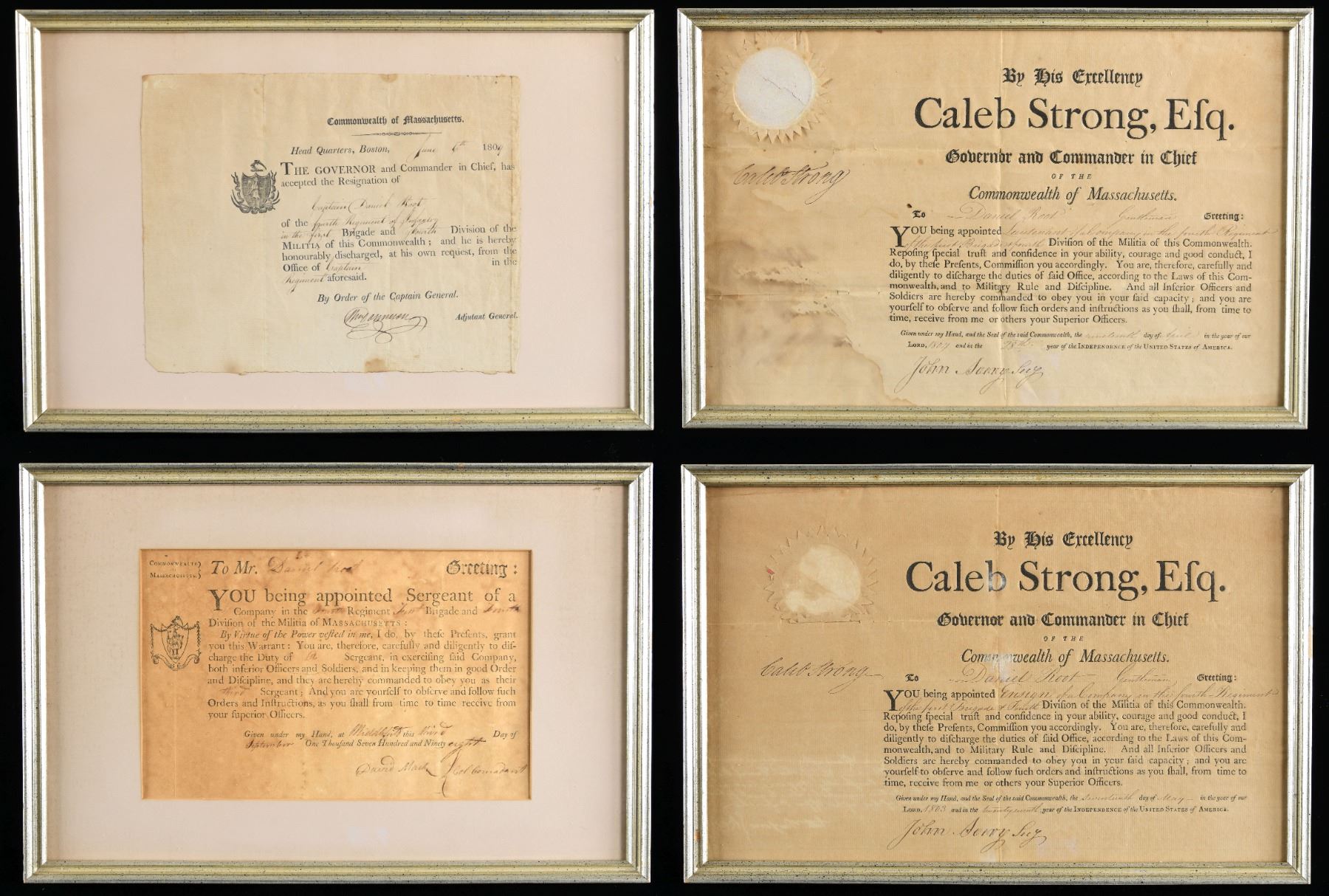 APPOINTMENTS. Daniel Root entered service in 1798 as 3rd sergeant, appointed ensign in 1803, lieutenant 1804, and resigned as captain 1809. 2 documents signed by Massachusetts governor Caleb Strong. Attractive set in identical frames 16"x10.5". CONDITION: not removed from frames, all easily read, water stains on 1804 document, yellowed paper. (02-23996/JS). $400-600.