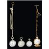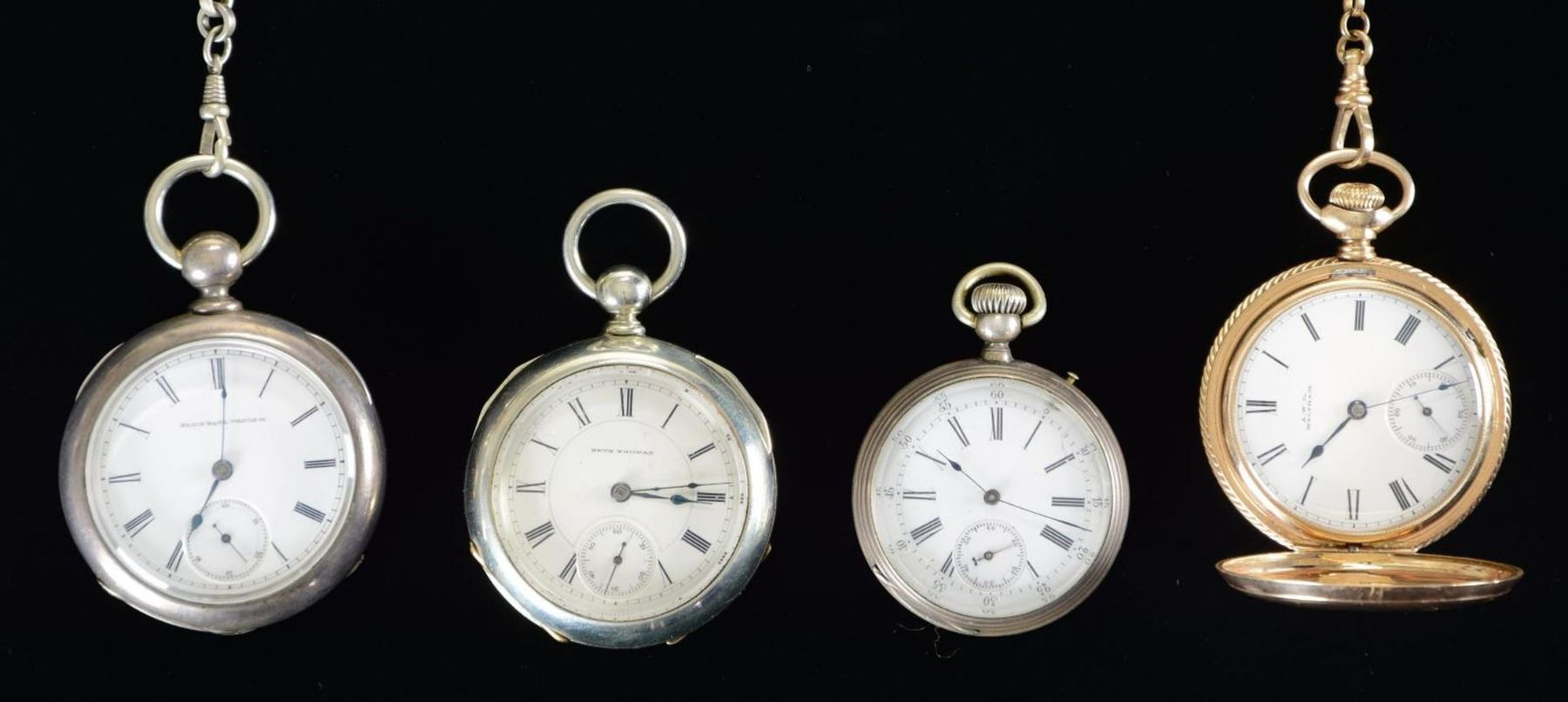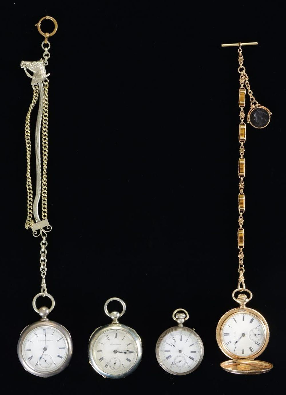 CENTURY. 1) Pocket watch produced by American Waltham Co. of Waltham, MA circa 1884. 14 Karat gold construction w/ Roman numeral face & fire blued second, minute, & hour hands. Serial number 2495984. Movement number 512639. Exterior engraved w/ foliate designs and a bird on one side w/ matching engraving on the opposite side, also including a small scene of a building w/ a steeple. Gold chain w/ decorative tiger's eye stones & glass impressed side portrait in the Roman style. CONDITION: exterior exhibits mild superficial marks from handling & storage, but otherwise presents nicely. Interior of action side exhibits a small spot of tarnishing, but is otherwise very good overall. Watch action runs appropriately. 2) Pocket watch produced by Elgin National Watch Co. Coin silver construction w/ faded floral pattern engraving on rear. Interior of rear retains a black & white photograph of a woman w/ various numbers scratched into the surface. Lightly embellished chain w/ decorative bridled horse head at top. Key-wound action. CONDITION: metal components exhibit a pleasing mellow gray patina overall, exhibiting light superficial marks from storage & handling. Key is not present and action cannot be tested. 3) Model 4 pocket watch produced by Seth Thomas of Thomaston, CT circa 1890. "Silveroid" nickel alloy construction. Serial number 54074. Key-wound action. CONDITION: exterior exhibits superficial marks from handling & storage, but otherwise presents nicely. Watch face exhibits some losses around the exterior edges, but otherwise remains sturdy & serviceable. Key is not present and action cannot be tested. 4) Unknown mfg. pocket watch marked "REMONTOIR/ ANCRE LIGNE DRIOTE/ 15/ RUBIS" on interior of rear panel. Coin silver construction. Exterior of rear panel exhibits crosshatched engraving w/ a floral motif at the center. CONDITION: exterior exhibits a dull gray patina w/ some spots of darker discoloration. Rear panel exhibits several dents & dings. Action functions appropriately when wound. PROVENANCE: from the Lifelong Collection of Glen E. Mattox. (02-18725/MLW). $200-400.