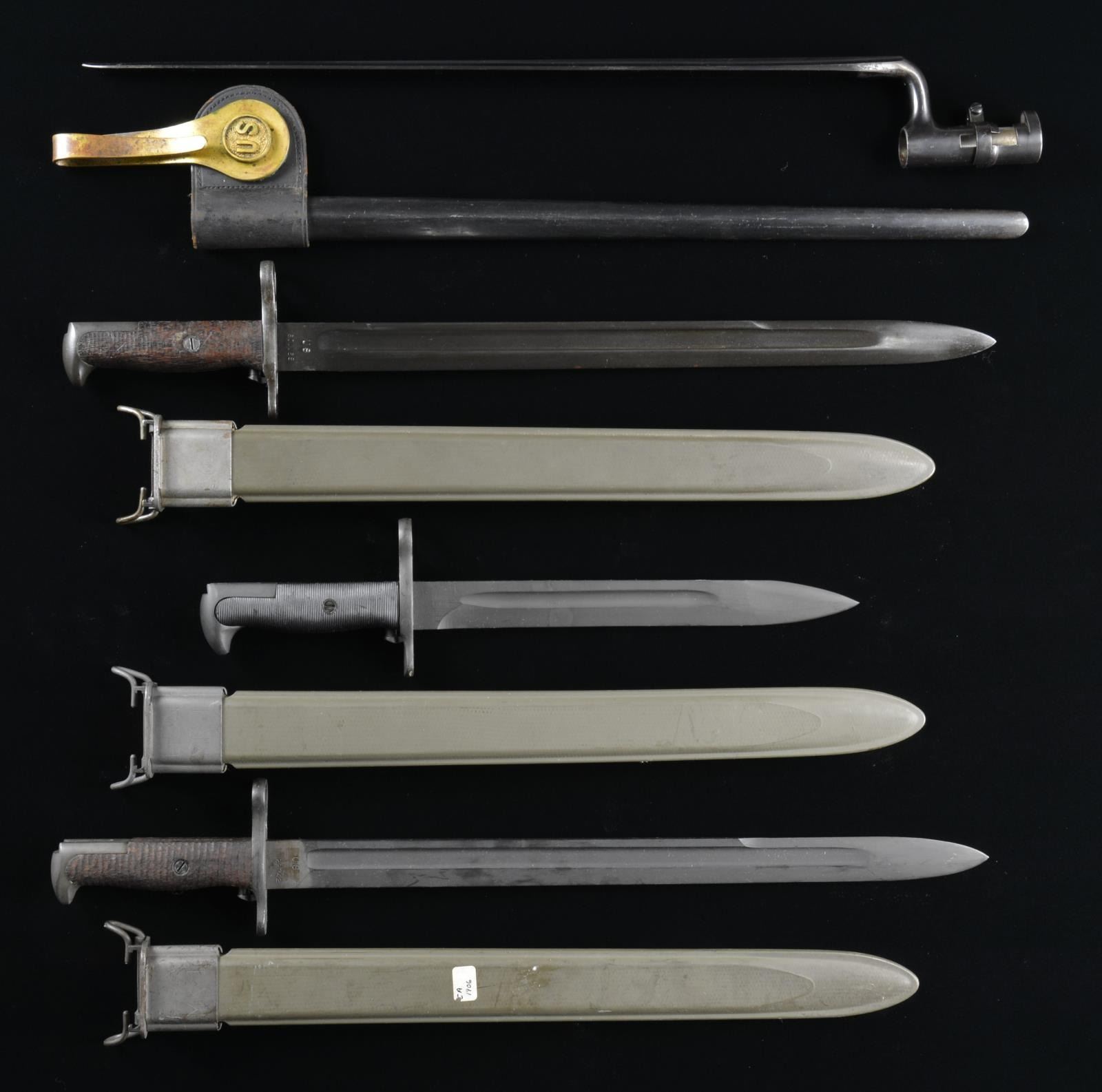 3) MODEL 1903 BAYONET. 16" Blade marked on left ricasso w/ "SA" "flaming bomb" "1914". Marked on right ricasso w/ "U.S." & S#. Rough turned walnut grips. Plastic scabbard marked on steel throat "U.S. in flaming bomb". CONDITION: bayonet has arsenal rework type dark parkerized finish w/ light wear & scuffing. Scabbard is in good lightly worn condition.