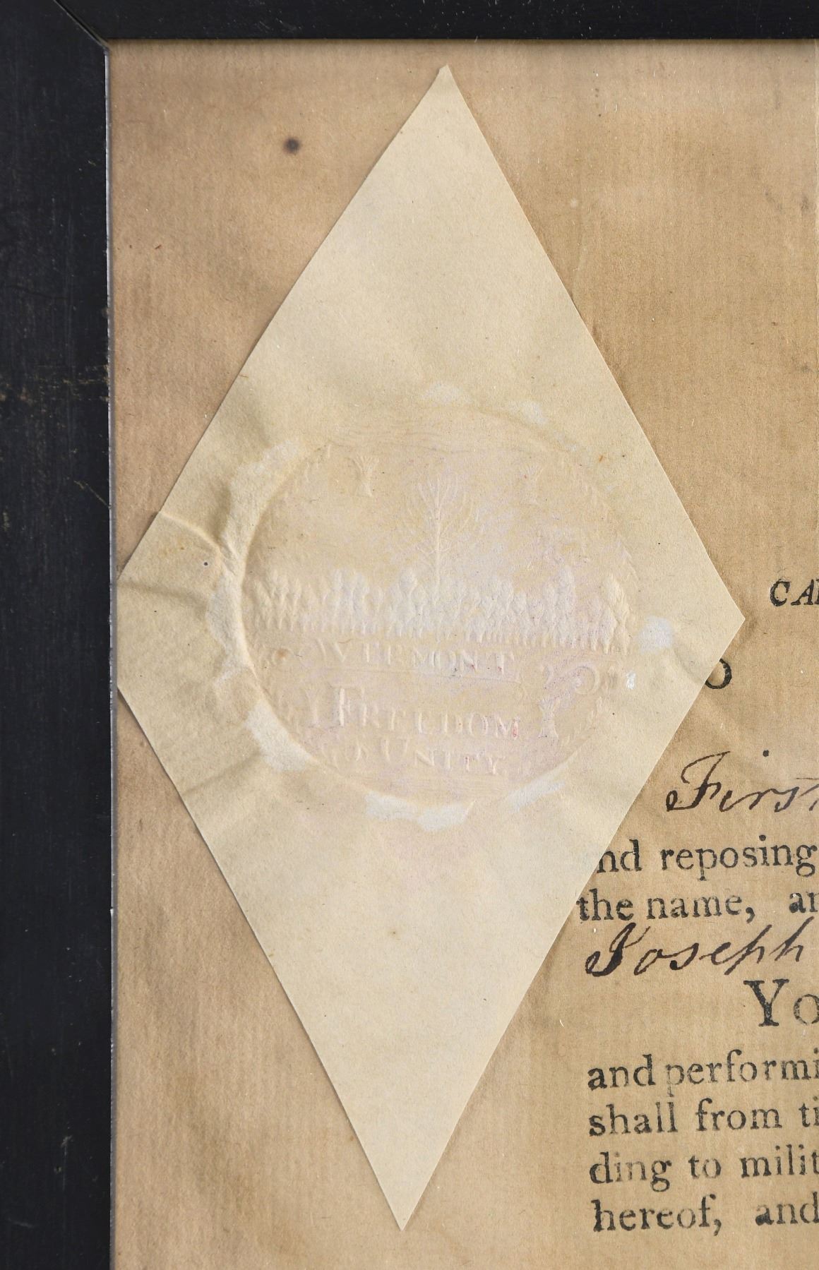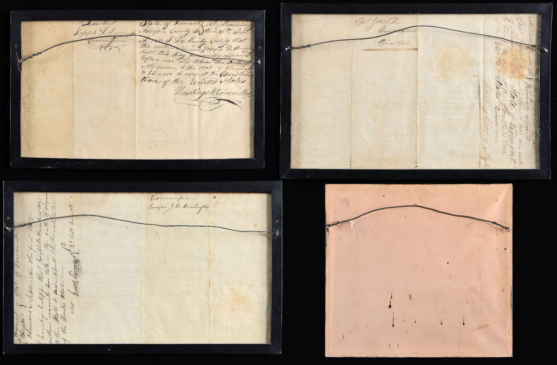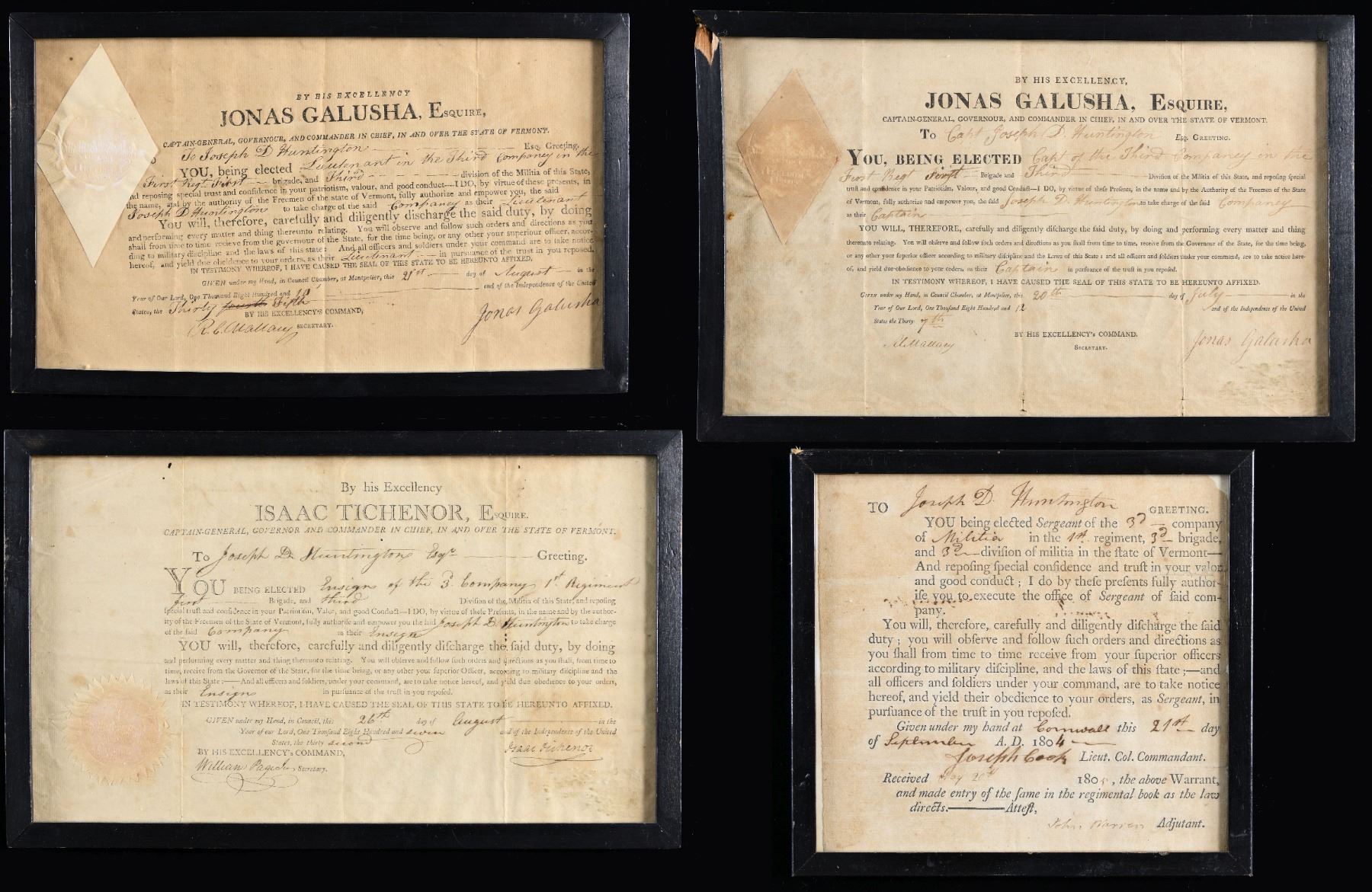 MILITARY APPOINTMENTS. Joseph D. Huntington (1778-1862) entered service in 1804 as sergeant, appointed ensign in 1807, lieutenant 1811, and captain 1812. The last 3 signed by Vermont governors Isaac Tichenor & Jonas Galusha. He served in the 1st regiment, 1st brigade, 3rd division of Vermont militia. Attractive set of 4. CONDITION: good to very good overall, 3 framed between 2 pieces of glass. 1804 document is 8"x8", other 3 governor signed are 12"x8". (02-23997/JS). $700-900.