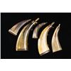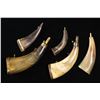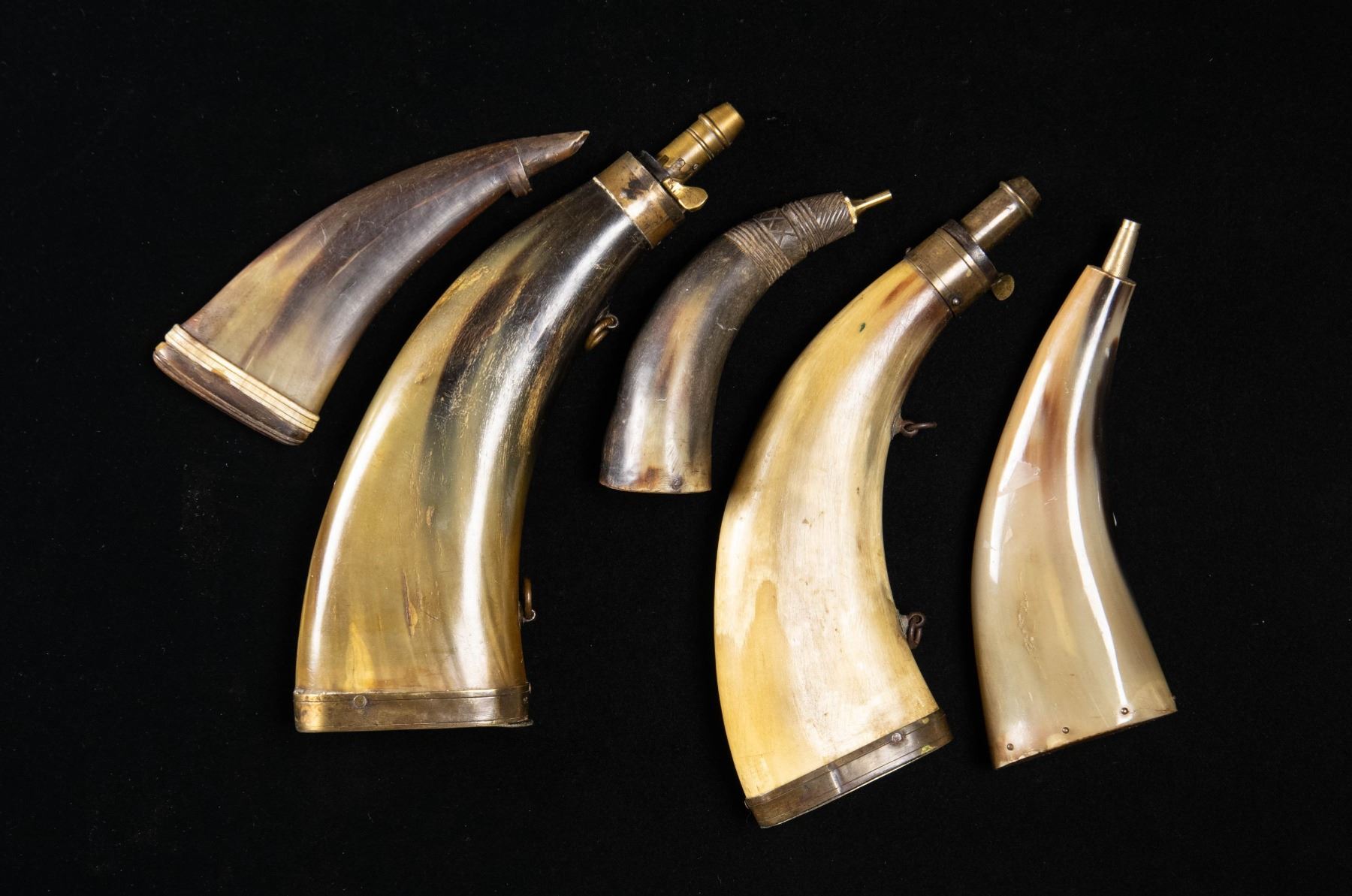 HORNS. Ranging from 6" to 8", variant construction, 2 have brass butt caps & chargers. CONDITION: 3 are good to very good overall, other 2 have reproduction charger parts. (02-25916/JS). NON-GUN. $300-400.